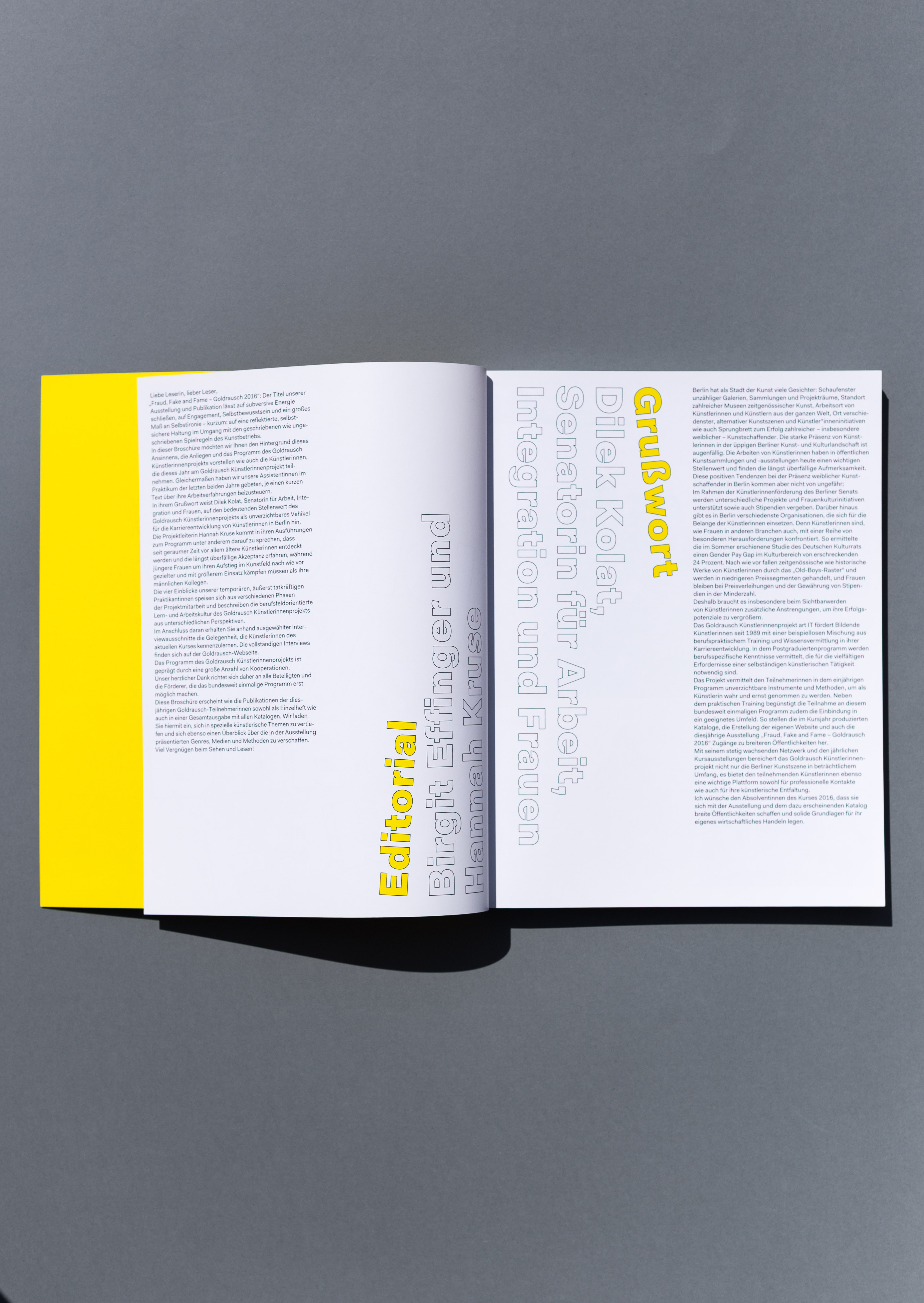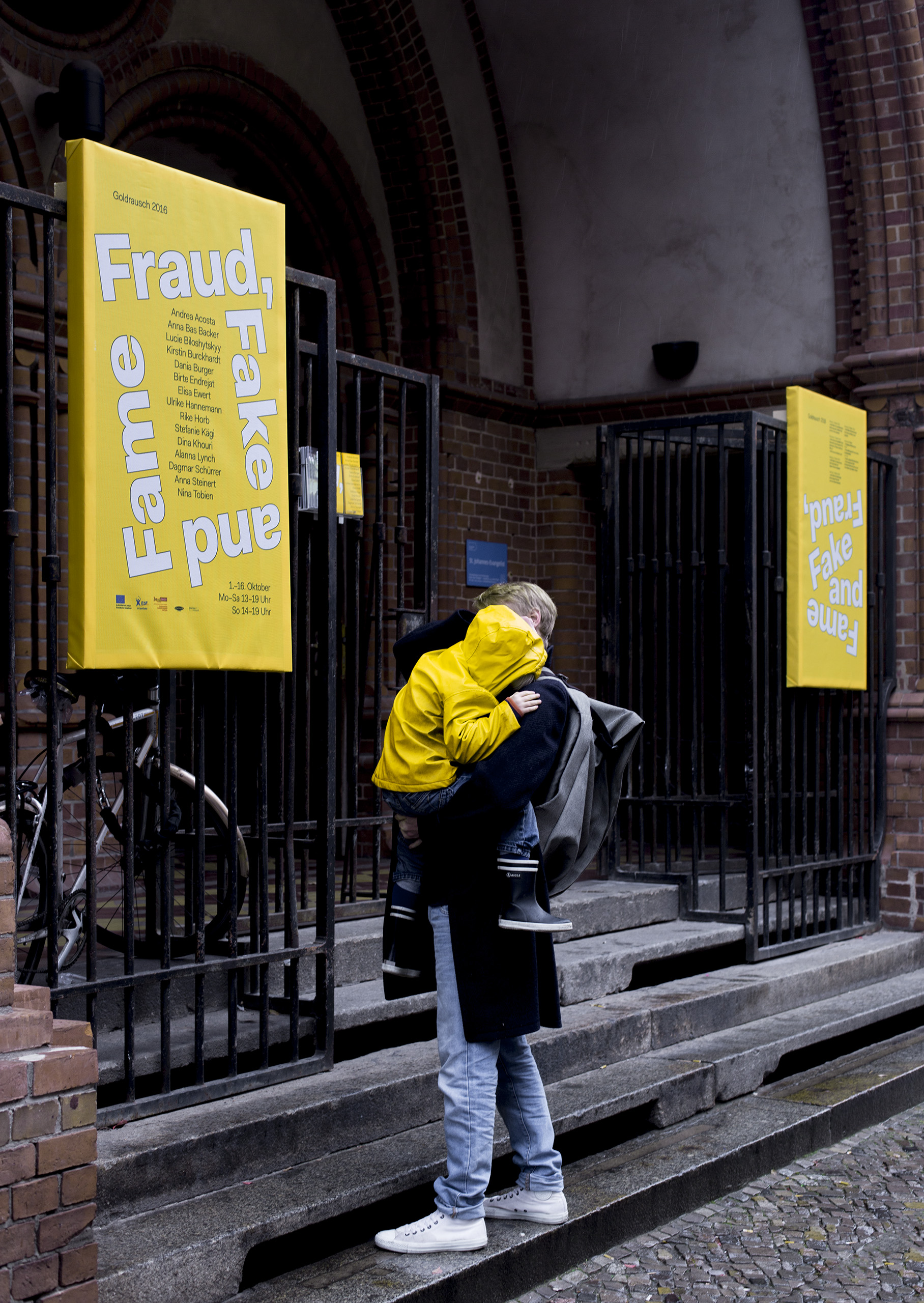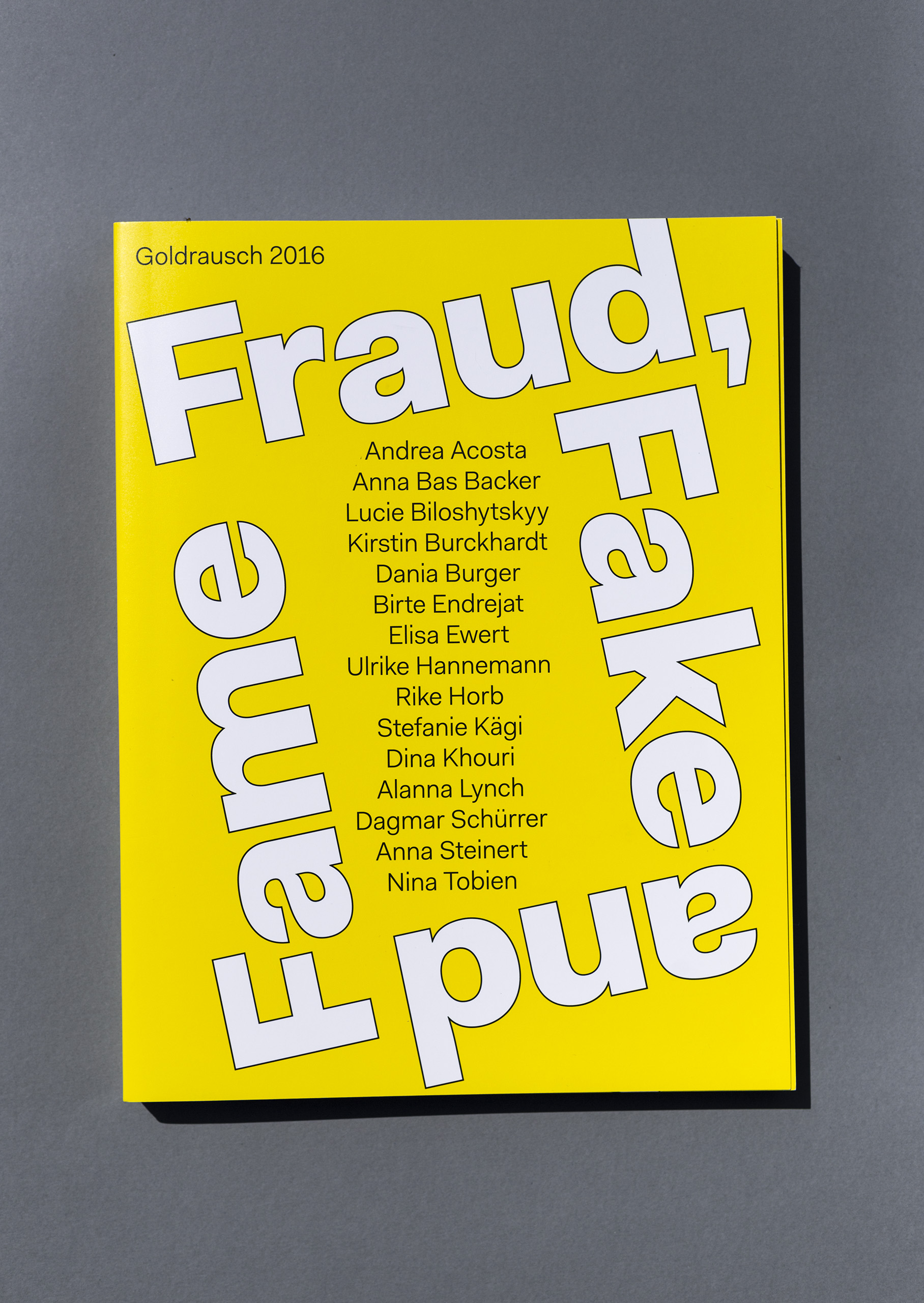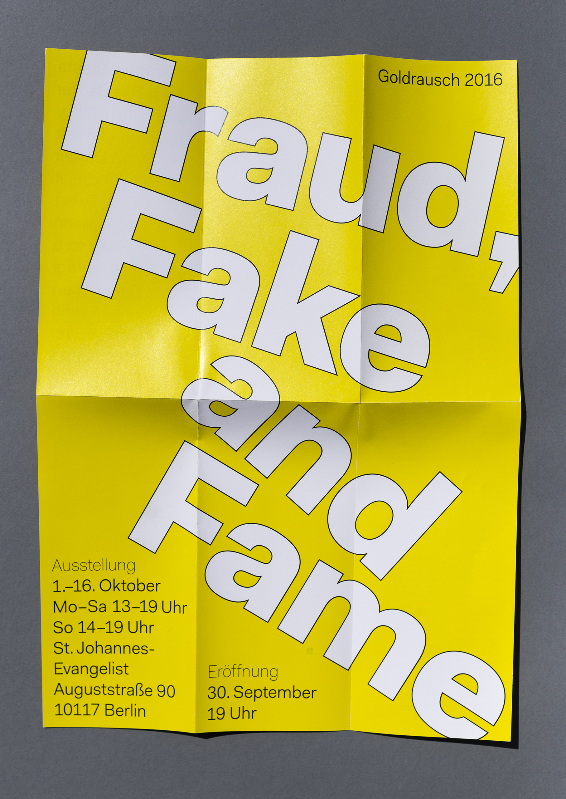 The exhibition “Fraud, Fake and Fame”, organized by Goldrausch Project for female artists, was held at the St. Johannes Evangelist church in Berlin. It featured sculptures, installations, films and paintings by various female artists. The key visual is a powerful yet humorous typographical play on the exhibition’s title “Fraud, Fake and Fame”. It can take on different word combinations and forms part of a flexible, dynamic identity. The design is very bold and simple and works for a range of digital print (and animated) media.