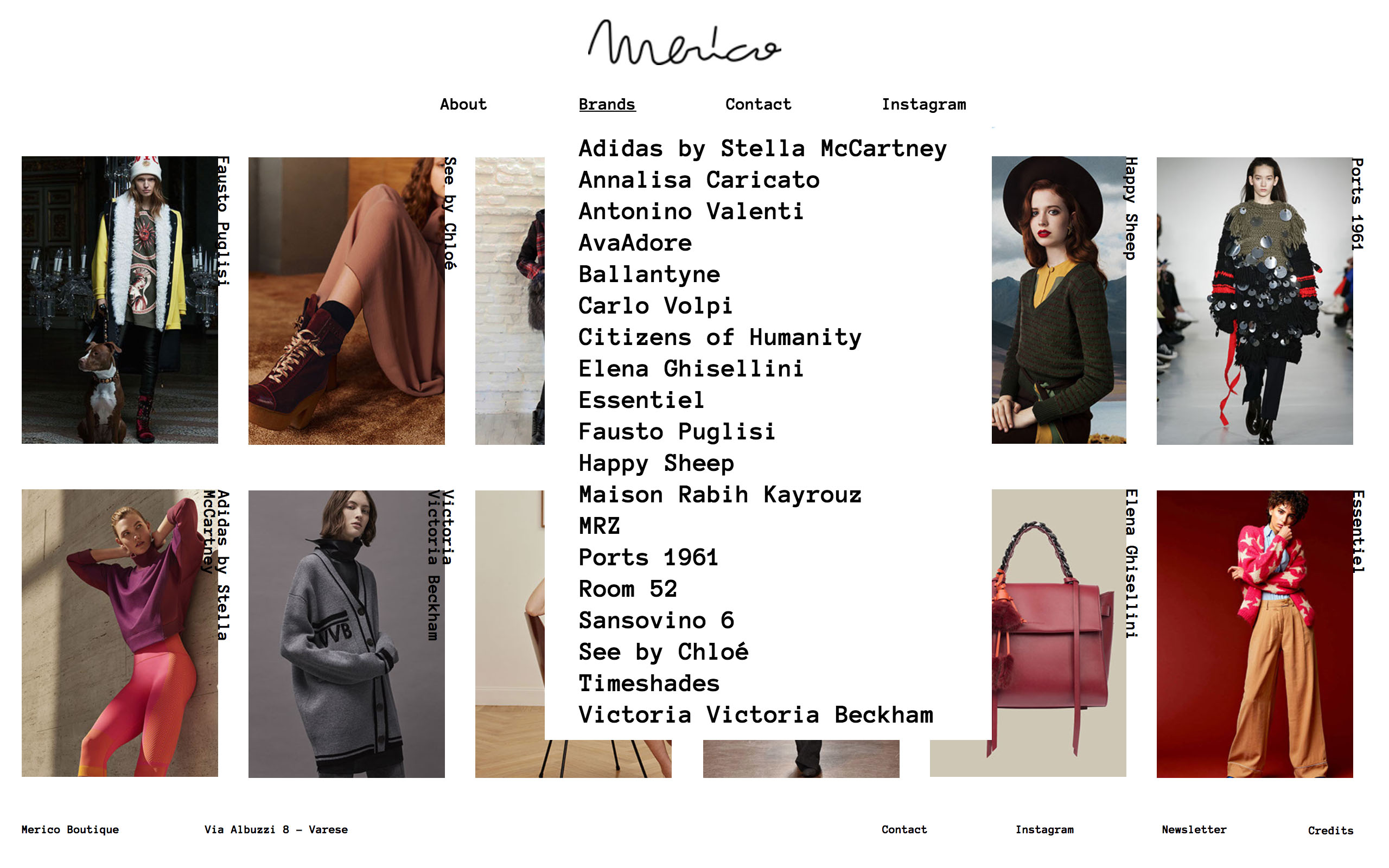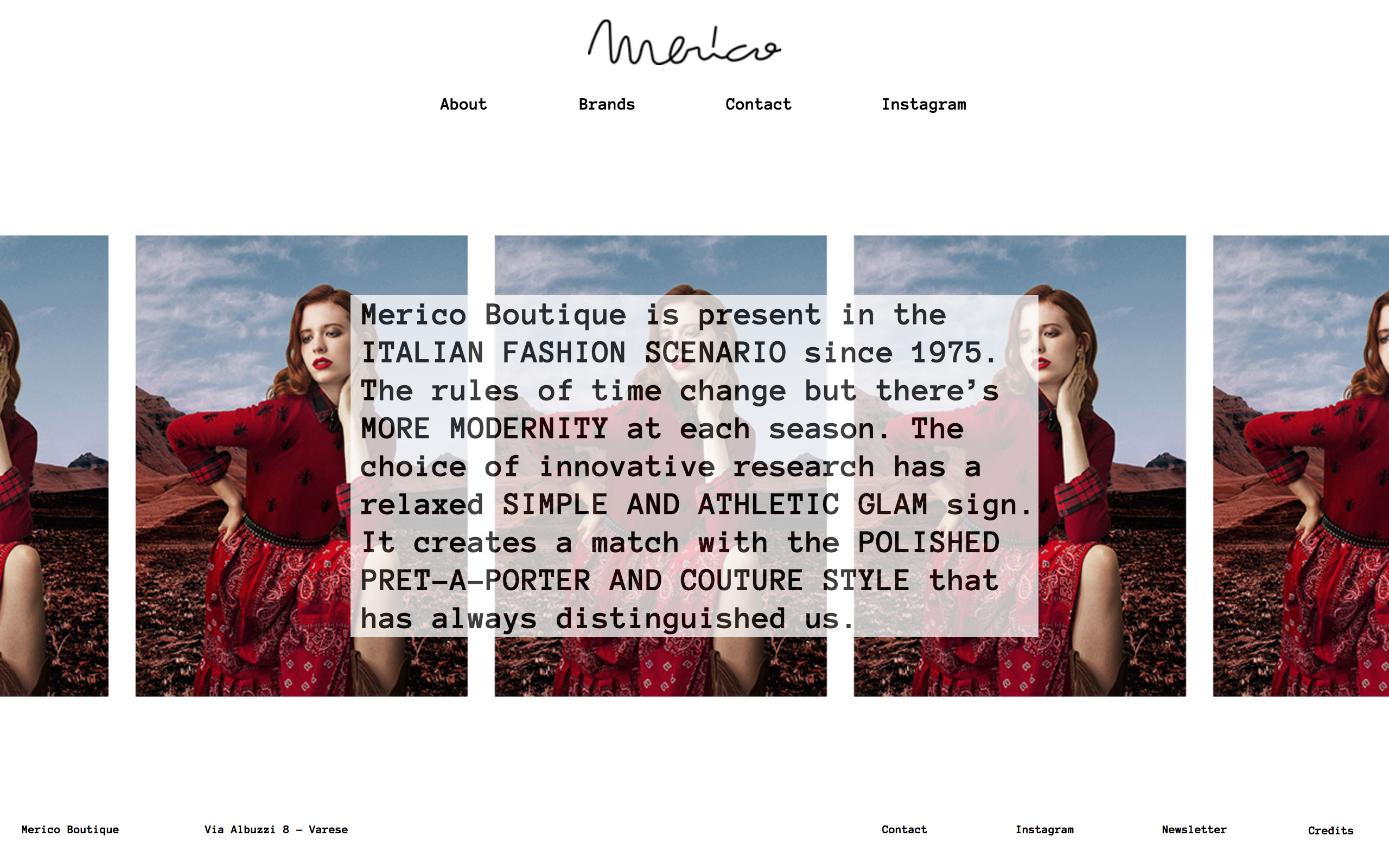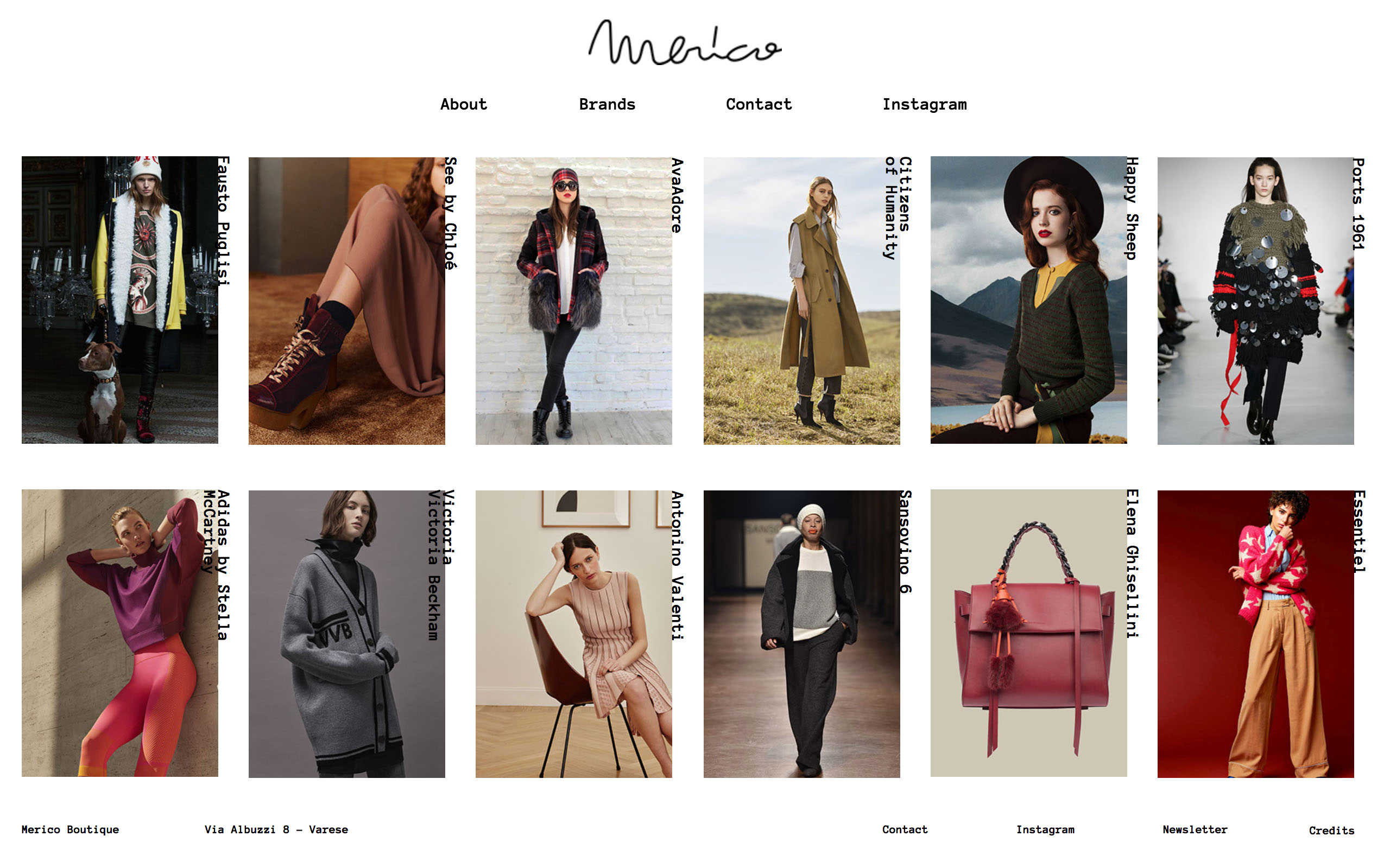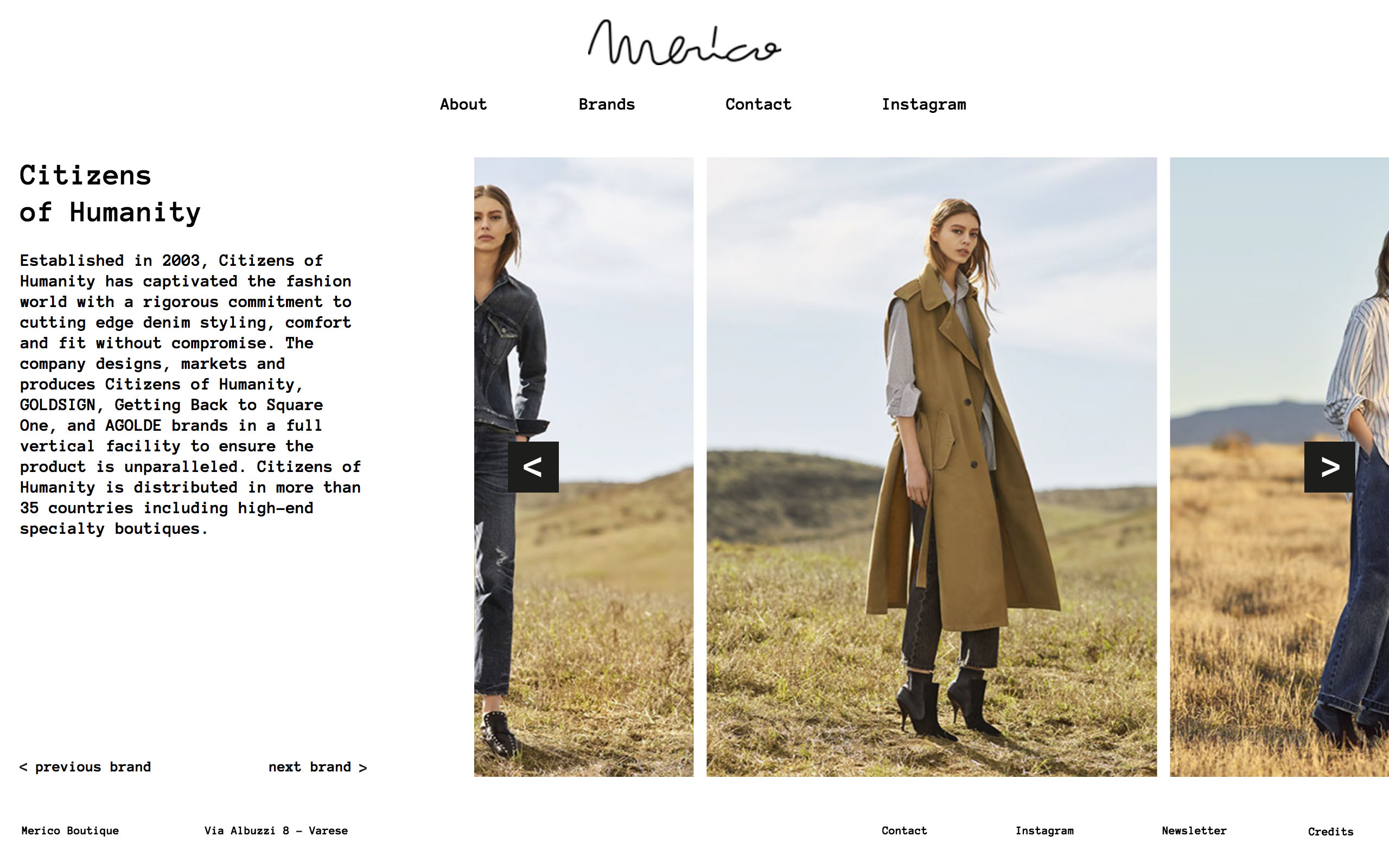 Merico Boutique website Contributed by Fonts In Use Staff on Nov 9th, 2017. Artwork published in September 2017. Source: www.mericoboutique.com Pod Creative Group. License: All Rights Reserved. Source: www.mericoboutique.com Pod Creative Group. License: All Rights Reserved. Source: www.mericoboutique.com Pod Creative Group. License: All Rights Reserved. Source: www.mericoboutique.com Pod Creative Group. License: All Rights Reserved. Typefaces More about Anonymous (Mark Simonson)Get Anonymous (Mark Simonson) Formats Web (5714) Topics Fashion/Apparel (1574) Designers/Agencies Pod Creative Group (1) Tagged withfashion (463)online shopping (397)boutiques (31) Artwork location Italy (995) Milano (302) In Setsfashion (Bjorg Gunnarsdottir) (4)Charisma (Artemiy Andreev) (7)Type Tips (nigel french) (6)Delacruz (Rodrigo Ramos) (27) Post a comment Name Email – will not be published Website Your response Submit Comment More Anonymous (Mark Simonson) in use NKWO2024The Blackpepper Studio (TBP)Contributed by Nouvelle Noire Robbie Spencer Ashworth2017PolytechnicArthur CareyContributed by Production Type Spacegoods2024Kate McCartneyContributed by Rellence (prev. Ultra Kuhl) Sponsor More in Fashion/Apparel Balenciaga website (2017)2017Bureau BorscheContributed by Love Lagerkvist Quartz Co.2016FeedContributed by Philippe Dionne Bussières MODE2023Everyday PracticeJoonho KwonJihyo AhnContributed by Benoît Bodhuin Staff Pick Mailam portfolio website2020unknownContributed by Alain Papazian More in Web Chaotic No Good website2020Lauren N. BaileyChaotic No GoodContributed by Lauren N. Bailey Queensland Theatre2017For The PeopleDamian BorchokJohanna RocaContributed by Daniel McQueen (TDF) Saraghina Caffè2022MuccaContributed by Sean O'Connor Staff Pick Shady Characters website2016Keith HoustonContributed by Love Lagerkvist Staff Pick More Fonts In Use Run-DMC logoc. 1986Stephanie NashBruno TilleyContributed by Garrison Martin Staff Pick Dresdner Essenzc. 2013kakoiiContributed by Florian Hardwig Staff Pick B.Z. Berlin2015B.Z. BerlinContributed by JAF Staff Pick Accident(s) book fairc. 2021Atelier Choque Le GoffContributed by Oudin Romain Staff Pick