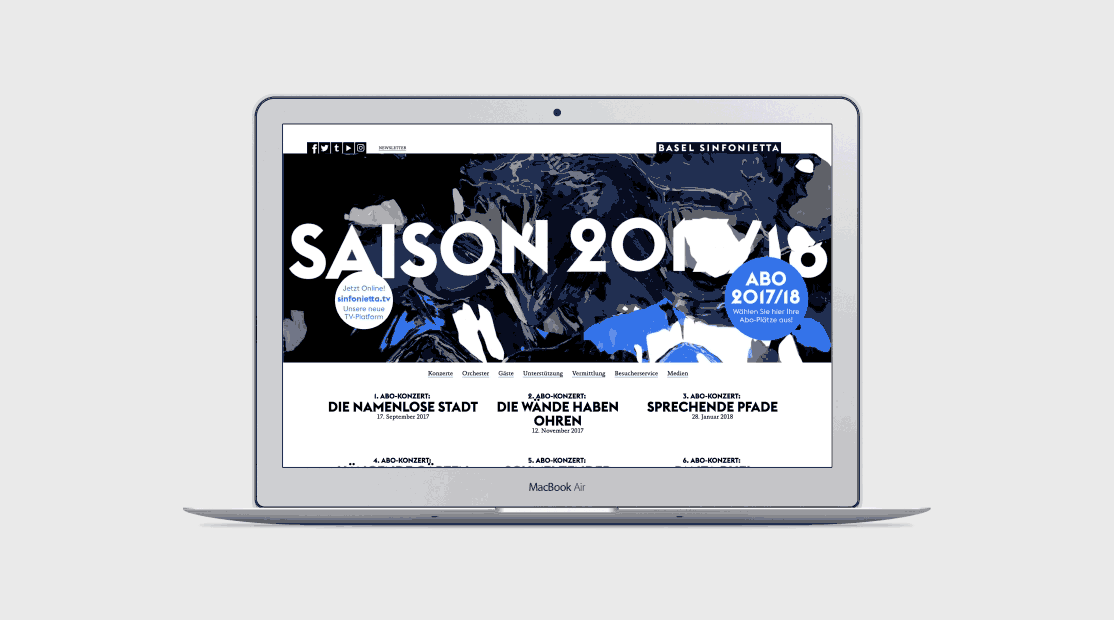 Basel Symphonietta 2017/18 Contributed by Swiss Typefaces on Nov 22nd, 2017. Artwork published in circa 2017. License: All Rights Reserved. Hauser, Schwarz continue to design the Basel Sinfonietta’s communication for this new season. Euclid Flex is part of the Euclid typeface, available from Swiss Typefaces. License: All Rights Reserved. License: All Rights Reserved. License: All Rights Reserved. License: All Rights Reserved. Typefaces More about Euclid FlexGet Euclid Flex Formats Web (5619) Advertising (2115) Branding/Identity (8441) Posters/Flyers (5754) Topics Entertainment (1538) Music (6353) Art (4684) Designers/Agencies Hauser, Schwarz (6) Tagged withposters (1417)season booklets (96)events (189)programs (634)websites (3562)symphonies (23)Basel Sinfonietta (3)Basel (9)orchestras (53)reversed type (3376)type in a box (709)drip/liquid effects (41) Artwork location Switzerland (1118) Basel (103) In SetsHATI (L YH) (15)June 2020 (slee) (76)Motion (Brylie Wilson) (29) Post a comment Name Email – will not be published Website Your response Submit Comment More Euclid Flex in use Desdémone. Entre désir et désespoir2015PrototypeAurore JanninLaurent PinonContributed by Swiss Typefaces L’ADN magazine #102017Violaine & JérémyContributed by Love Lagerkvist Baron Noir TV series2016Suleyman YazkiContributed by Suleyman Yazki Sponsor More in Entertainment Murder Can’t Stop by W.T. Ballard1953Contributed by Florian Hardwig wonderzine.comc. 2015Kate BaklushinaContributed by kmalykh k Puzzle Express More More Plus1999SemicomContributed by tabmok99 AwardsLine, Emmy 2014, Issues 1–32014Robb RiceContributed by Robb Rice More in Advertising Airbnb identity, website, app (2014 redesign)2014DesignStudioAndrew SchapiroContributed by Stephen Coles Staff Pick Kleinert’s Dress Shields Ad: “If Perspiration Were A Tiger”c. 1935Contributed by Stephen Coles Osram-Lampen1931Gebr. KlingsporContributed by Florian Hardwig Concert Associates, Stetcher & Horowitz announcement1960Robert BrownjohnBrownjohn, Chermayfeff & GeismarContributed by Nick Sherman More Fonts In Use O!Meega brand identity2020Martyna Wędzicka-ObuchowiczContributed by Alex Slobzheninov Staff Pick The Moravian Night. A Story by Peter Handke2016Na KimContributed by Florian Hardwig Staff Pick Firestone logoc. 1905Christian John ChristiansenContributed by Stephen Coles Staff Pick La ville en marchant (exhibition)c. 2017Bureau 205Contributed by 205TF Staff Pick