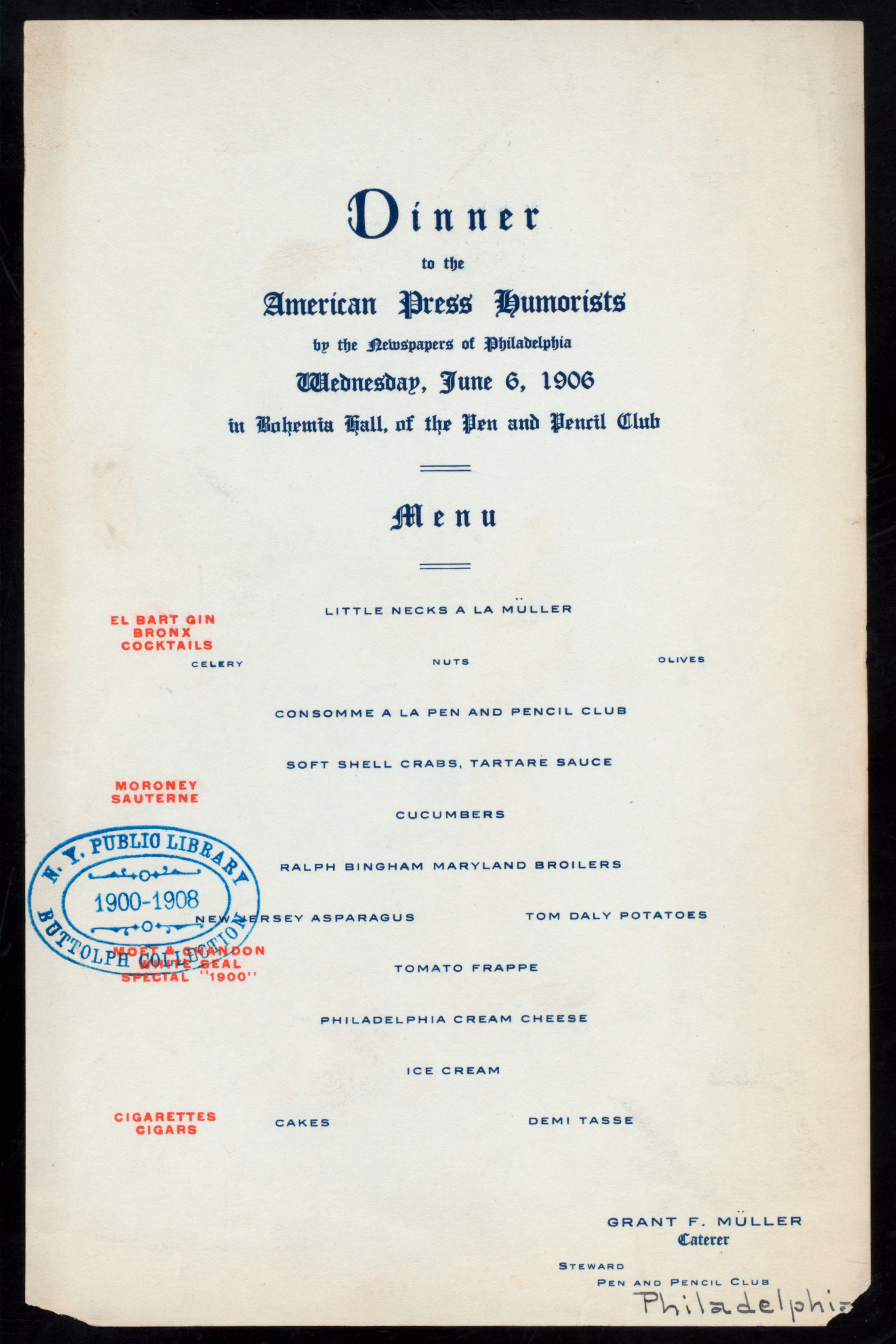 Dinner to the American Press Humorists by the Newspapers of Philadelphia, Wednesday, June 6, 1906, in Bohemia Hall, of the Pen and Pencil Club. Broadside; 5.5 × 8.5 inch. From the New York Public Library’s collection of historical restaurant menus, call number 1906–511.
