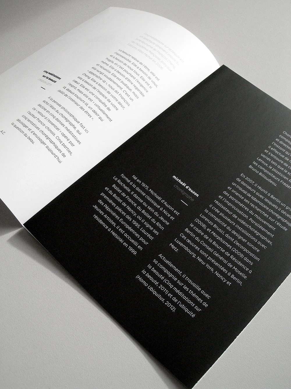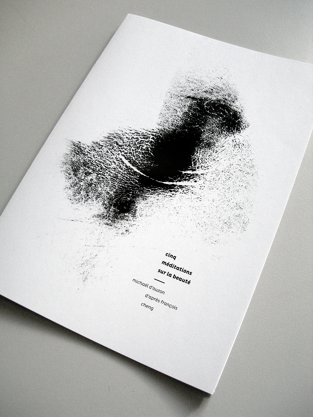 Cinq méditations sur la beauté is a performance by choreographer and dancer Michaël d’Auzon, based on the self-titled book by philosopher François Cheng. It talks about human and his place in nature, in a taoist way. For the visual identity, parts of choregrapher’s body are used as rubber stamps to create several “human landscapes”. As clouds could sketch a cat or a rabbit, some forms appear here : stones, trees, creek… The type is straight but organic, so it fits well with those abstract forms and black and white spaces.