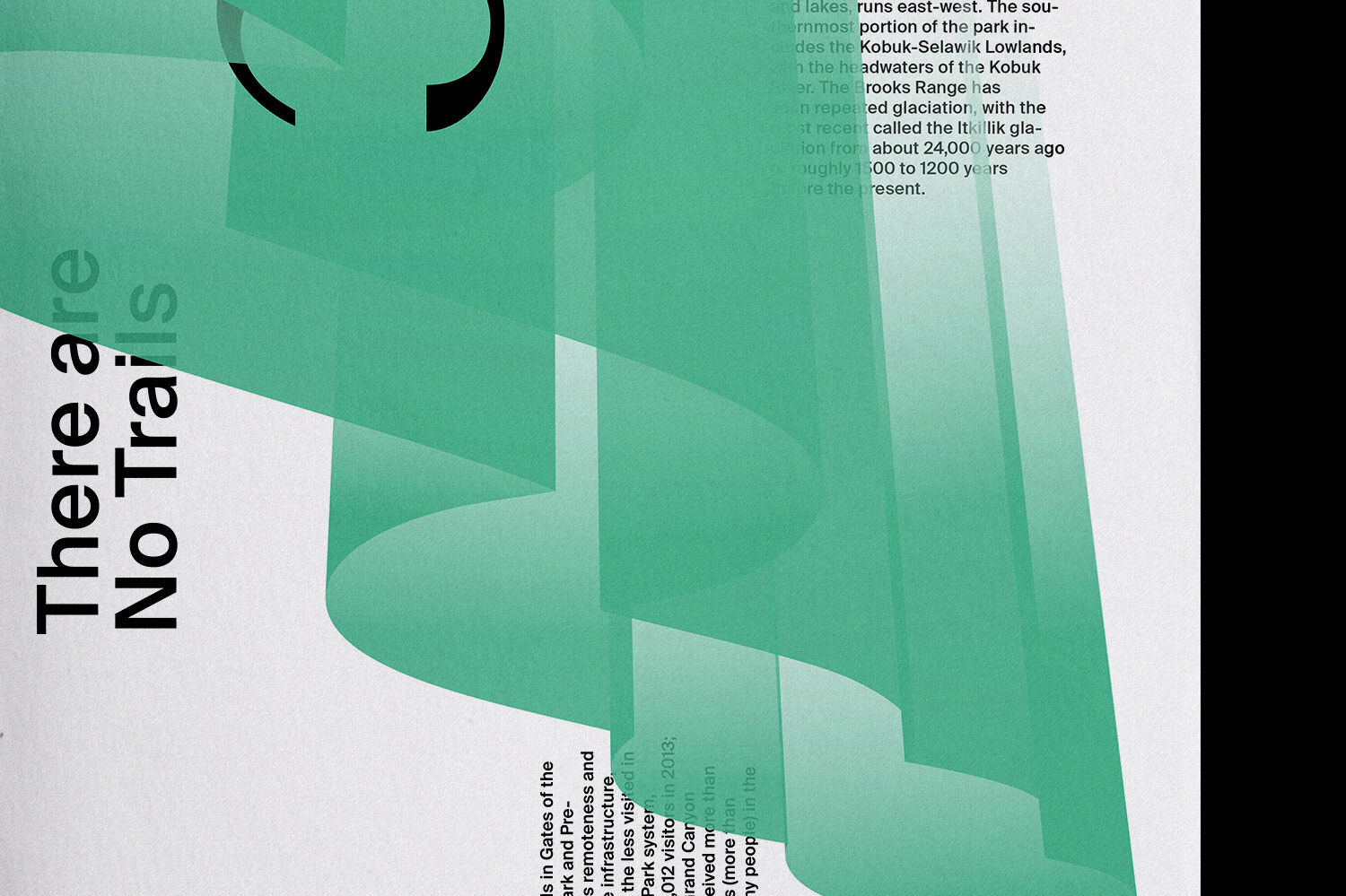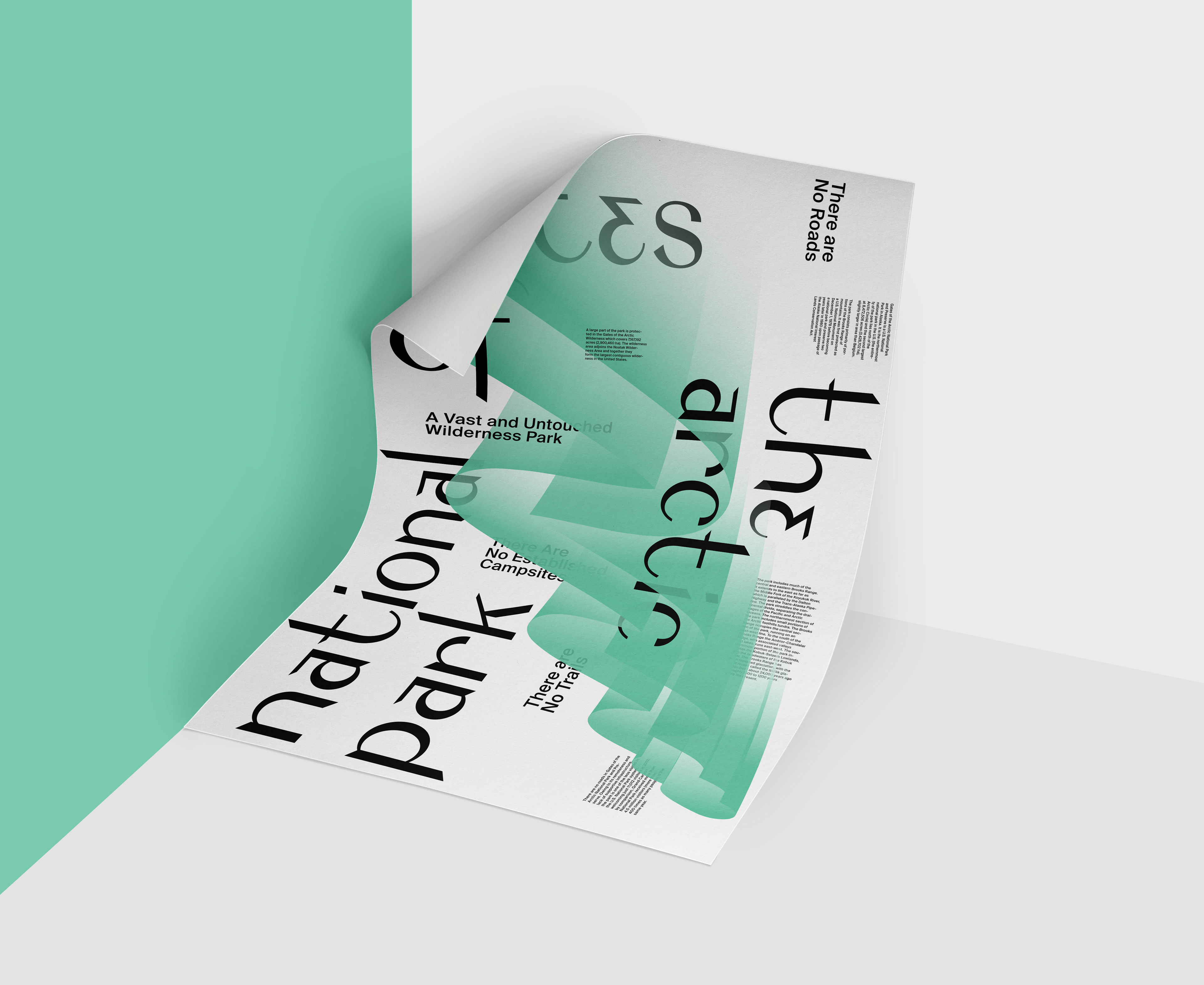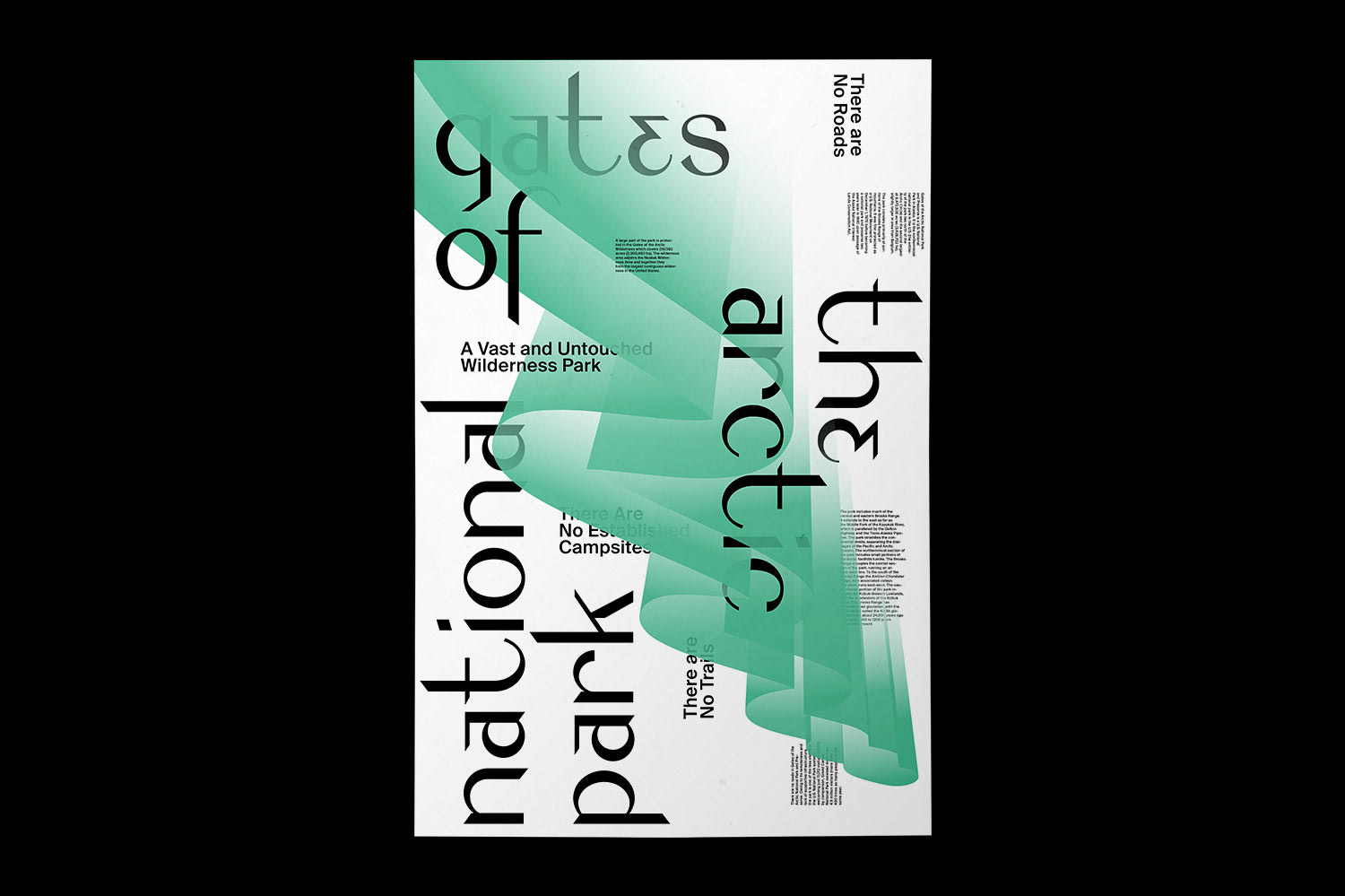 The exhibition was curated by Type Hike team and National Park Service. Gates of the Arctic National Park is one of the best places to observe the Northern Lights (Aurora), which became the main concept for this poster. The curtain-like super-form in the poster is a visual translation of the Northern Lights. The custom typeface used for this poster was an interpretation of same forms in a typographic manner.