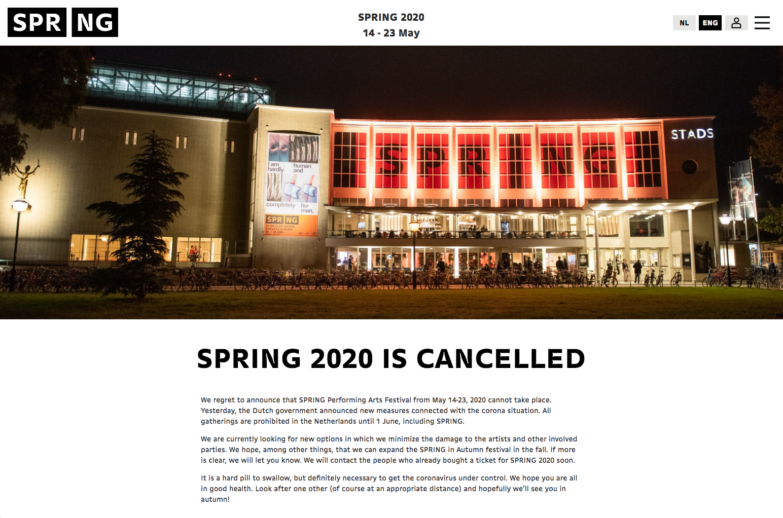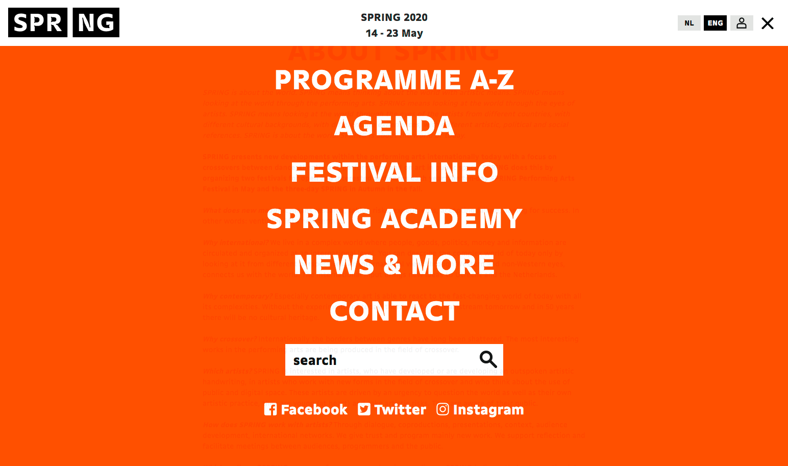 SPRING presents new developments within the performing arts internationally today with a focus on crossovers between dance, theatre and performance and on art in public space. SPRING does this by organizing two festivals for open and interested audiences each year; the ten-day SPRING Performing Arts Festival in May and the three-day SPRING in Autumn in the fall.