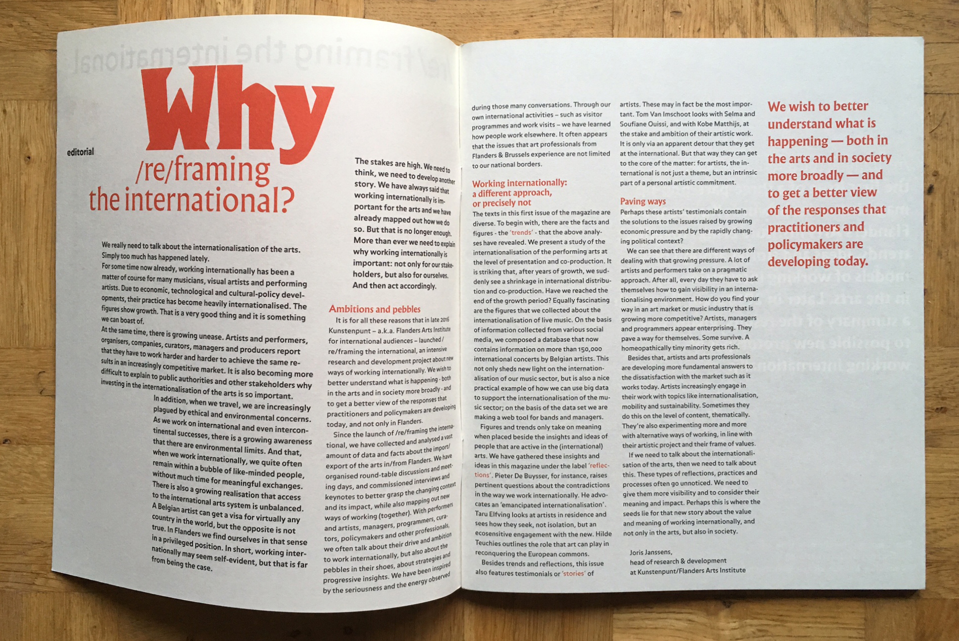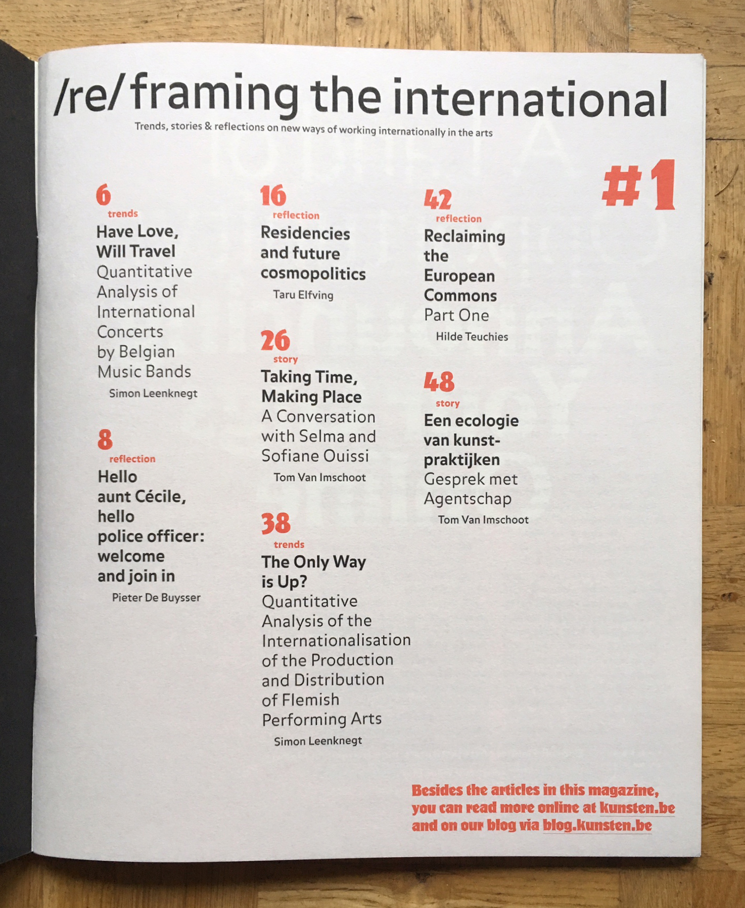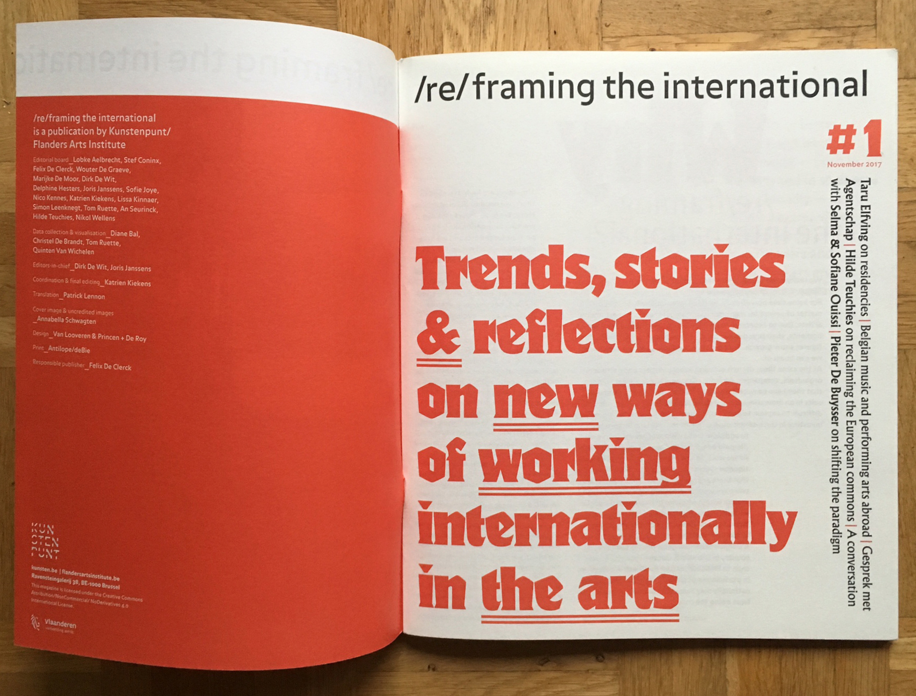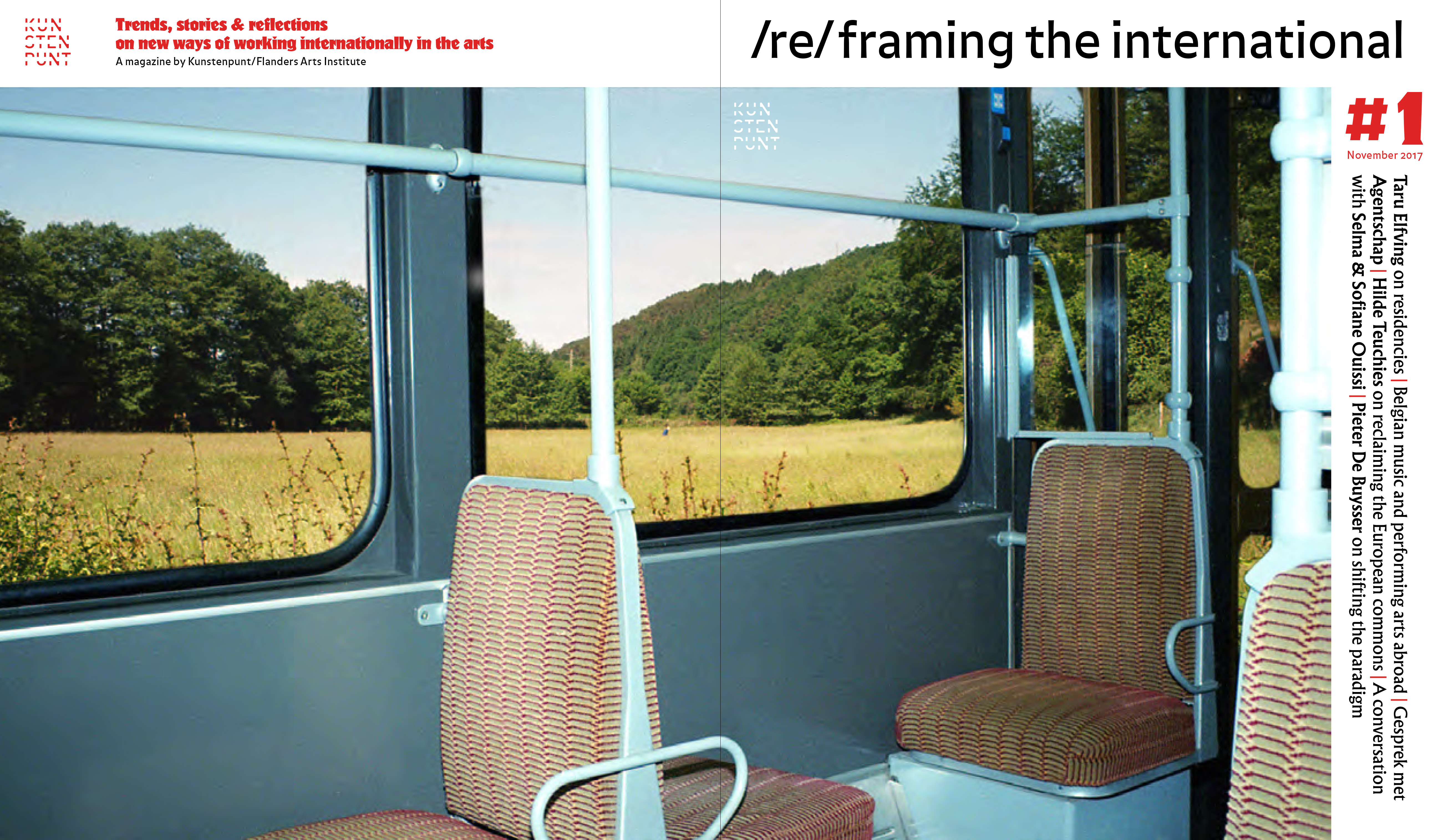 Alarm is prominently featured in the first issue of /re/framing the international, a pop-up magazine published by Kunstenpunt/Flanders Arts Institute. The magazine presents a collection of texts and reports with the latest trends, stories and reflections on new models of international collaboration in the arts. Three issues are planned, to be followed by a book publication.