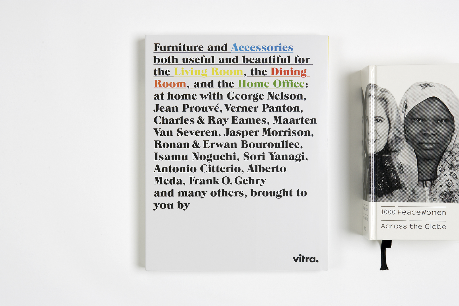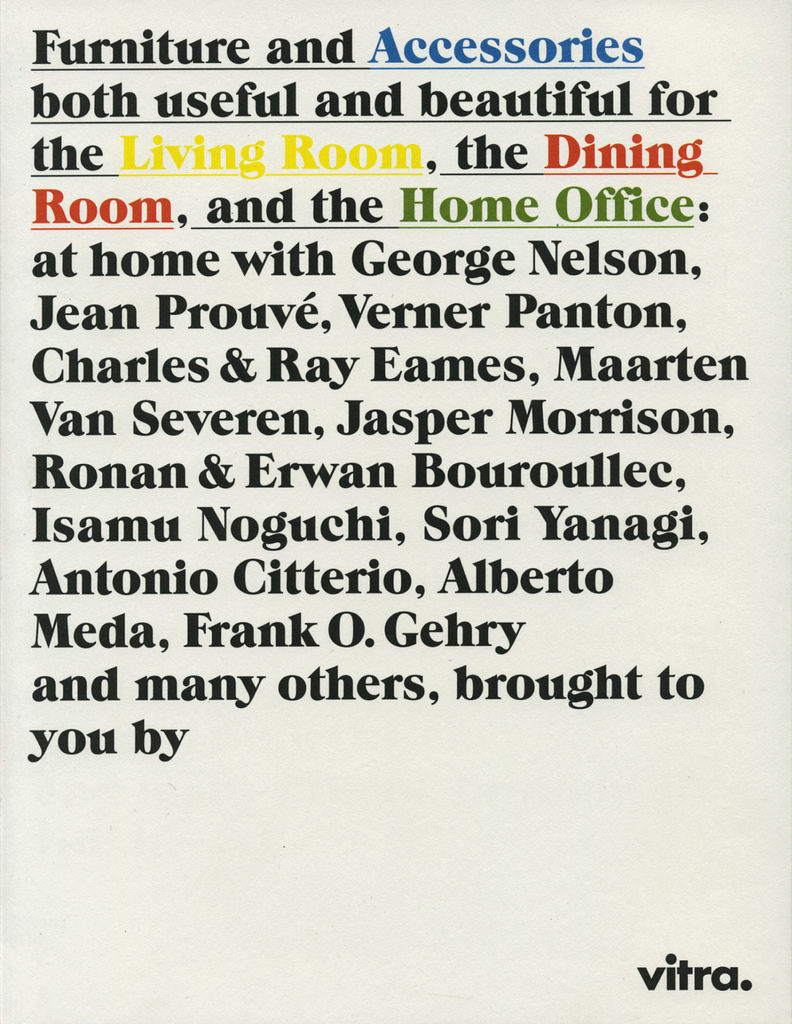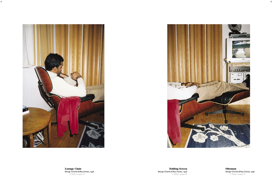 A two-volume catalogue, displaying the recently designed Home Collection of Vitra. While the 'select’ part presents the individual articles of furniture in isolation along with their product specifications, the 'arrange’ part sets the furniture in the context of actual and/or imaginary interior design scenarios. The two parts of the catalogue are joined together into a single volume by means of a simple bookbinding device.