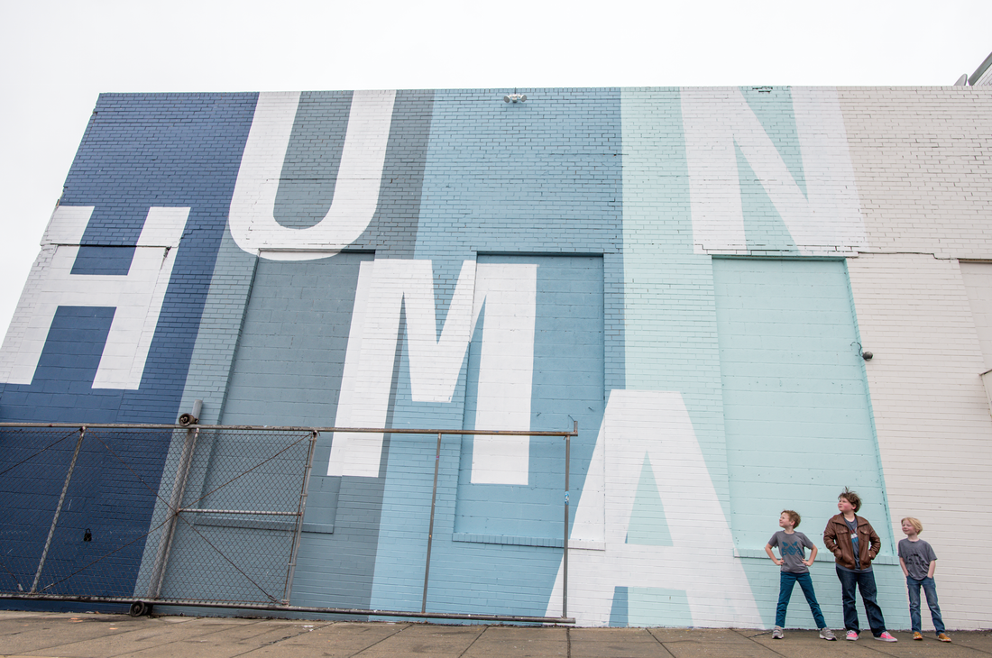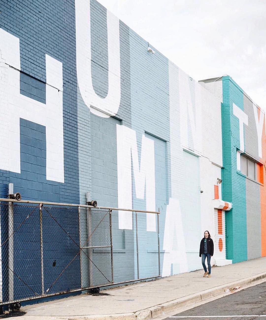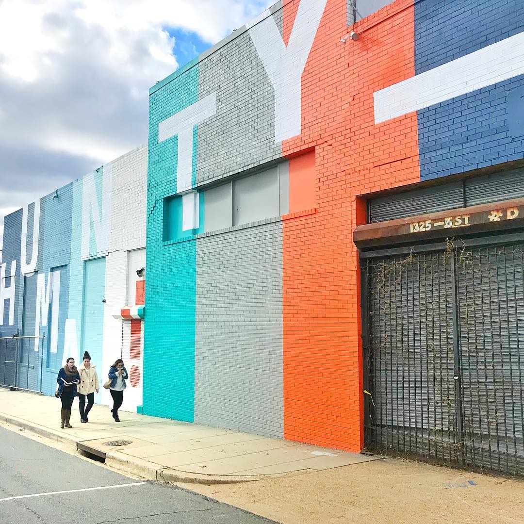 This mural is located at Union Market in DC. It was created to help promote an art exhibit highlighting 8 photographers tasked with capturing their own unique vision of humanity using the Google Pixel2. This vision was brought to life by Creative Theory and Google. It was designed to stand the test of time beyond the exhibit and act as a fun place to take Instagram photos and spark conversations about the world we are living in. [Greg Fisk]