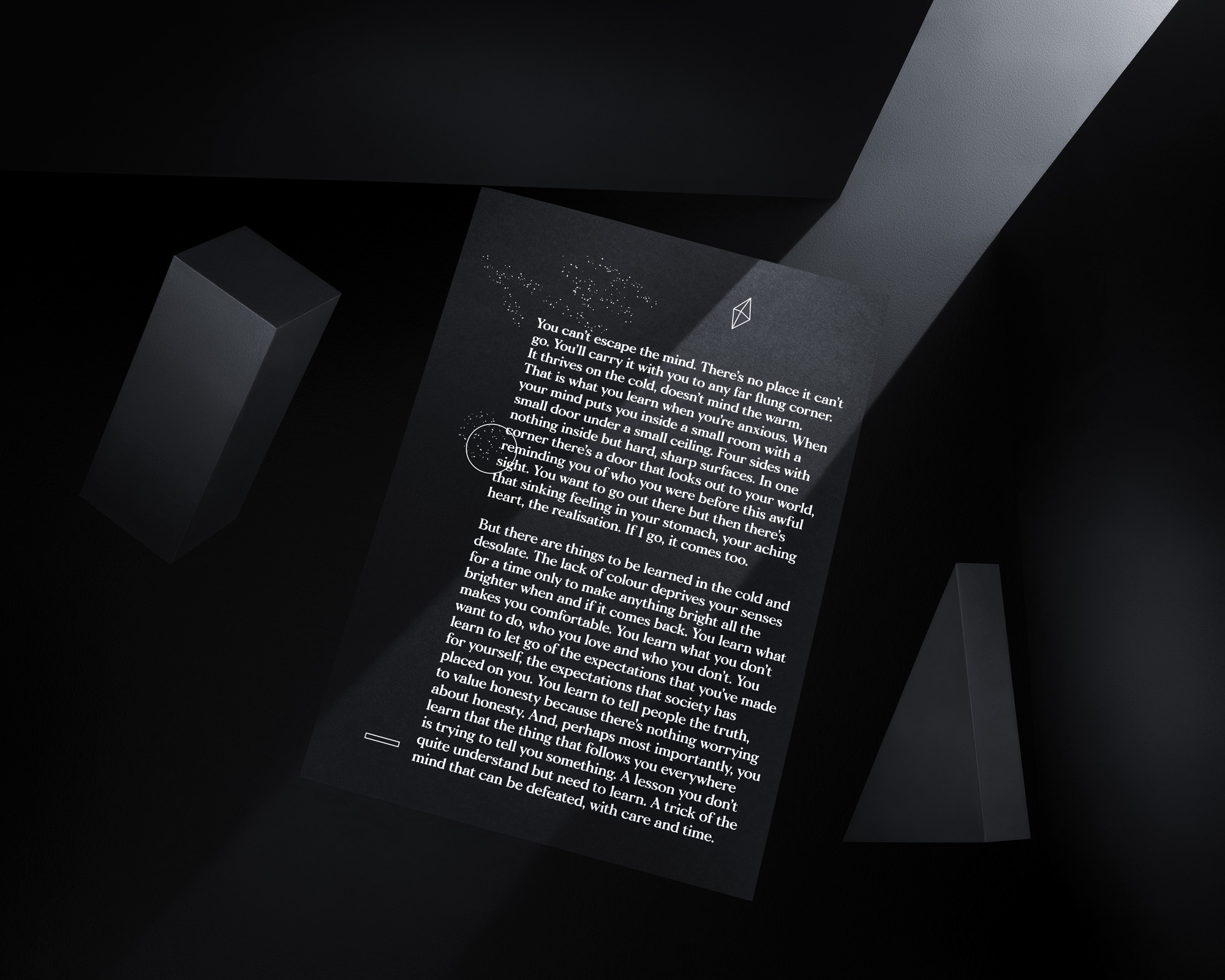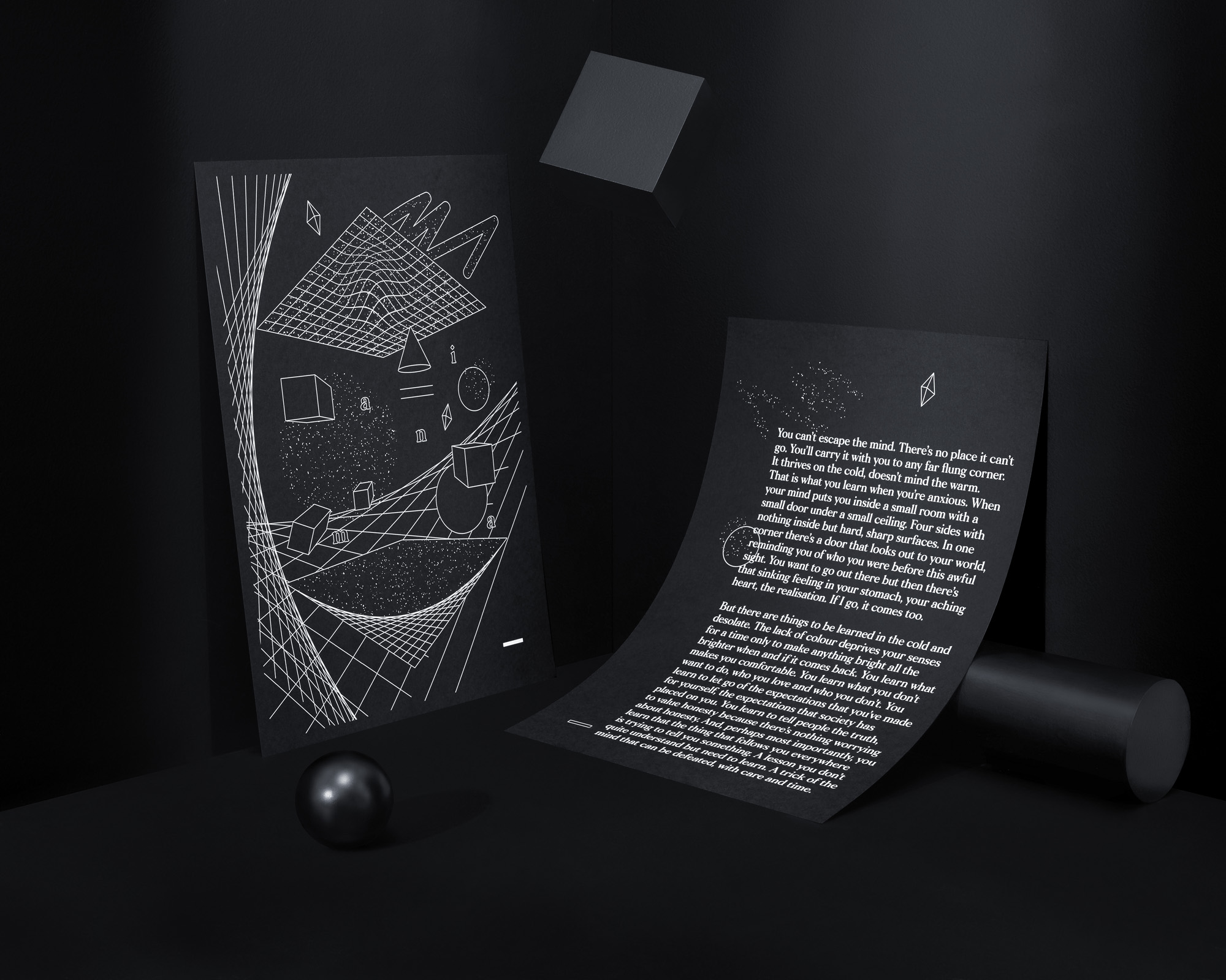 “Mania” is a double-sided graphic poster that explores the feeling and realisation of dealing with anxiety. Through an illustration on one side and a short written piece on the reverse, the poster reflects upon experiences only to learn and grow from them.