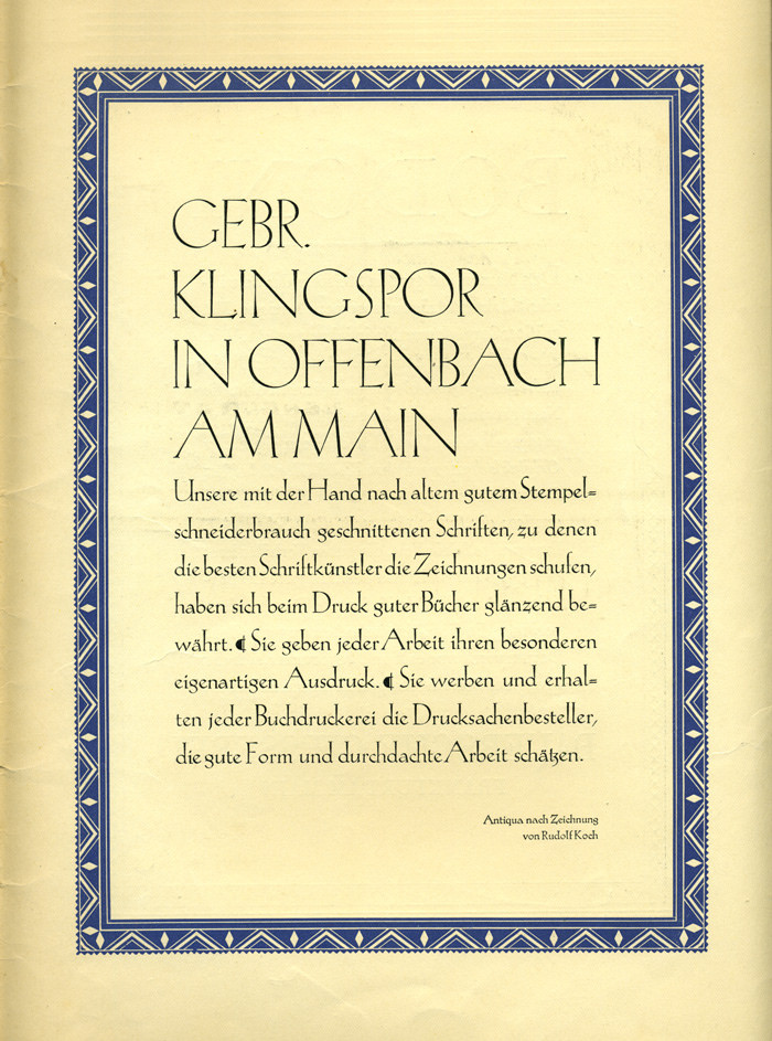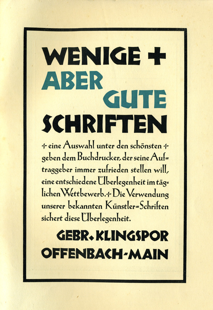 “Wenige aber gute Schriften” — “Few but good typefaces. A selection from the most beautiful ones will give those printers who always want to satisfy their clients a decisive superiority in the daily competition. The use of our well-known artist’s typefaces ensures this superiority.”