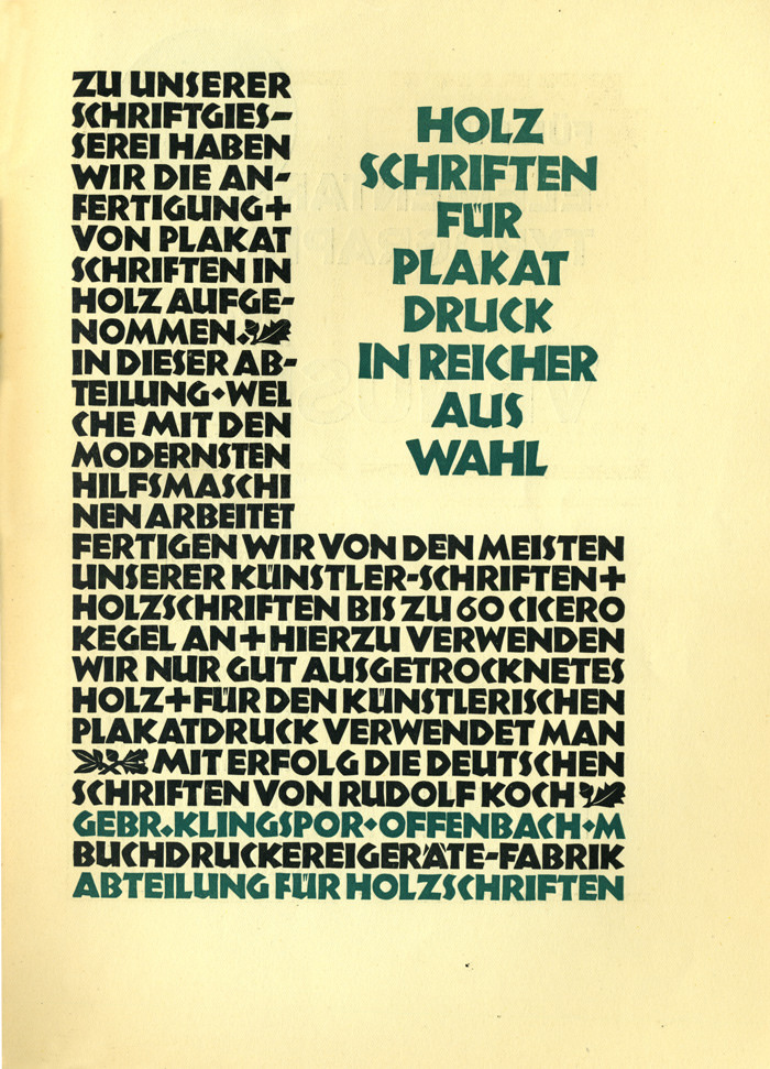 “A rich selection of wood type for poster printing. In addition to our type foundry we have taken up the production of poster typefaces in wood. In this department, which operates with the most modern machinery, we produce wood type in sizes up to 60 Cicero of most of our artist’s typeface designs. For this we exclusively use well-dried wood. Use the German typefaces of Rudolf Koch for successful results in artistic poster printing.”