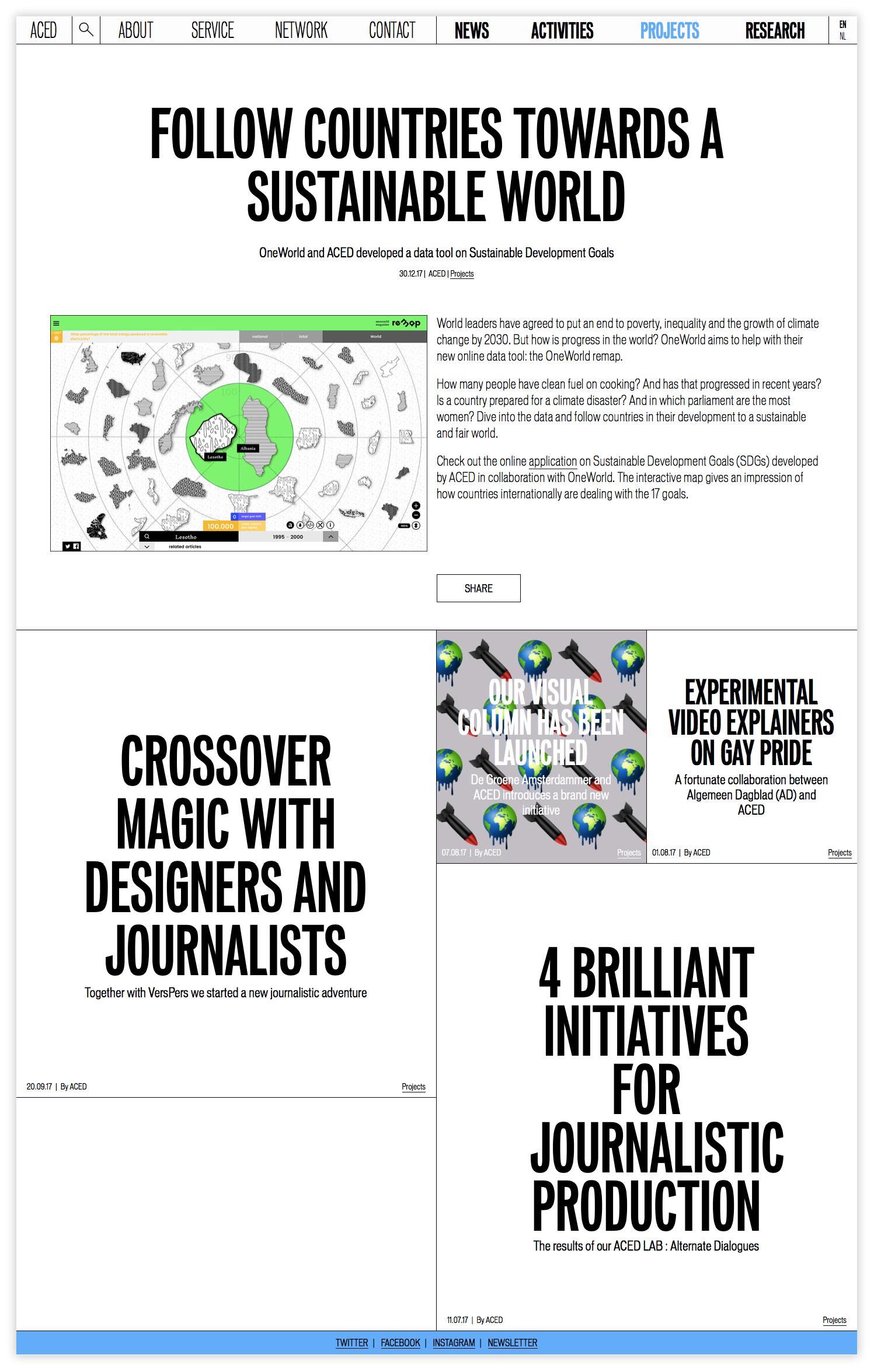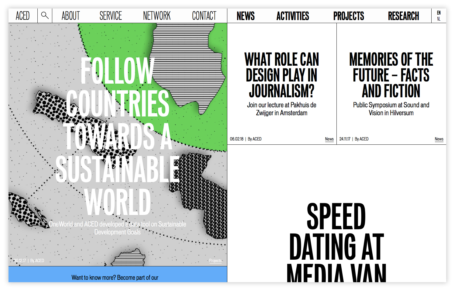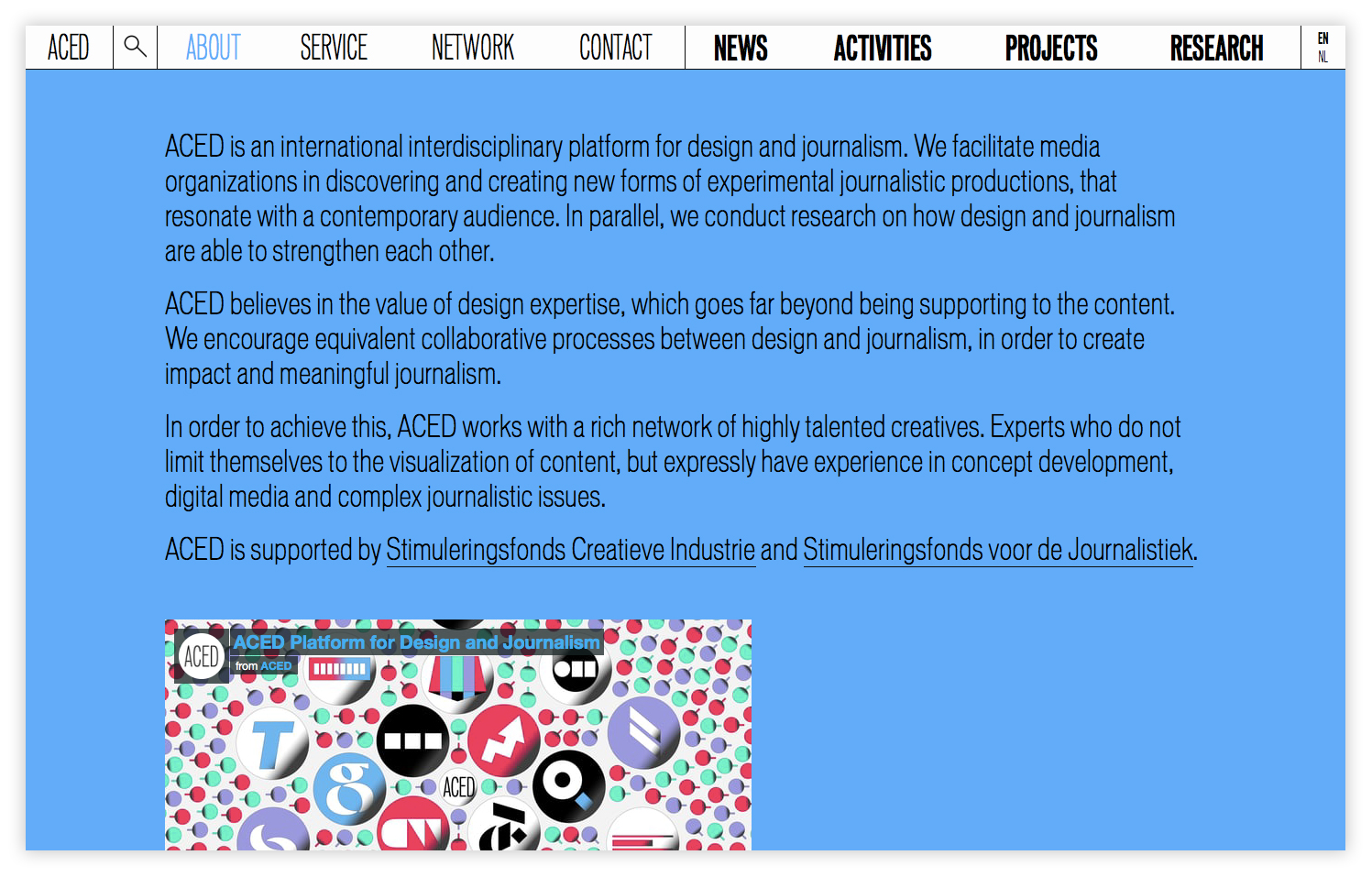 ACED is an international interdisciplinary platform for design and journalism. The main goal of the ACED website seems to be to draw attention to its activities, urging visitors to watch a short video, to share it and, to visit ACED’s events.