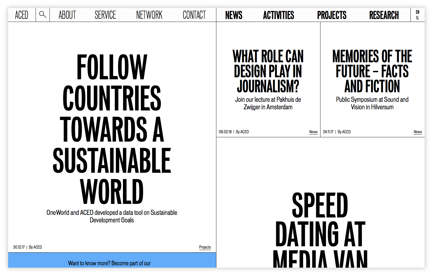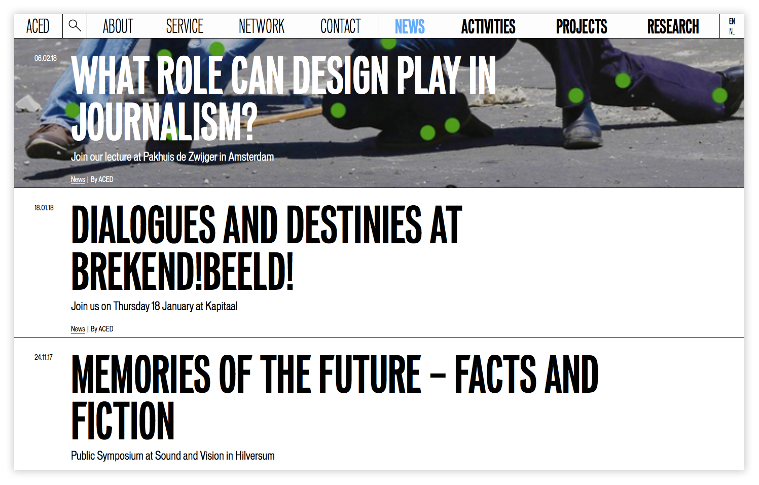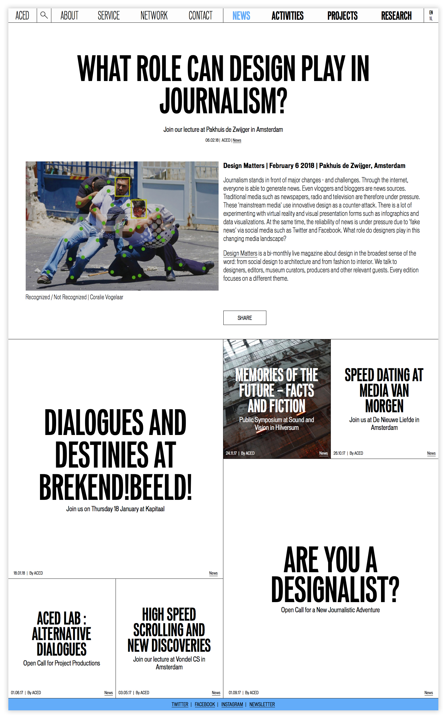 ACED is an international interdisciplinary platform for design and journalism. The main goal of the ACED website seems to be to draw attention to its activities, urging visitors to watch a short video, to share it and, to visit ACED’s events.