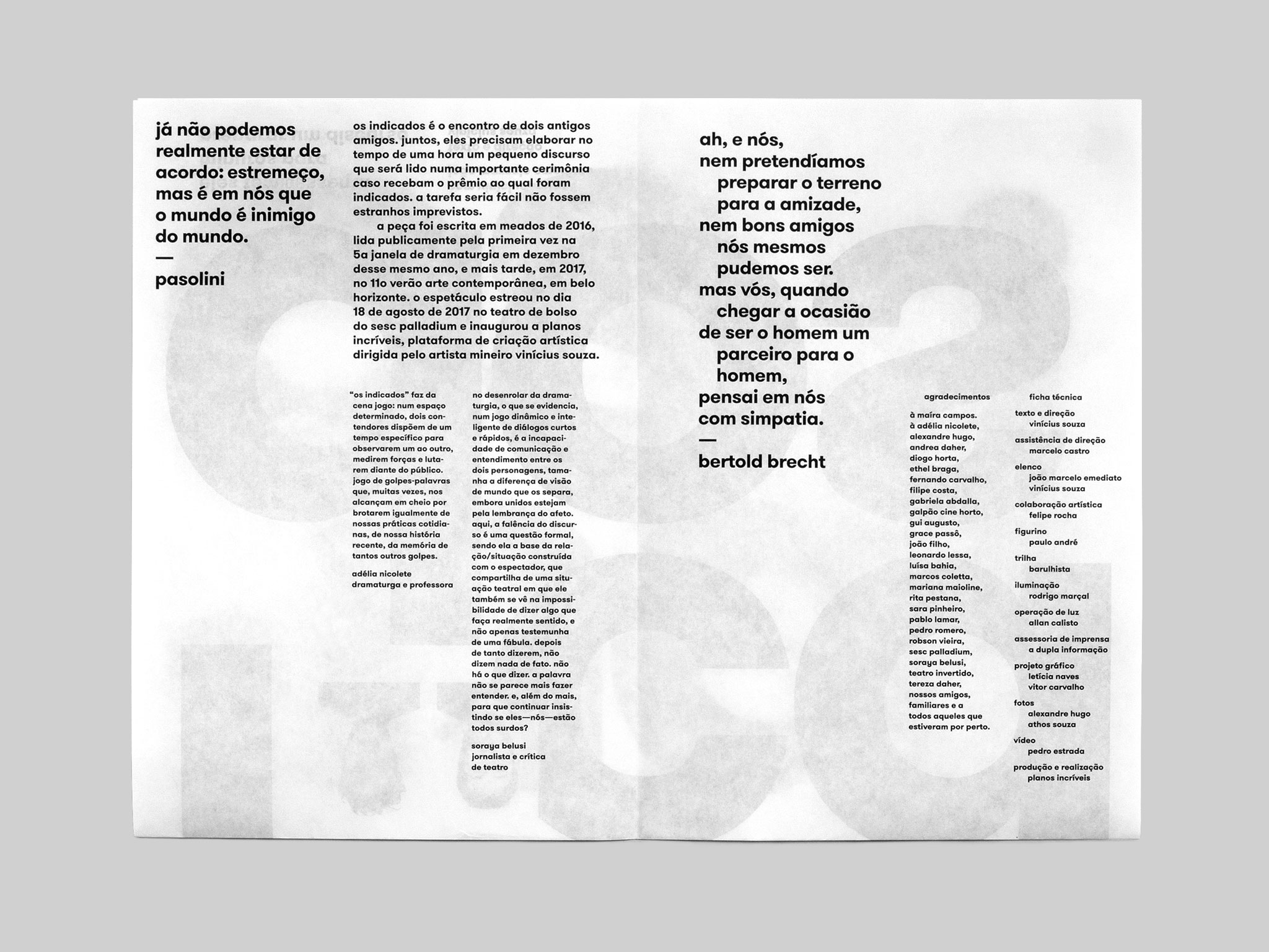 The graphic language was imagined as a translation of the oscillating tension the script was built upon, reflecting a crumbling polarized society and the never ending search for a Brazilian identity. The double-sided poster also plays the role of programm, highlighting the themes and people involved in the play.