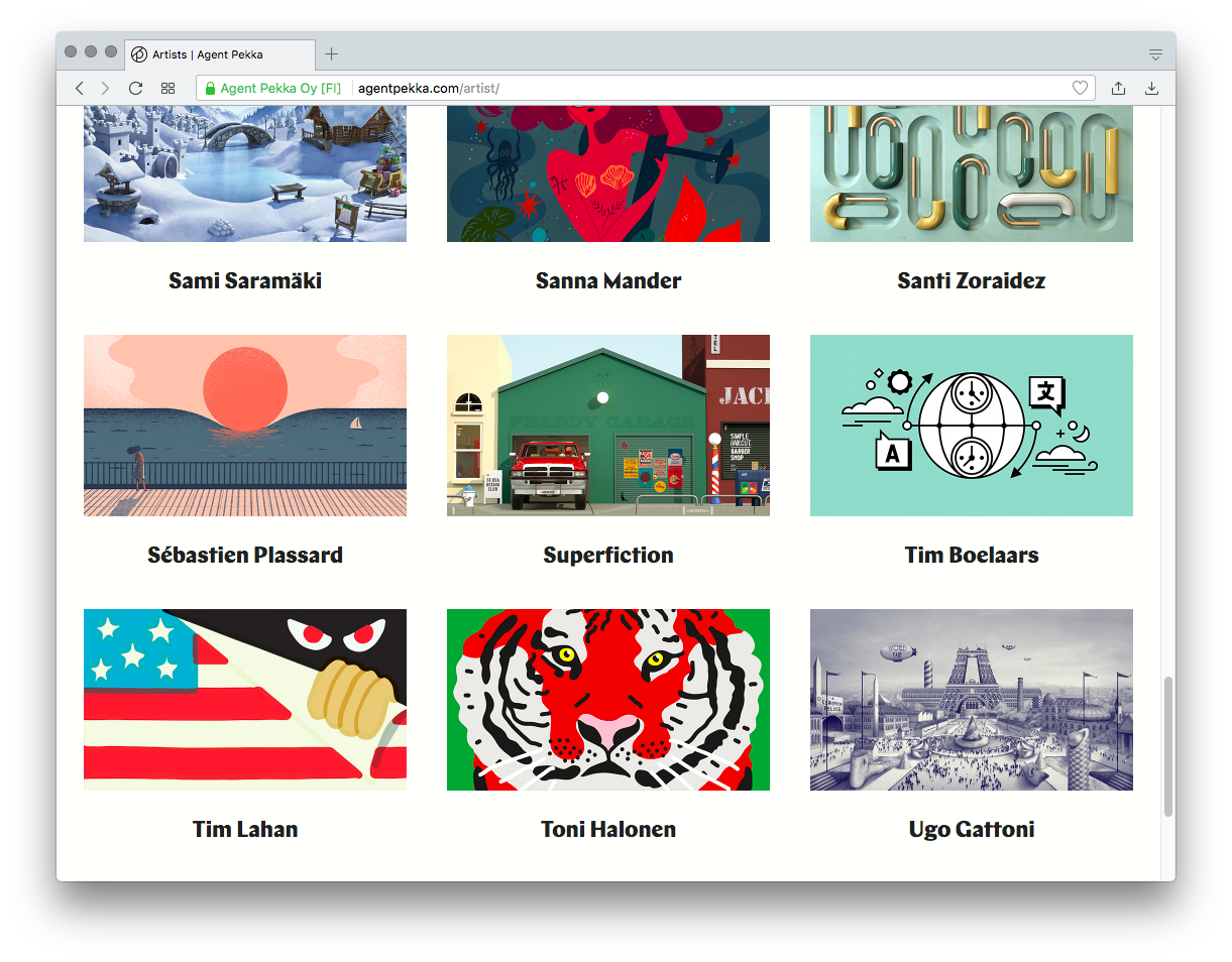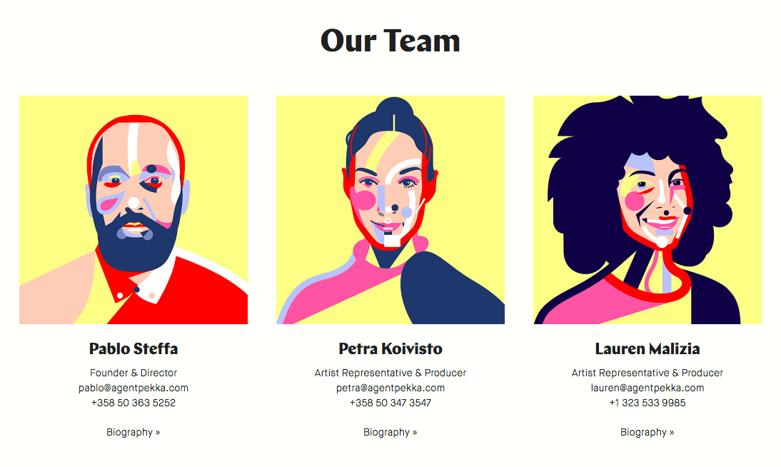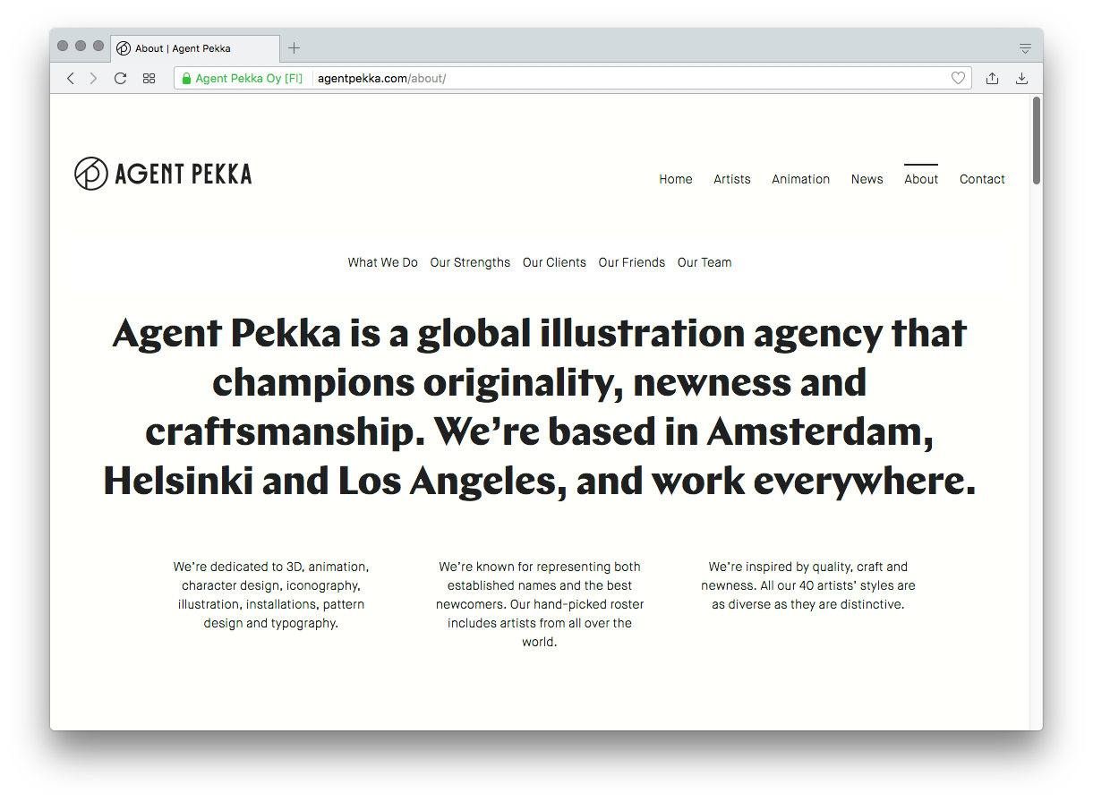 The website of illustration agency Agent Pekka demonstrates that a well-defined typographic hierarchy doesn’t need a lot of ingredients. All text is set in only two fonts, Chap Bold and Maison Neue Light. The former appears for headlines in a cadence of three larger sizes (88px, 44px, 22px). The latter is used for smaller elements in a fixed size of 14px (for Desktop).