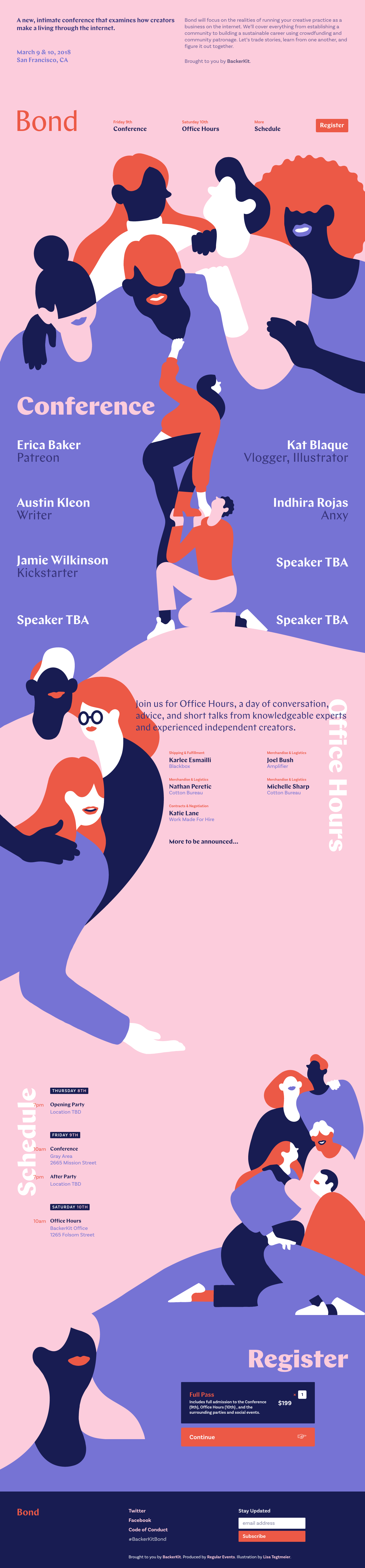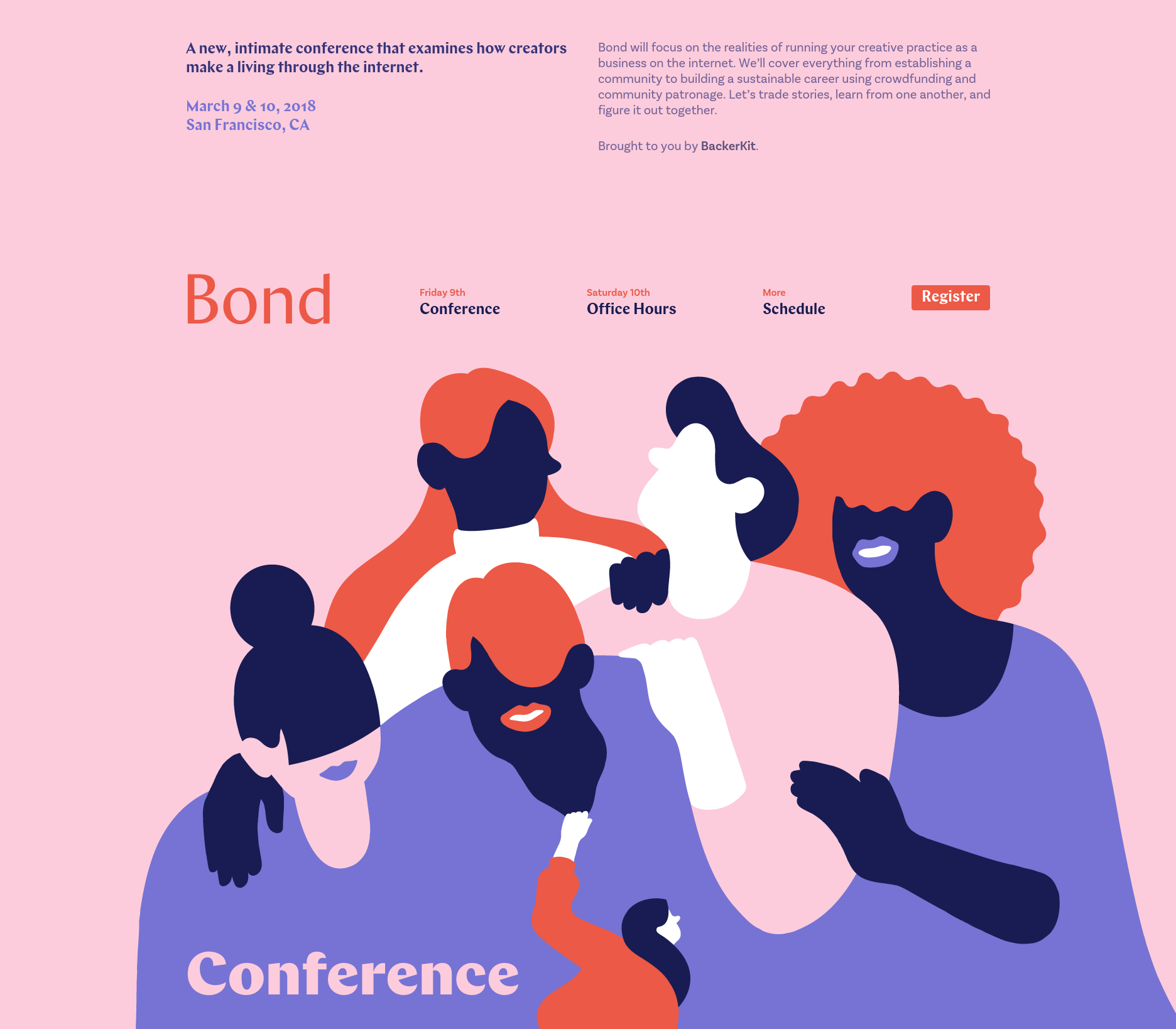 I have no doubts BackerKit, one of the larger crowdfunding platforms, provide a great service. Their website however, is deflatingly boring and generic, featuring the corporo-googlized fun-fun-fun of Open Sans all and everywhere. This year, the company is putting together a conference called Bond, “focus[ed] on the realities of running your creative practice as a business on the internet”. And oh my, the website they made of that — a beaut!