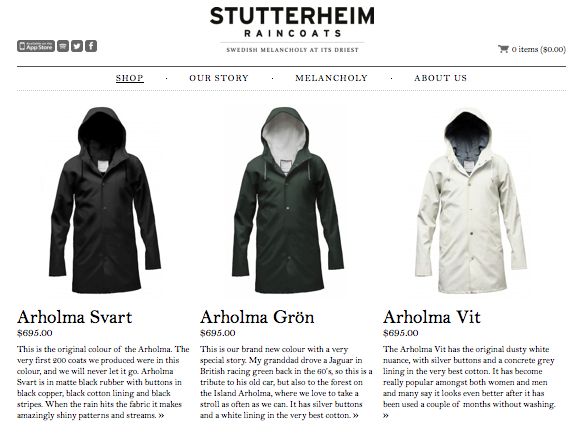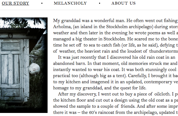 Webtype Blog: “The Swedish company Stutterheim, manufacturer of raincoats, just re-lauched their website using Bell webfonts from Webtype. The transitional English serif is suiting Stutterheim just fine. With numerals this elegant even larger sums look attractive. The design of the website is modest and airy. A good example for how webfonts can gives your site a lot of personality.”