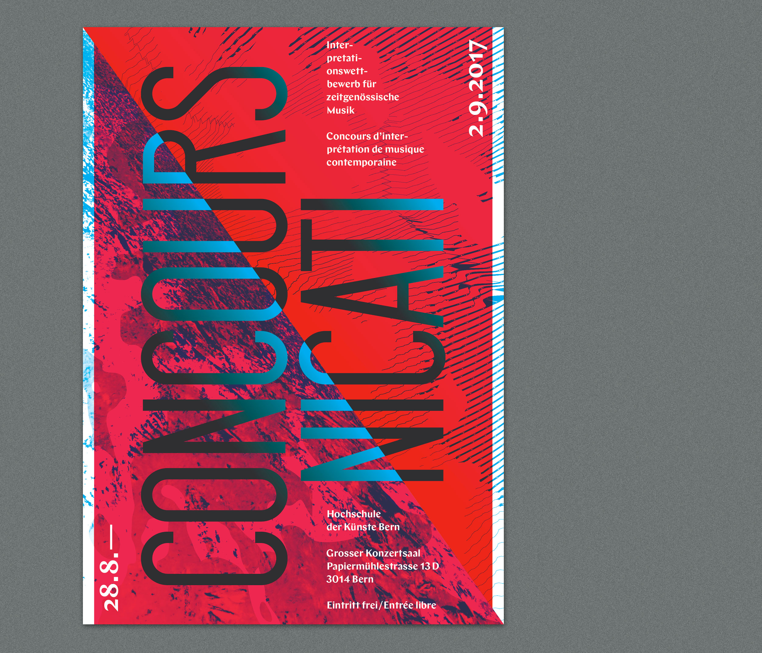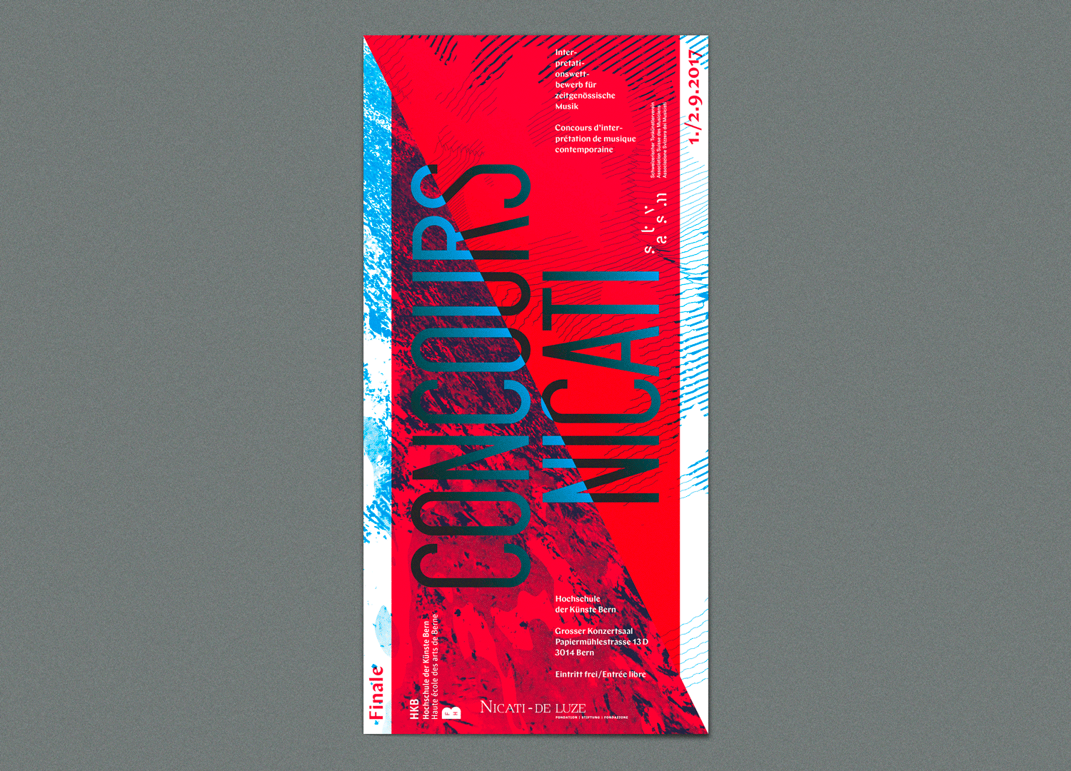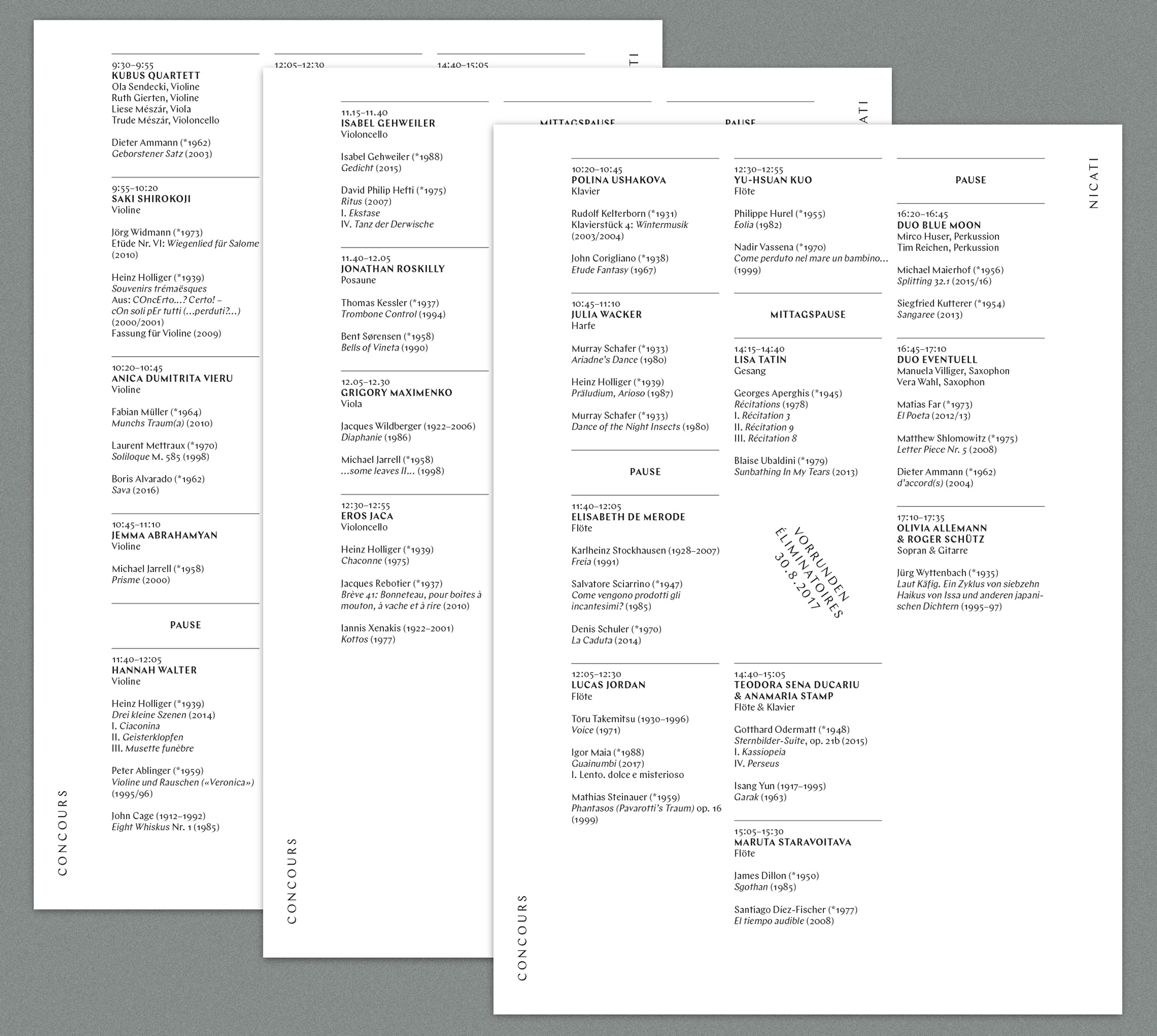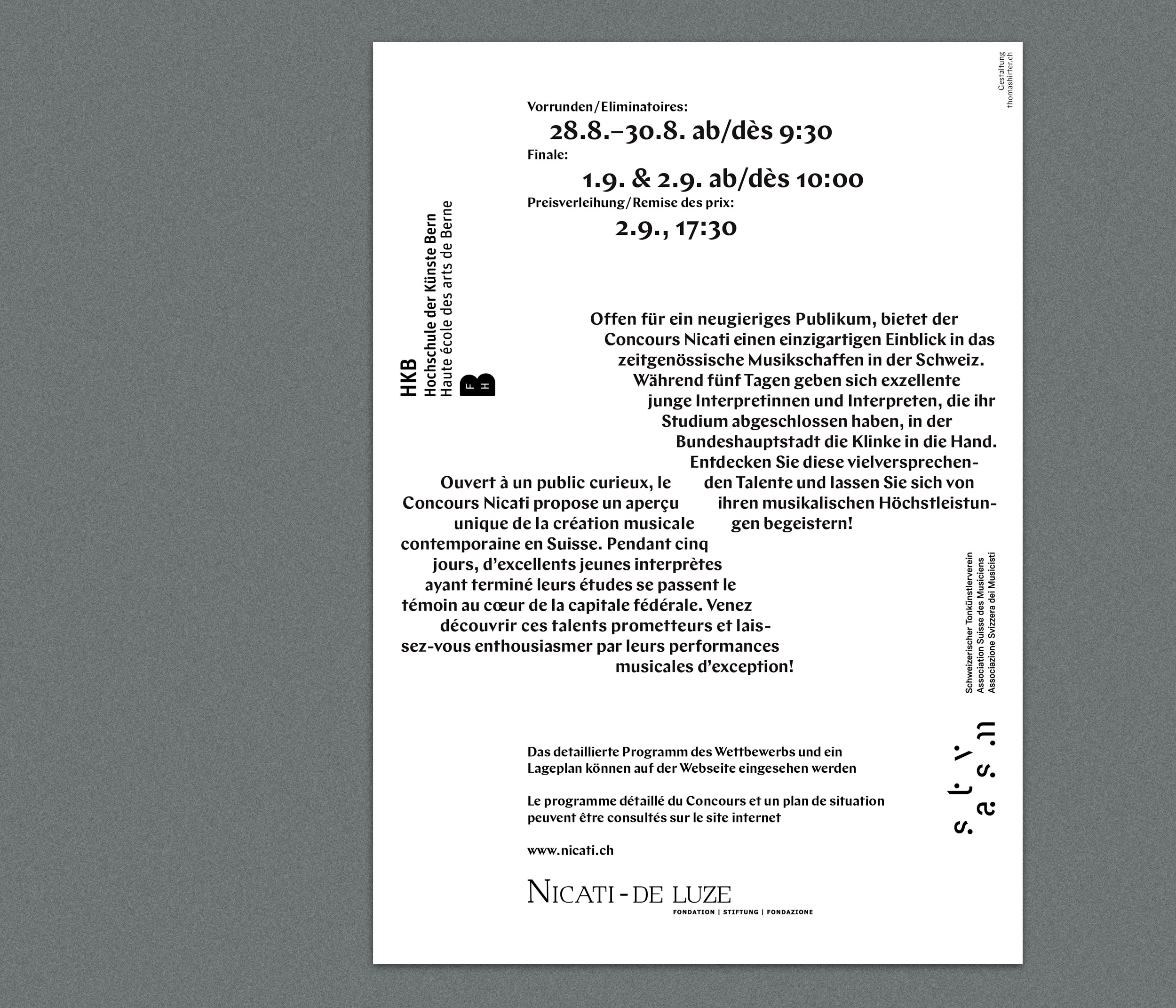 Concours Nicati is a biennial competition in contemporary music held at Hochschule der Künste in Bern, Switzerland. The concept for all graphic material was a diagonal division from corner to corner (symbolizing an imaginary letter N) serving as a grid in various ways. Once the format is devided in two triangles, the text is set on a slope, or the diagonal line makes the grid for typesetting.