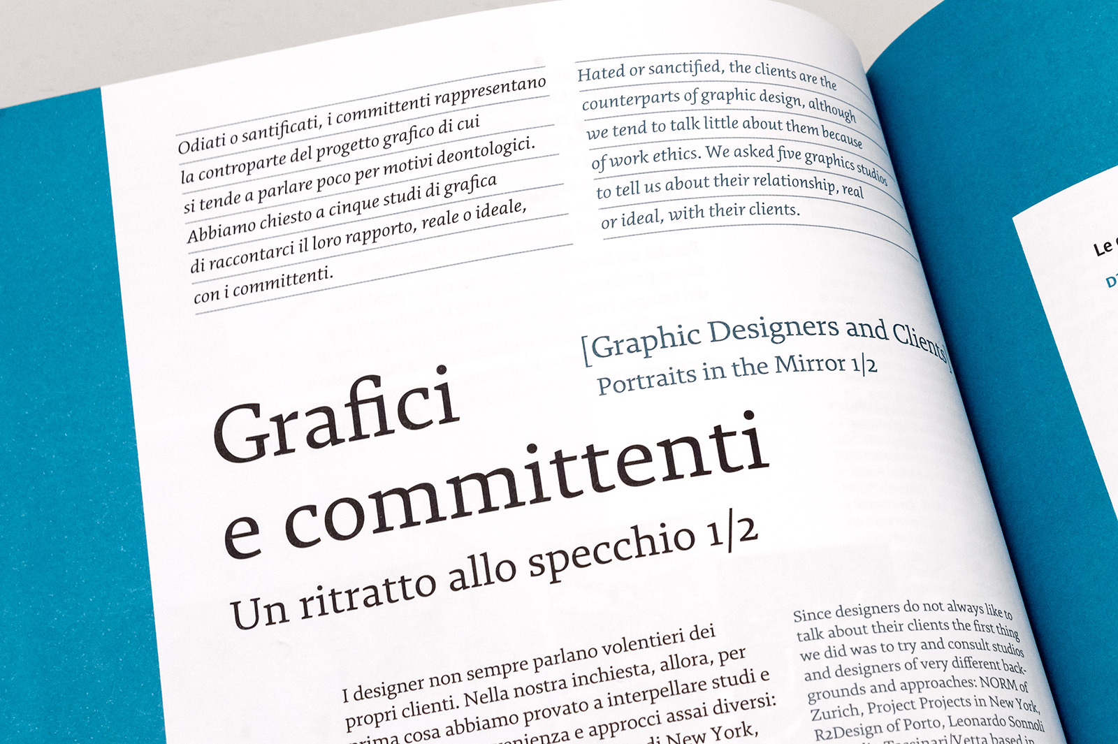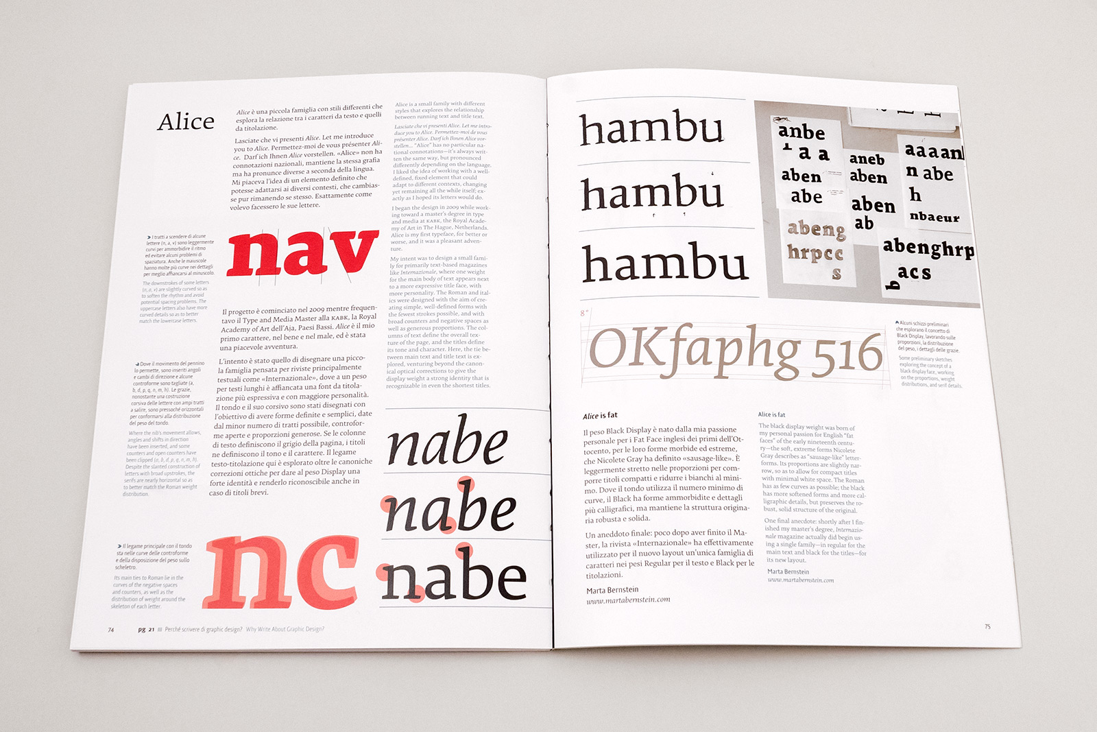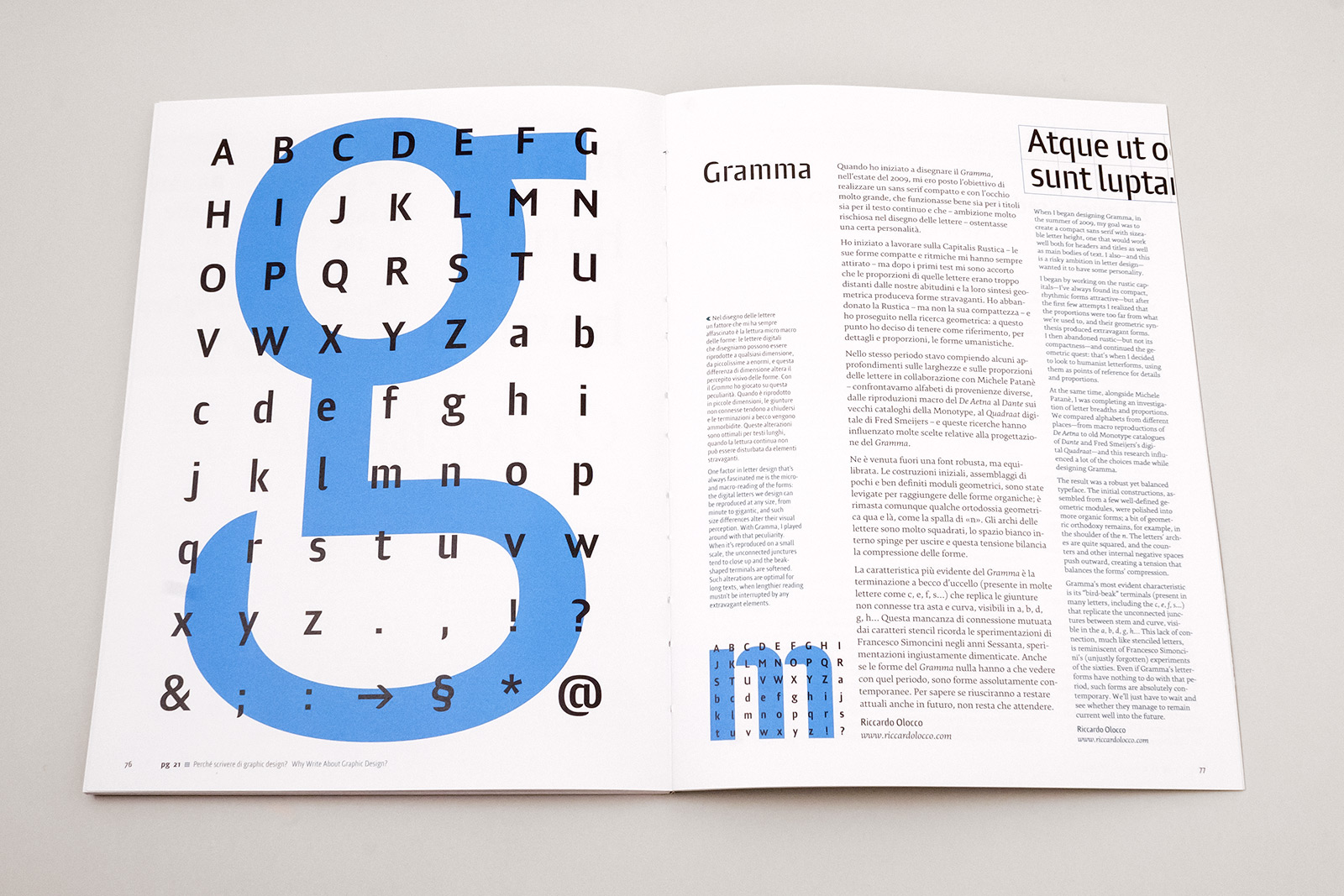 A reference for the culture of visual communication design in Italy since its beginning, Progetto grafico has undergone a renovation in 2012 (since issue #21 until #29) , including a new editorial style, new graphics, new typefaces (Alice by Marta Bernstein and Gramma by Riccardo Olocco) and an English translation of the whole text.