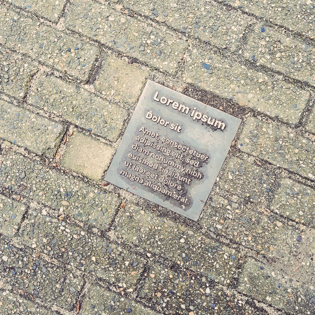 A metal plaque set in the sidewalk somewhere in Amsterdam, with a variant of the classic “Lorem ipsum” dummy text. What is this, a designer’s prank? The memorial of the unpaid copywriter? Or is it fake? Any pointers are welcome.