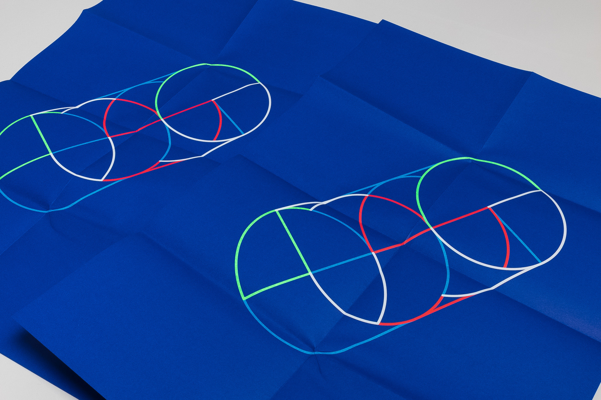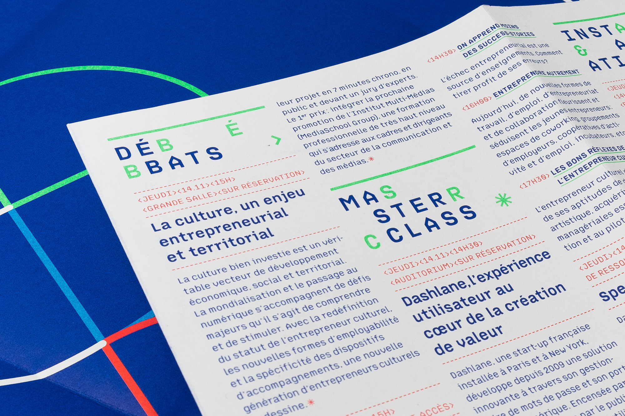 The identity is built around abstract geometrical shapes, a RGB colour palette and an early beta version of Simon Renaud’s Tuner typeface, used across all the communication: program, posters, flyers, illustrations, signage and webdesign. Tuner, although looking monospaced is actually a proportional typeface, but this gimmick allowed Chevalvert to mimick programming code in their design: HTML tags, slashes, dashed lines, duplicates glyphs…