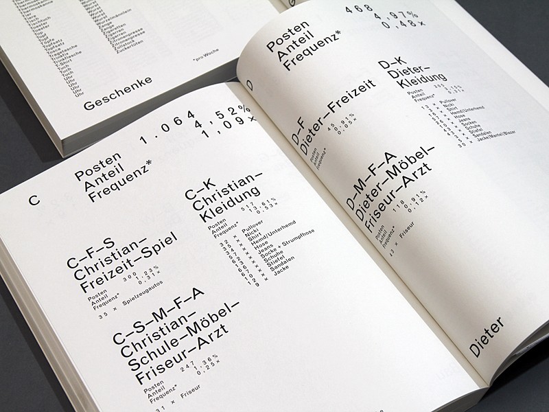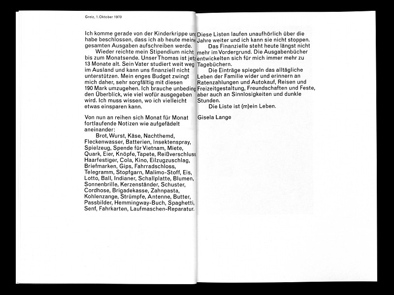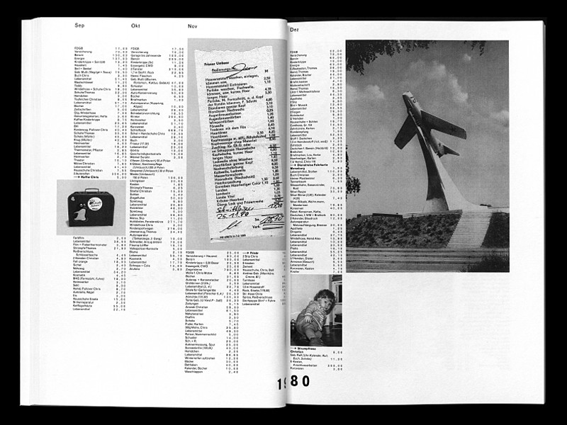 “The publication documents the everyday life of family Lange using meticulously kept cash books. Gisela Lange, the mother of the designer, gathered endless accounts of groceries, taxes, parties, leisure activities, clothes or presents with an exact price index. To complement the cycle of this everyday life narratively, the first 18 years of life, from 1979 to 1997, were analyzed and summarized in appropriate categories. Brief explanations and interviews with protagonists of the list illustrate important moments. A series of family photos, pictures of products, certificates and receipts add to the family’s archive.
