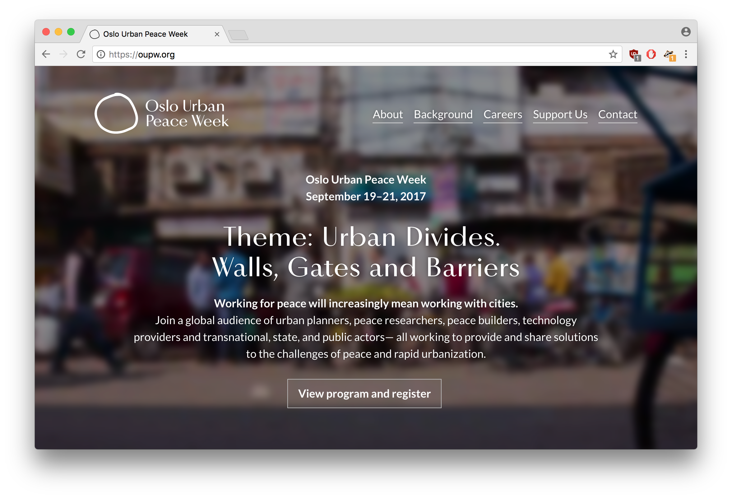 is a non-profit organization, which will facilitate and host an annual Oslo Urban Peace Week (OUPW), gathering urban planners, peace researchers, peace builders, technology providers and transnational, state, and public actors. OUPW will invite stakeholders from all over the world to participate – all with the common goal of rebuilding our cities for a better future.