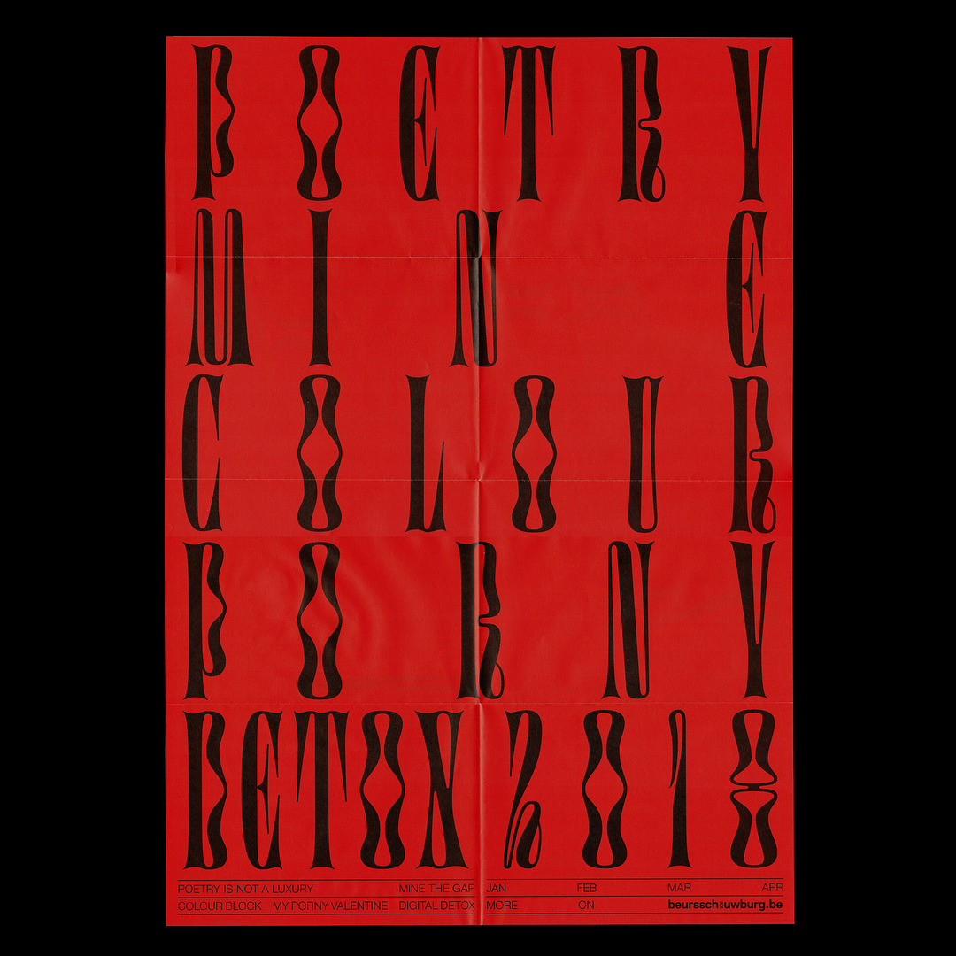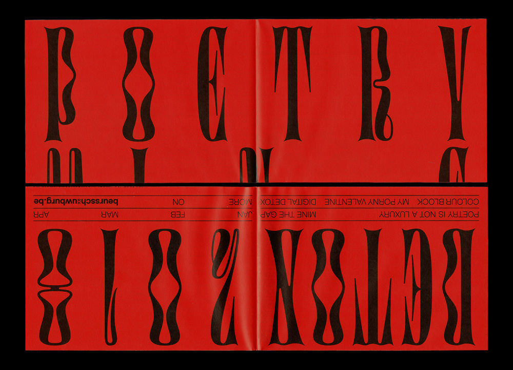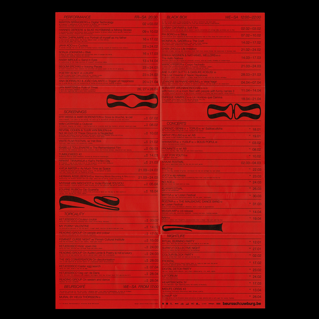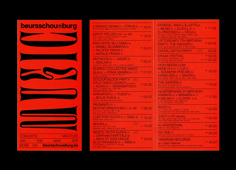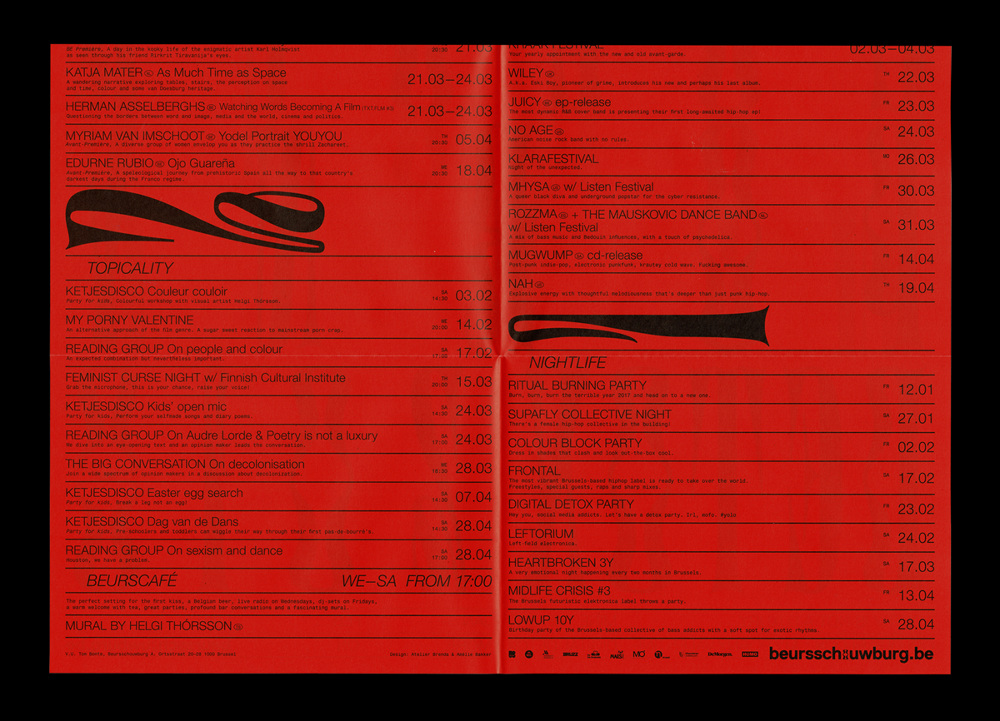 Beursschouwburg 2018 program Contributed by Jérémy Landes (Studio Triple) on Feb 16th, 2018. Artwork published in January 2018. Source: www.atelierbrenda.com Atelier Brenda. License: All Rights Reserved. Atelier Brenda and Amélie Bakker make extensive use of the Digestive typeface for the 2018 program of Brussels’ Beursschouwburg. This program serves as the basis for the art center’s identity for the following year. Source: www.atelierbrenda.com Atelier Brenda. License: All Rights Reserved. Source: www.atelierbrenda.com Atelier Brenda. License: All Rights Reserved. Source: www.atelierbrenda.com Atelier Brenda. License: All Rights Reserved. Source: www.atelierbrenda.com Atelier Brenda. License: All Rights Reserved. Source: www.atelierbrenda.com Atelier Brenda. License: All Rights Reserved. Typefaces More about DigestiveGet DigestiveMore about HelveticaGet Helvetica Formats Posters/Flyers (5655) Booklets/Pamphlets (2364) Topics Art (4581) Local (1524) Performing Arts (974) Designers/Agencies Atelier Brenda (8) Amélie Bakker (1) Tagged withBeursschouwburg (3)programs (625)red and black (1126)red (816)big type (1709)stacked and justified (640)rotated type (2181)numerals (1058)wall of type (258)loose letterspacing (415)condensed face with loose letterspacing (18) Artwork location Belgium (424) Brussels (123) In SetsFuture Fonts (James Edmondson (OH no Type Co.)) (526)cool (Karo Konieczna) (871)FOSSE VERDON (fei) (47)Valley (Oliva Rawlings) (57)NEWSPRINT (Oliva Rawlings) (29)Unique Font (Studio C u b e Y) (155)inspiration (Salomé Salome) (31)störung (Salomé Salome) (41)NEUE MIX (Costas Aggeletakis) (14)Pairings (Lucas Bevilaqua) (578)Beautiful Typesetting (Lucas Bevilaqua) (684)Favourites (Lucas Bevilaqua) (1150)unsorted (Mia George) (7)poster (Philippe Lepilleur) (342)fajny projekt (Emilia Kora) (5) Post a comment Name Email – will not be published Website Your response Submit Comment More Digestive in use The Party by Ostbahnhof presents VERS: Anything Goes, October 20192019Angello TorresContributed by Angello Torres Thomas Kosmala Paris2018ConcreteContributed by Jérémy Landes (Studio Triple) Staff Pick Taverne Tour 2019c. 2019Emile Lord AyotteBianca NappiVéronique LafortuneContributed by Eva Silvertant Staff Pick Sponsor More in Local Ngóc Ngách exhibition2024Xôn Xao StudioMinh ThốngNu NguyễnContributed by Xôn Xao Studio Elgol Hallc. 1997unknownContributed by Florian Hardwig Sunday Paper, Issue 052018Pseudo FriendsContributed by Ben Nelsen GreeNYC2022Once-Future OfficeContributed by TypeType More in Booklets/Pamphlets Human Rights Festivalc. 2017Two Digs StudioContributed by JAF GDV identity and magazine (2018 redesign)2018twotype designContributed by TypeMates Staff Pick Telemark County, Norway2013SnøhettaContributed by Frode Helland (Monokrom Skriftforlag) Your Spot LA identityc. 2021Augusto Piccio IVContributed by Chloë Miller More Fonts In Use Borussia Dortmund rebranding (2024)c. 2024DesignStudioContributed by Blaze Type Staff Pick Emigre #28: Broadcast1993Gail SwanlundBarbara GlauberContributed by Stephen Coles Staff Pick The Eye of the Queen by Phillip Mann (Arbor House)1983Loretta TrezzoContributed by Florian Hardwig Staff Pick Mondaine Helvetica watch series2014Martin DrechselContributed by Indra Kupferschmid Staff Pick