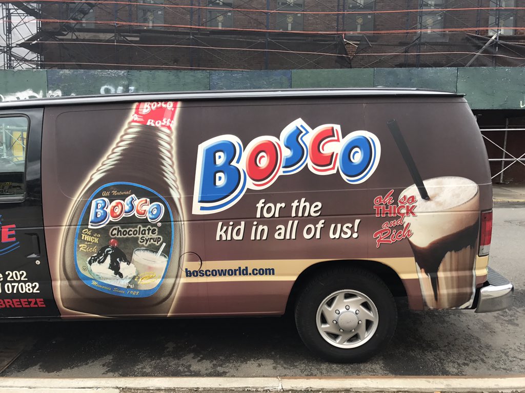 Chocolate syrup manufacturer Bosco definitely isn’t shy of font choices that make the type elite shudder. BOSCO for the kid in all of us! On the van depicted above, they went whole hog and applied some slanting, outlining, and 3D effects. Oh so THICK and Rich. (Is that the ‘A’ from Script MT rearing its monocular head in “All Natural”? Why?)