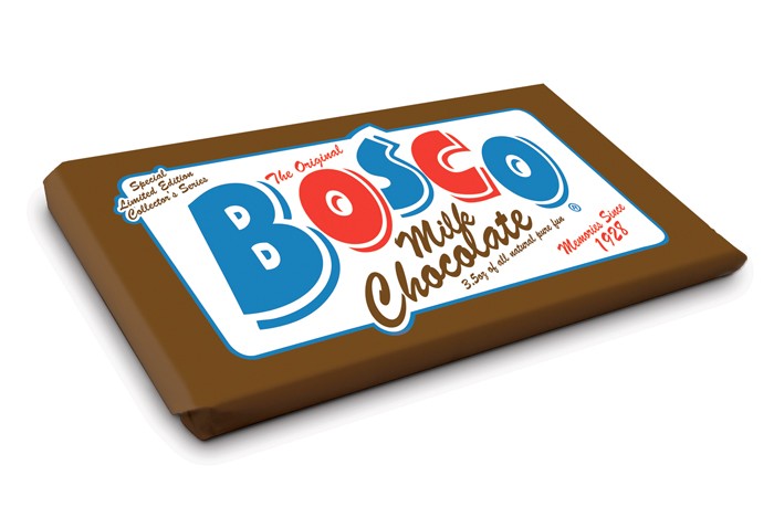 The logo is in Bertram, a jolly all-caps face designed by Martin Wait for Letraset. A digitized version came bundled with CorelDRAW in the 1990s. The chocolate bar packaging below demonstrates that it can look almost classy, without the extra effects, and with a limited number of accompanying fonts.