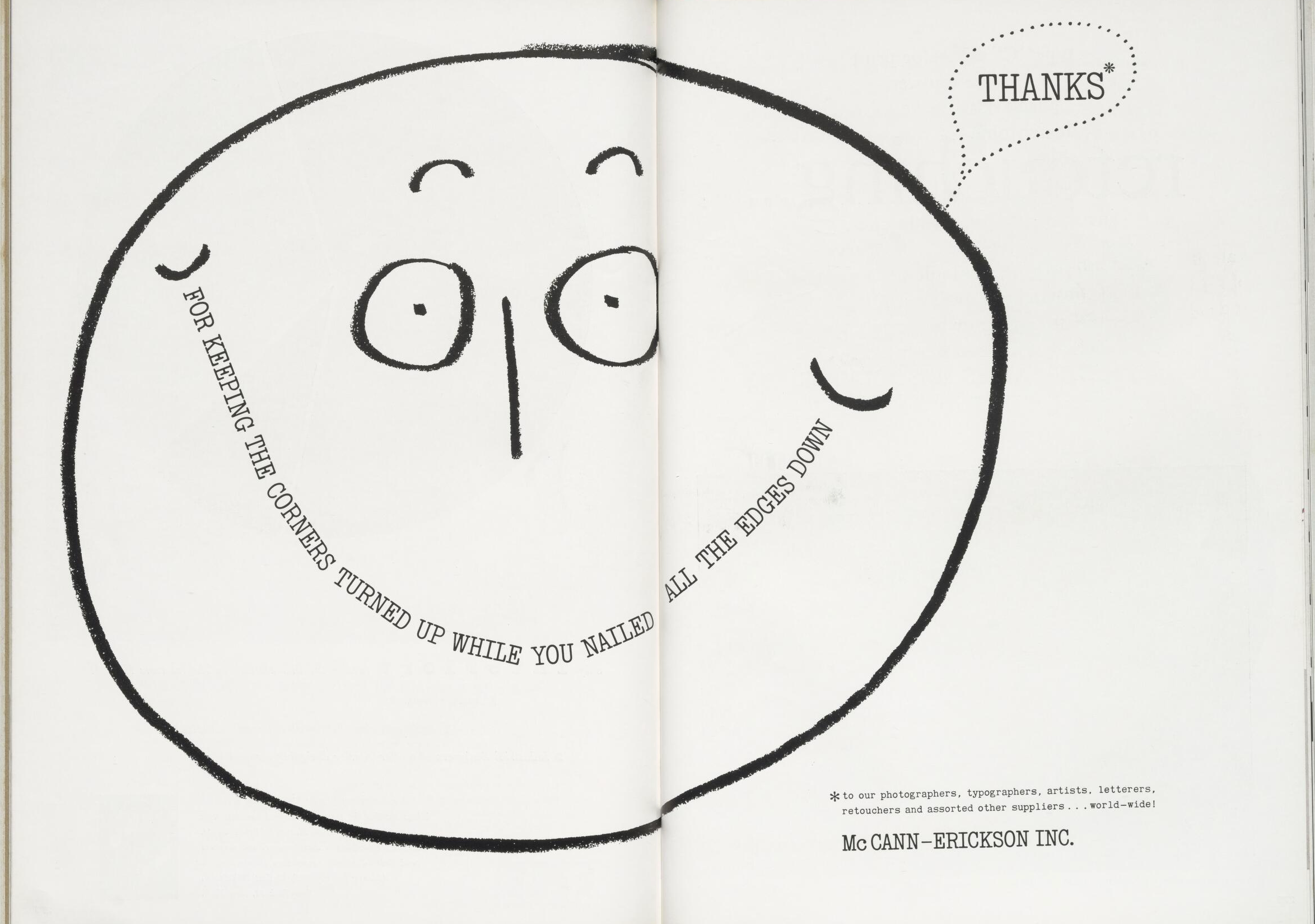 McCann-Erickson Inc. ad: “Thanks” Contributed by Stephen Coles on Feb 23rd, 2018. Artwork published in 1958. Source: magazines.iaddb.org Image: International Advertising & Design Database. License: All Rights Reserved. Ad in the 37th Annual of Advertising and Editorial Art and Design of the Art Directors Club, 1958. Typefaces More about Bulletin TypewriterGet Bulletin Typewriter Formats Advertising (2102) Topics Graphic Design (2985) Designers/Agencies McCann (1) Tagged withadvertising annuals (9)McCann-Erickson (1)type on a curve (1108)all caps (7502)asterisk (*) (232)speech balloons (174)smile (41)black and white (2003)type integrated with image (438) Artwork location United States (9840) New York City (2890) In SetsPHANTA (Leonardo de la Fuente) (285) Post a comment Name Email – will not be published Website Your response Submit Comment More Bulletin Typewriter in use Space City News, vol. 1, no. 1 (Jun 5 1969)1969unknownContributed by thankyoucokieroberts Paul McCartney & Wings – “Junior’s Farm” / “Sally G.” German single cover1974unknownContributed by Garrison Martin Memories of Underdevelopment: The Revolutionary Films of Cuba1973Aileen FriedmanContributed by Stephen Coles Sponsor More in Graphic Design Counter Acts: Type & Lettering on Film & Video poster/brochure2023Type SyndicateBenjamin TuttleContributed by Benjamin Tuttle Typojanchi 20192019Myungsang YuJin DallaePark WoohyukContributed by Benoît Bodhuin items Magazinec. 2004Studio DumbarContributed by Shiva Nallaperumal Staff Pick Scènes antiques2018Arthur CalameContributed by 205TF More in Advertising Breaker visual identity2019OrderZach LiebermanContributed by WELTKERN® Typefaces Nike Women2023NikeTricia ChamberlainEmily LemmerContributed by Bureau Brut Play Farm Animal Collection advertisement1971unknownContributed by Bryson Stohr Kodak Ektralite camera ads, 1978–19811978unknownContributed by Felix Nic Staff Pick More Fonts In Use 2021 WithPrint Calendar 2021Believe inContributed by Mark Bloom Staff Pick Contrasts: Music Minus One album artc. 1969Stan ChamberlainContributed by Herb Lubalin Study Center Staff Pick Ladies And Gentlemen We Are Floating In Space by Spiritualized1997Farrow DesignContributed by Love Lagerkvist Staff Pick Meloman magazine, No. 2, summer 20182018Kirill GluschenkoContributed by Kirill Gluschenko Staff Pick