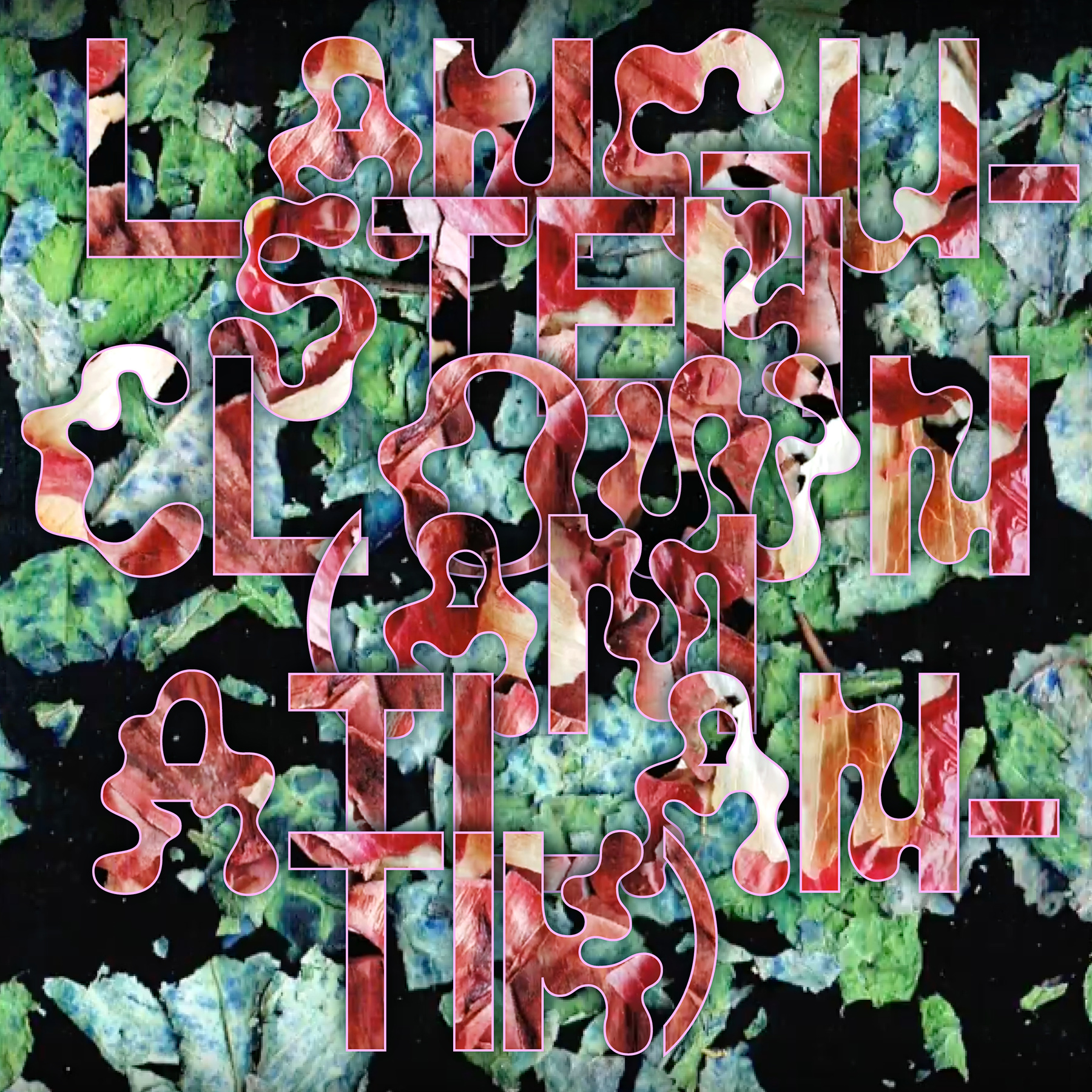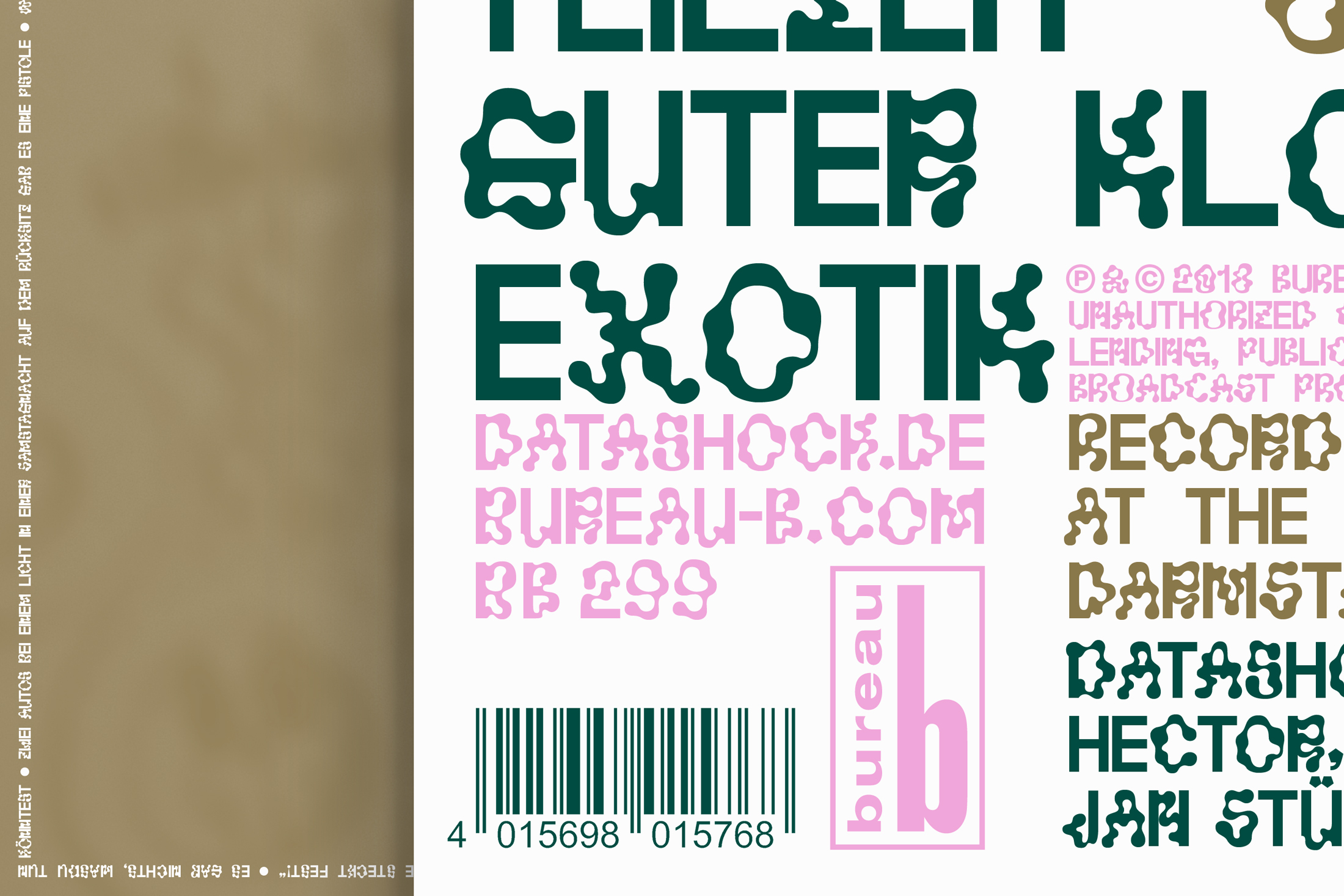 The gatefold double LP is printed in three colors (PMS Gold, Pastel Rose and Hunter Green) on glossy cardboard. The front cover shows a golden Messiah-like figure (a Datashock guitar hero at age 19). The typography uses Lÿno Jean throughout. This typeface, designed by Karl Nawrot and Radim Peško between 2009 and 2012, is set in various colors, sizes and interlocking grids for all media. The Lÿno typeface family was introduced in the booklet Newer alphabets: Another introduction for a programmed typography, itself a supplement of Korean magazine Graphic #16, “Type Archive Issue” (Winter 2010). James Langdon wrote: