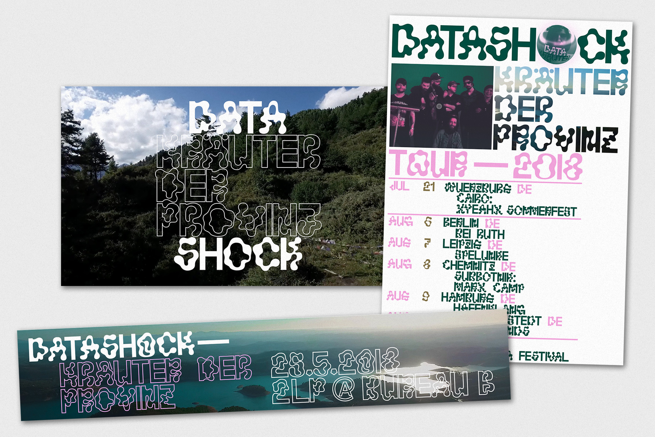 Further design work for the Kräuter release includes a tour shirt, printed in 2 silkscreen colors, and numerous digital flyer or banner files for social media usage and their bandcamp page. All of them derived — some more, some less — from the original LP artwork and all of them, of course, use Lÿno Jean only.
