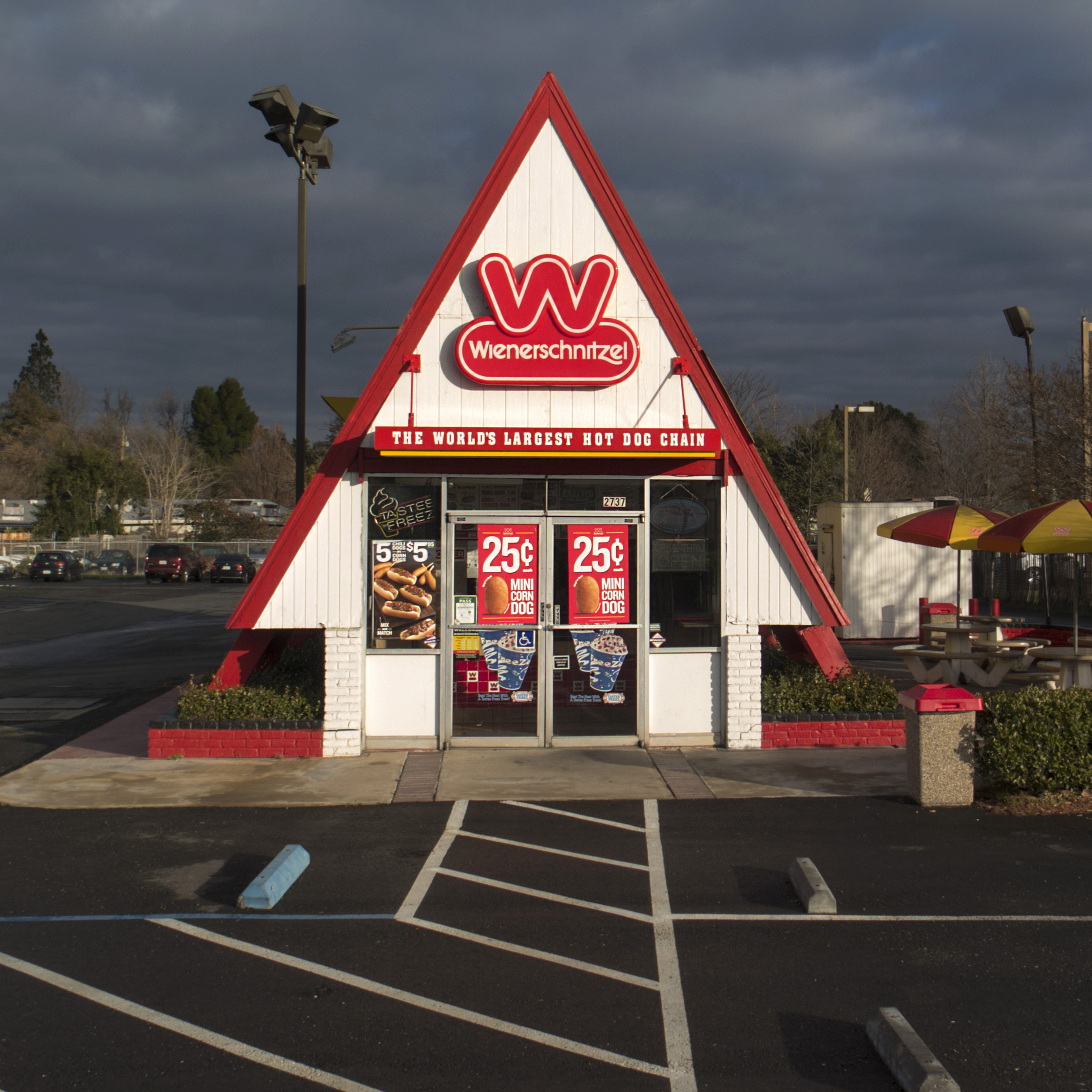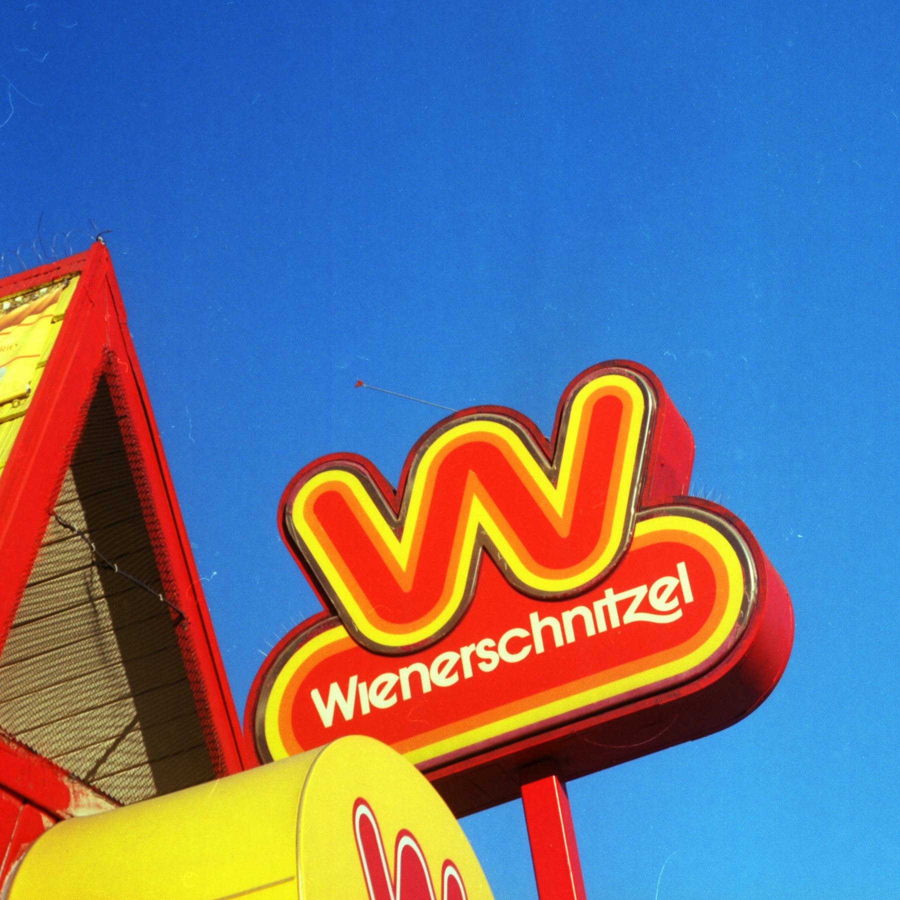 Founded in 1961, Wienerschnitzel is an American fast food chain that specializes in hot dogs (despite the fact that an actual wiener schnitzel has nothing to do with sausages). Saul Bass designed a logo for the company in 1978 and it has mostly survived on all franchise signage ever since. The rounded ‘W’ is most likely custom lettering, but (appropriately) closely resembles Frankfurter. For “Wienerschnitzel”, Bass used ITC Avant Garde Gothic with alternate ‘e’s and ‘c’ as well as a custom swash ‘z’.