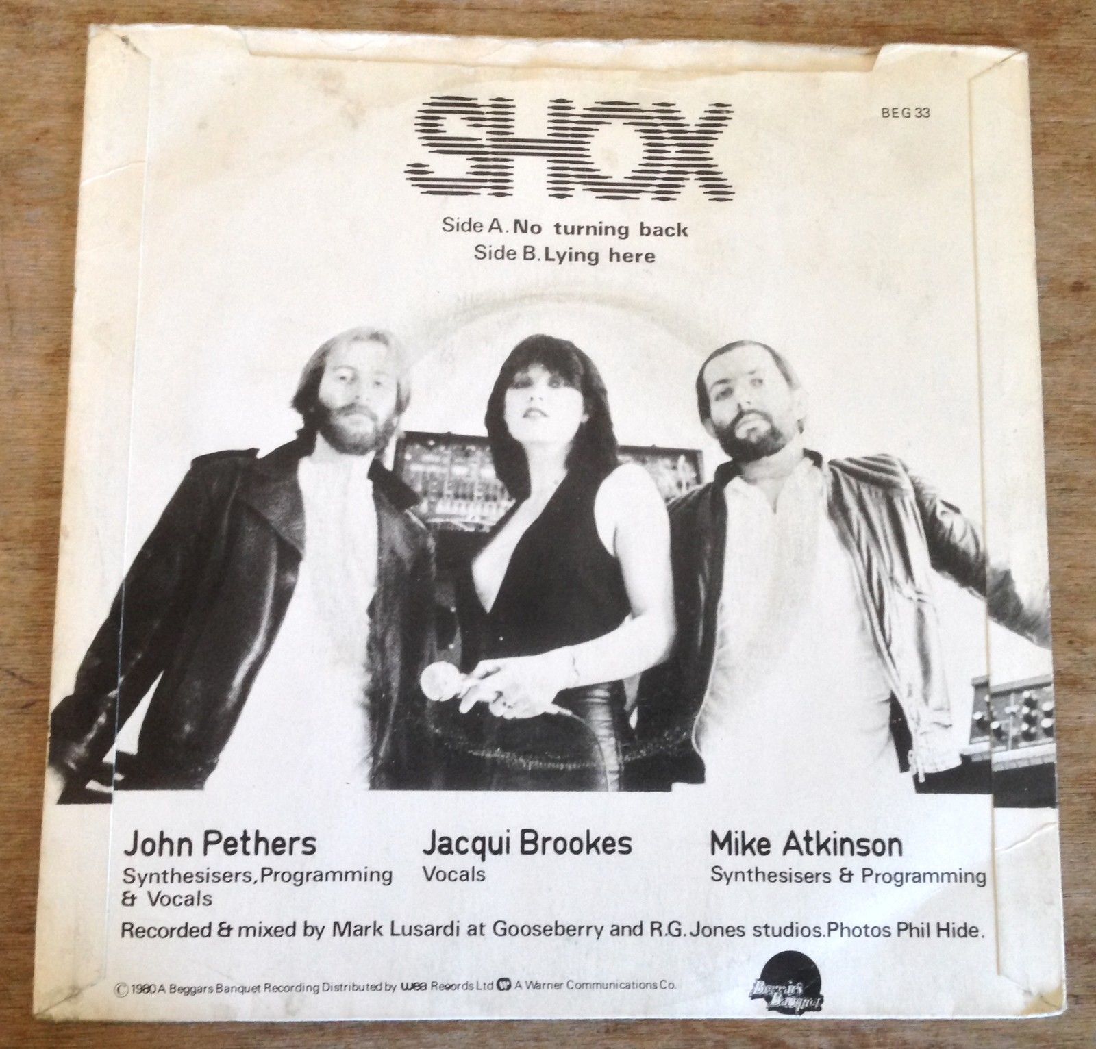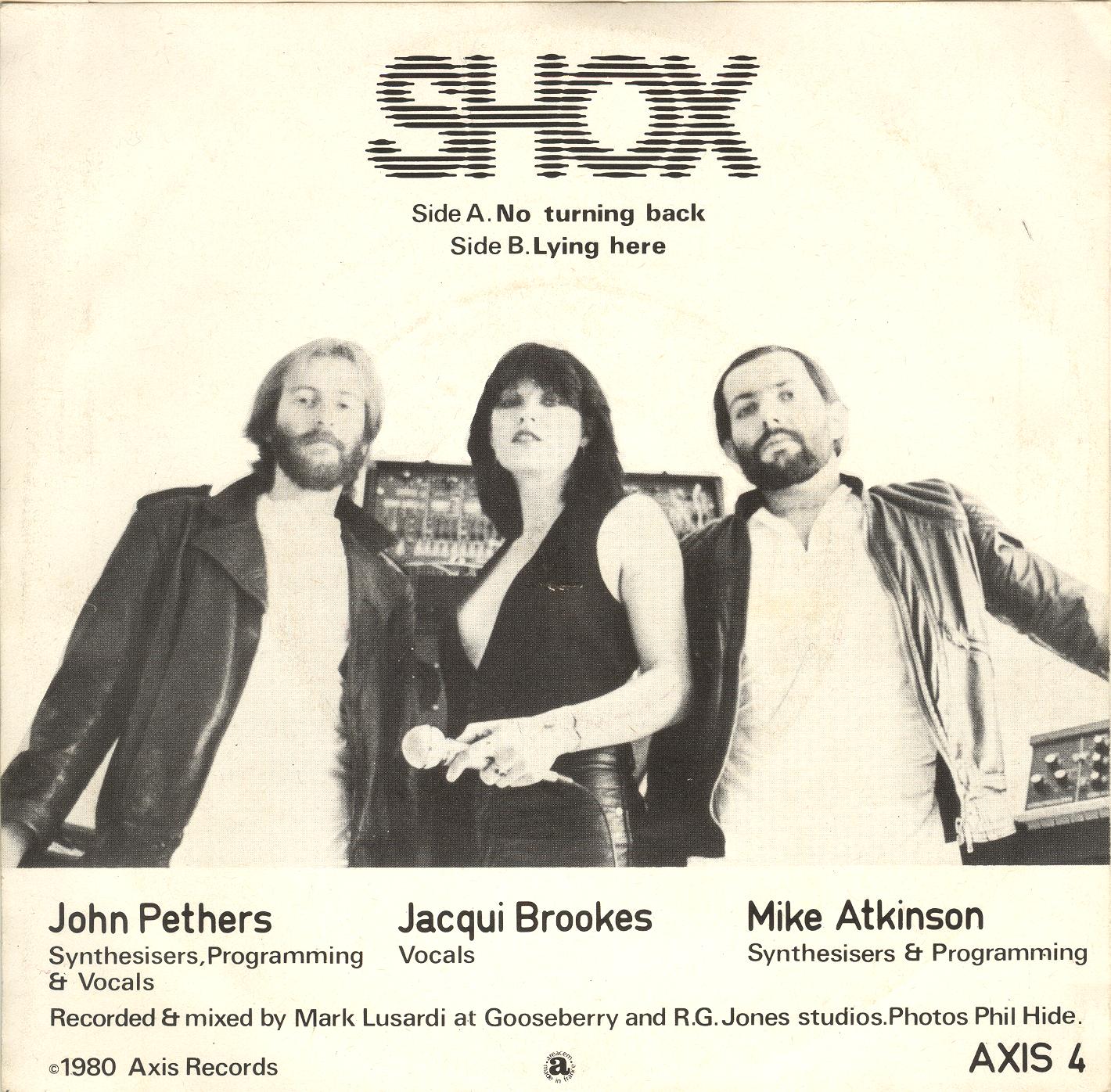 Shox were a post-punk trio comprising Mike Atkinson, Jacqui Brookes and John Peters. Their sole release was [this single] issued on the pre-4AD label Axis. Pop with an electronic twist, it was likened to early Human League by the NME. … Was one of the four singles released by Axis, the Beggars Banquet off-shoot that would be renamed 4AD later in 1980. This single was later reissued directly on Beggars Banquet.