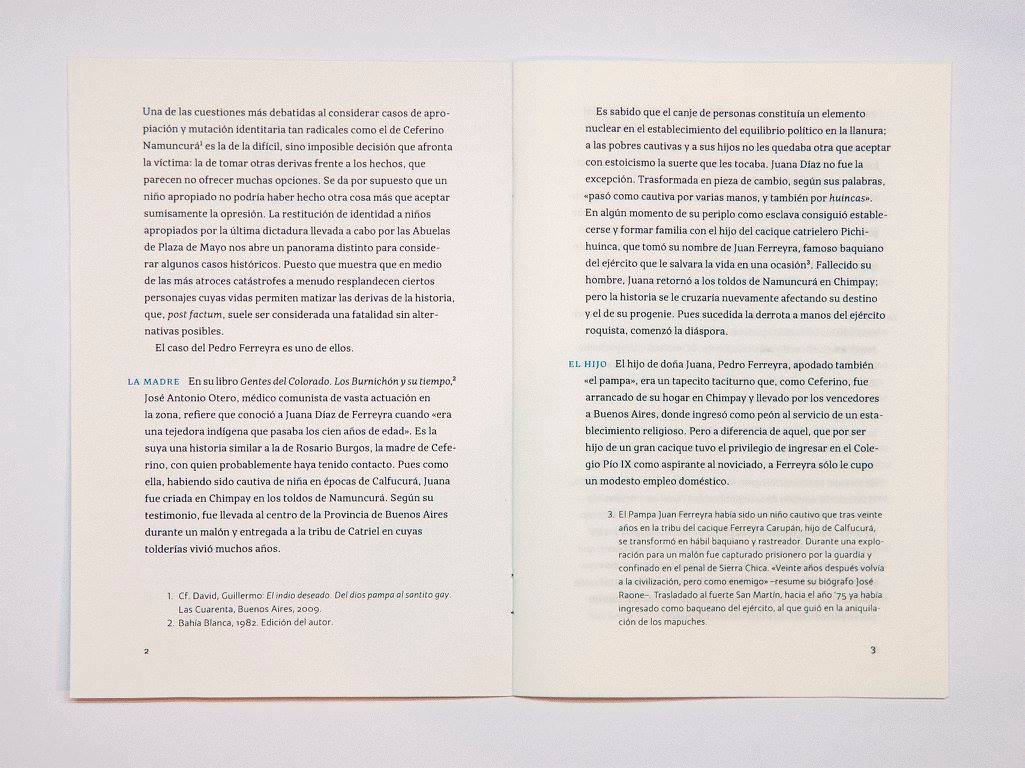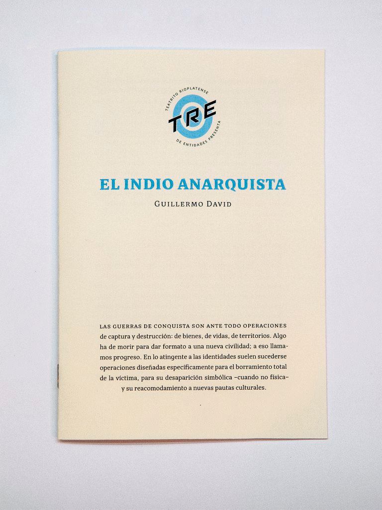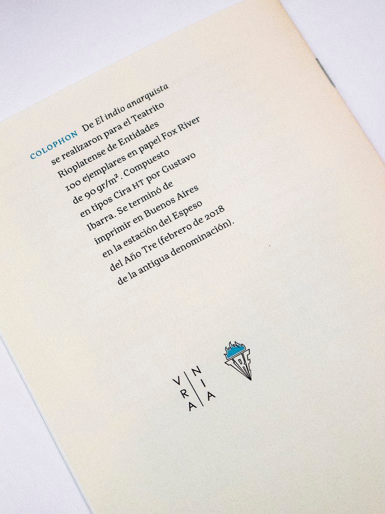 El indio anarquista is printed in a limited edition of 100 copies, made for the Teatrito Rioplatense de Entidades. It was composed in Cira HT by Gustavo Ibarra, and consists of 12 pages measuring 14×20 cm.