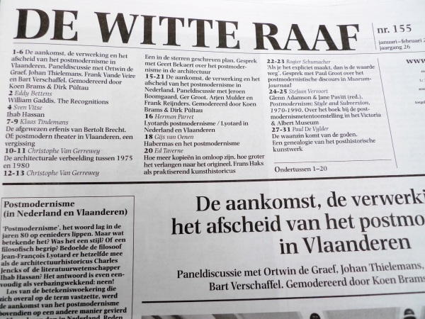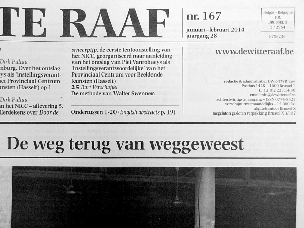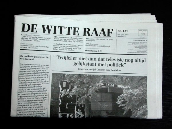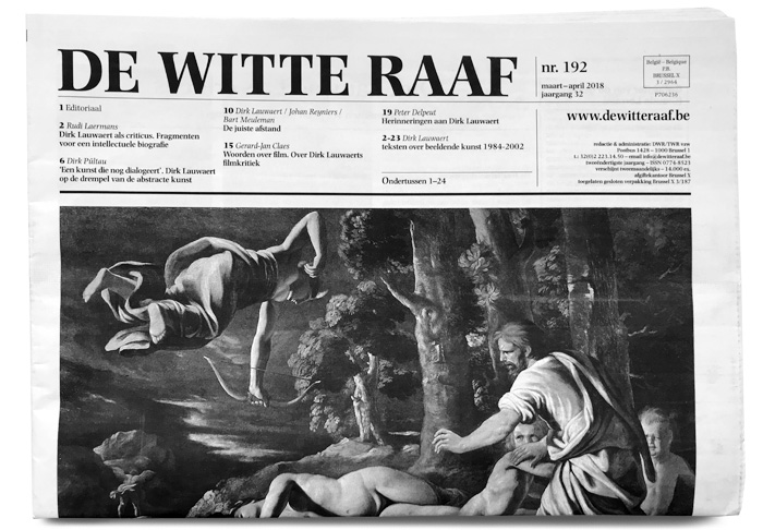 De Witte Raaf (“The White Raven”) is a bimonthly art journal published in Brussels since 1986. Printed in an edition of more than 15,000 copies, it may be picked up for free from over thousand distribution points in Belgium and the Netherlands.