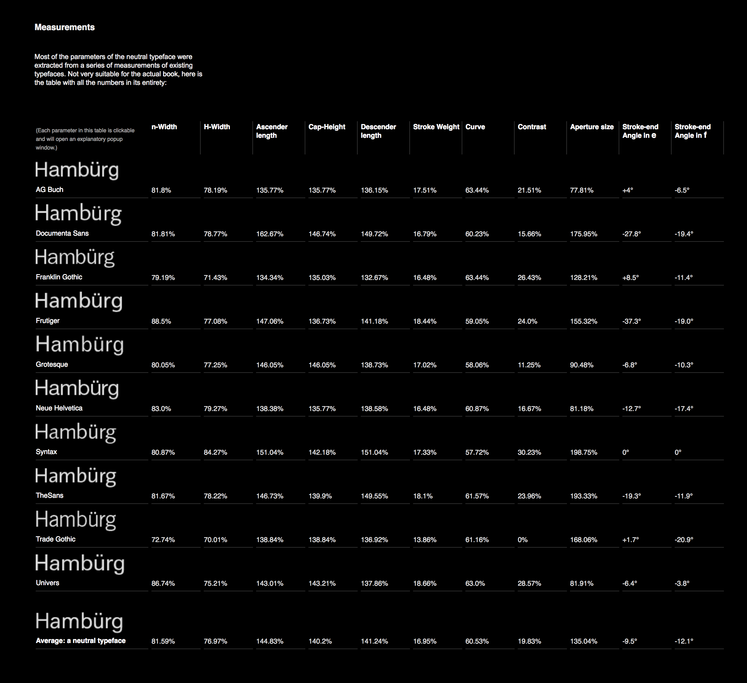 Measurements from a variety of Grotesque and Humanist sans serifs were the initial basis for Kai Bernau’s Neutral type design.
