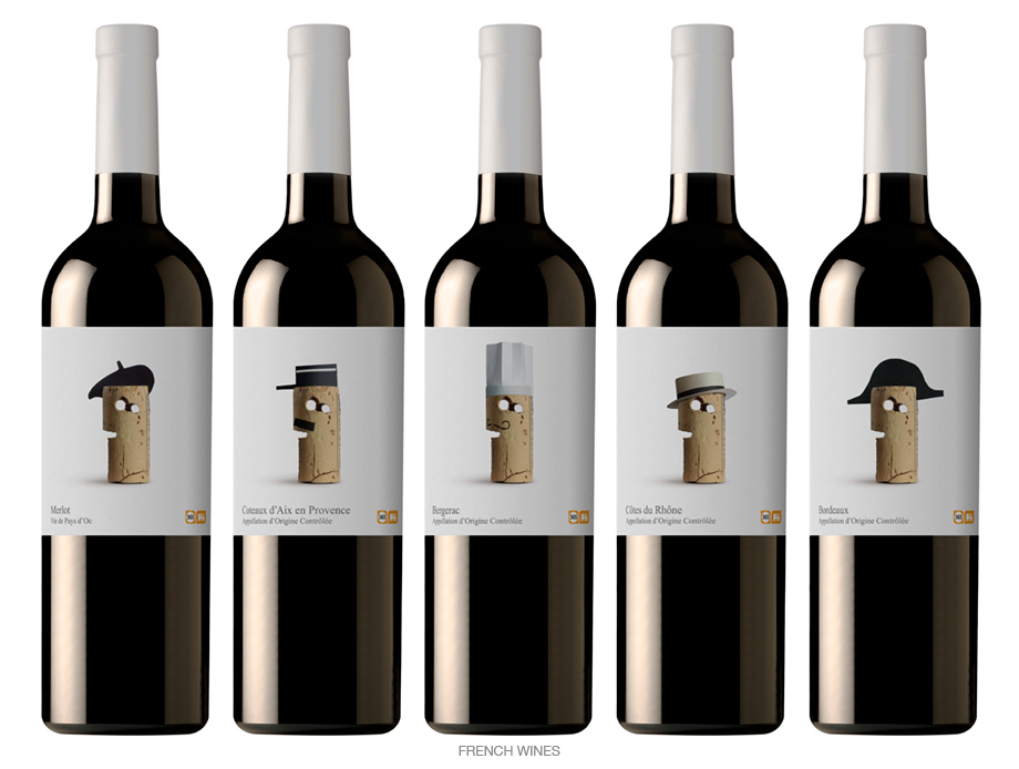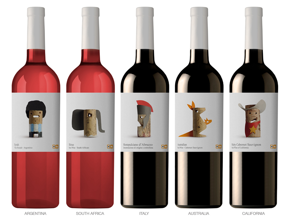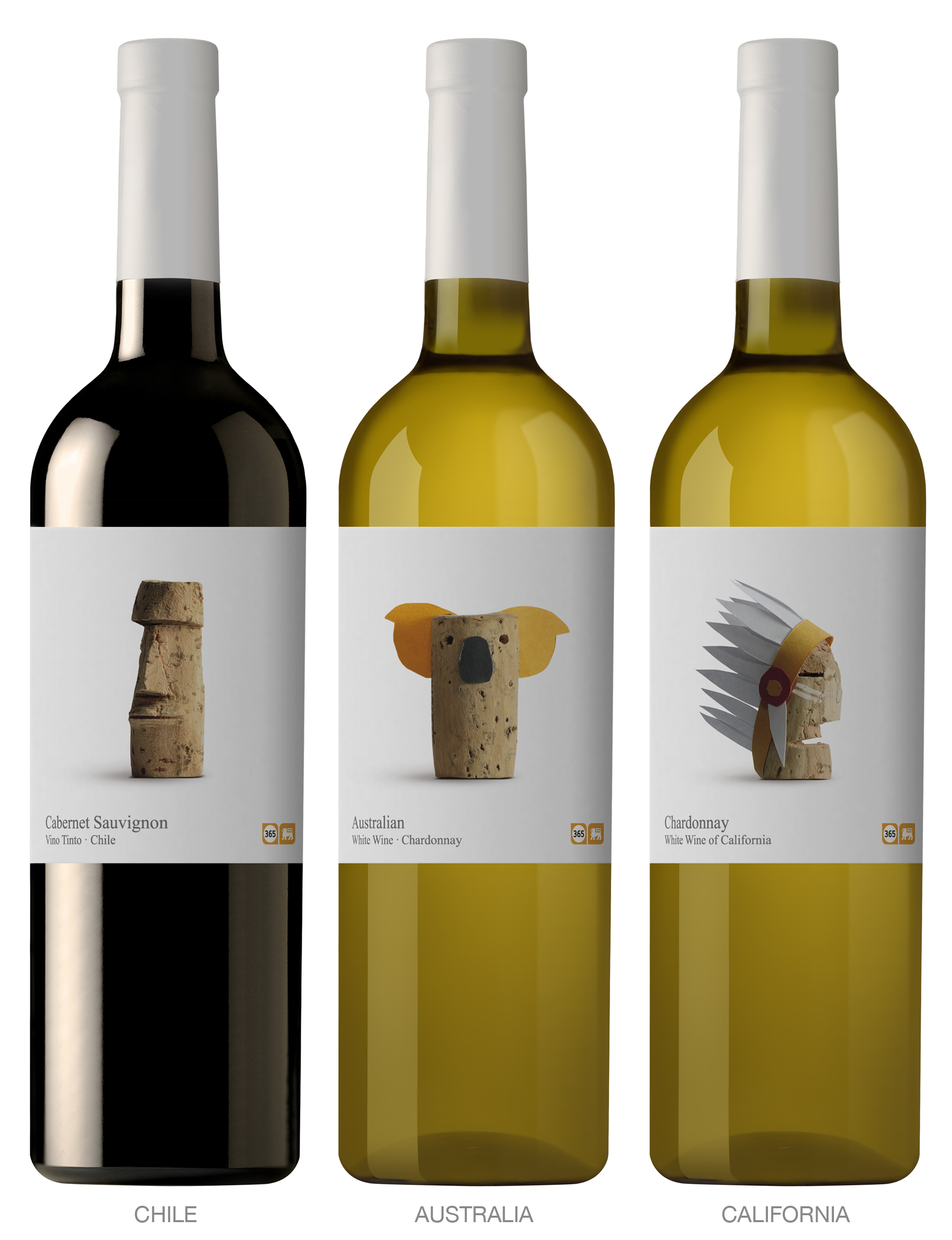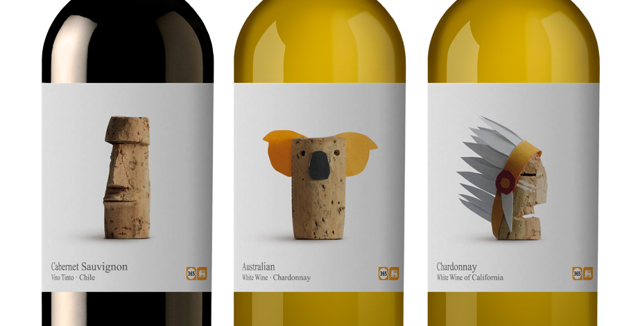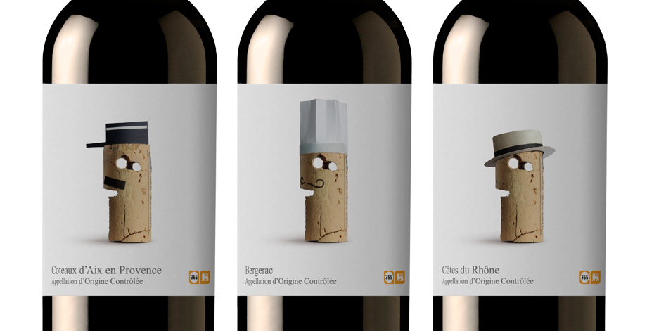 This is a range of wines that Belgian supermarket chain Delhaize offers within its own brand “365”, which includes simple, everyday products at affordable prices. The cork is a sign of humility, an object of little value, often used as craft material, as a simple and easily manipulated element with which to play and create. The use of cork gives it the air of something simple, typical of an everyday product. The cap is the element that unifies and personalizes the whole range. The motif designed for each label refers to the country of origin.