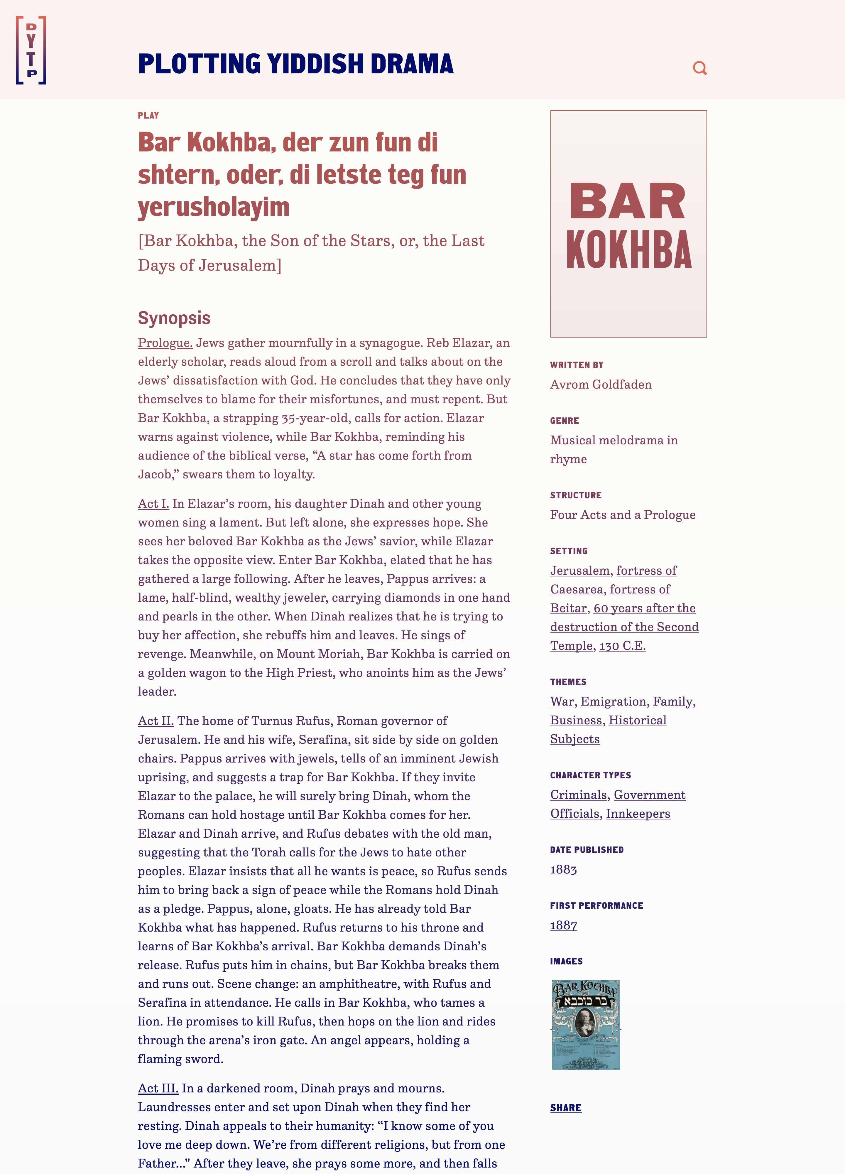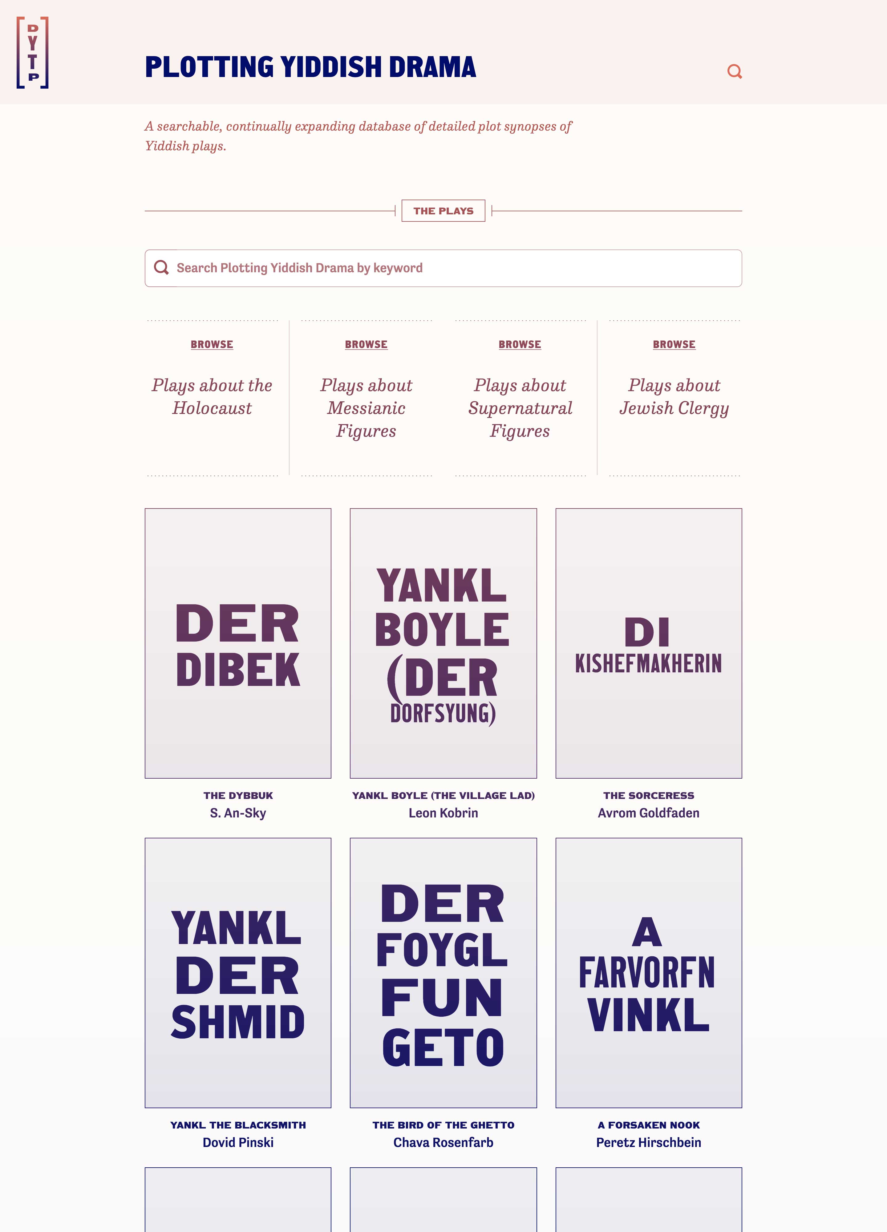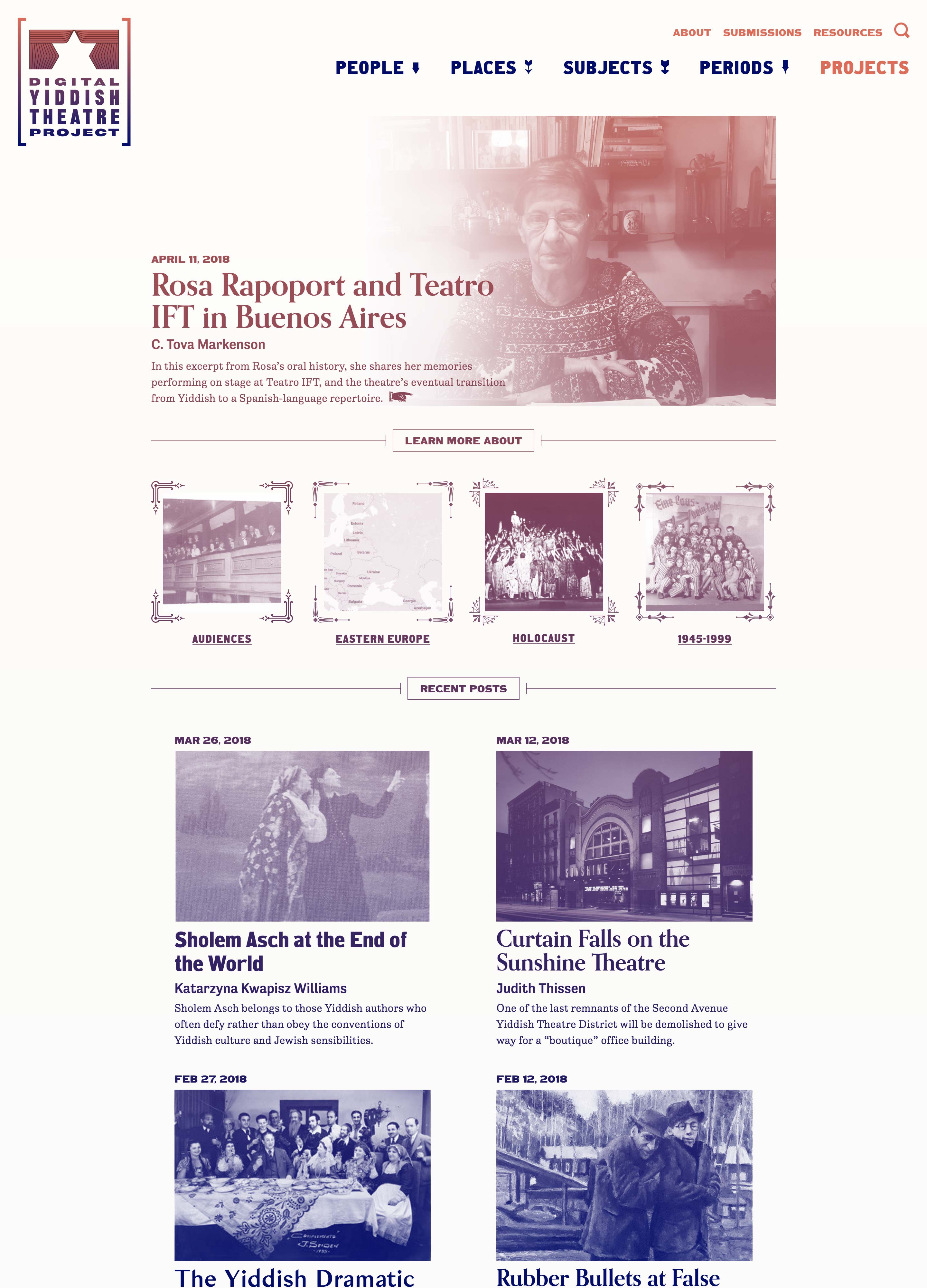 The Digital Yiddish Theatre Project is a consortium of academics and researchers dedicated to exploring new approaches to historical scholarship made possible by digital analysis. A goal on the project was to consciously call back to the visual history of Yiddish theatre performances in ways that felt fresh and engaging, and are only possible because of new technology on the web. The approach to designing their identity and website was to clearly acknowledge historical influences and make use of them.