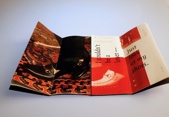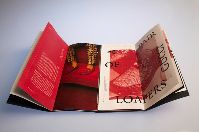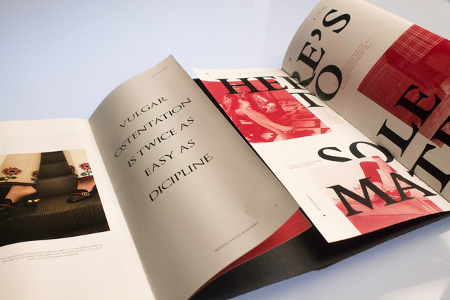 White Soled Platform Boots is a project for typography class. It is also the marriage of two essays, the first of which The Crystal Goblet by Beatrice Warde, and the second a short essay of my choosing. I chose Life Goals and Loafers: A Love Story by Christene Barberich. The essay I chose contradicts the notion of physical adornment adding excessive information to the content at hand. With a two book binding system, I hope readers to treat the book like a paper doll, feeling free to ‘dress’ their reading experience however they wish, and to find joy in the control of physical adornment.