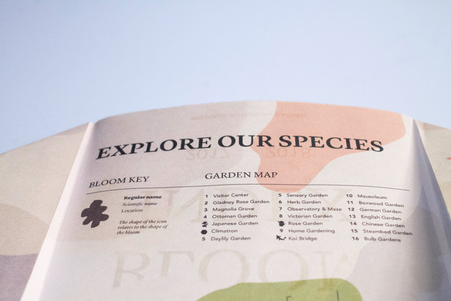 Student project. A fold-out paper piece, done to help educate visitors of the Missouri Botanical Gardens about which flowers are in bloom each season. The shapes were traced from the bloom shapes from each species of plant/flower, to help create a different yet relevant viewing experience.