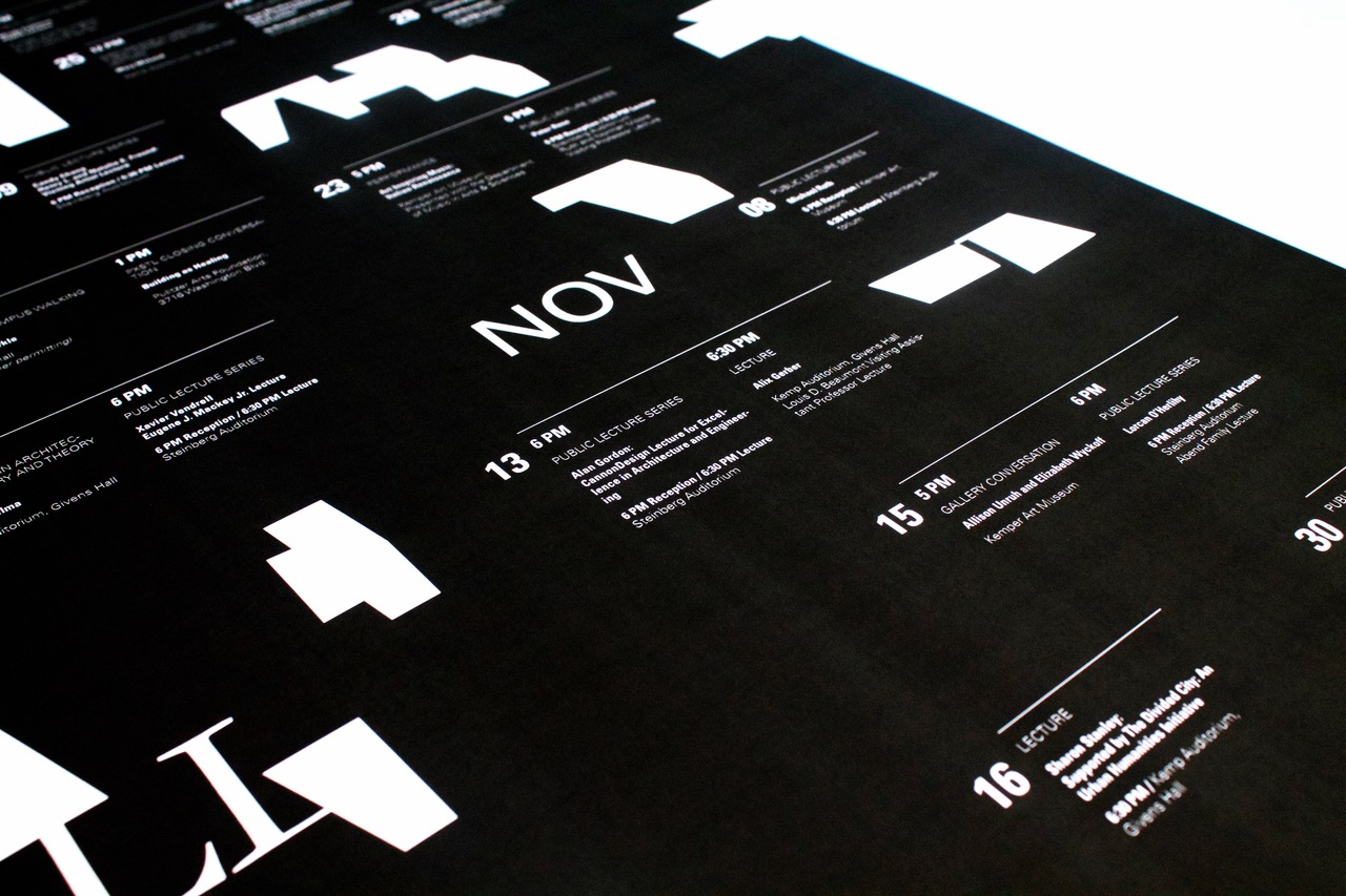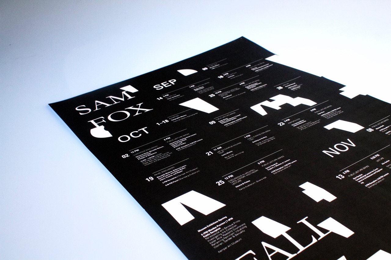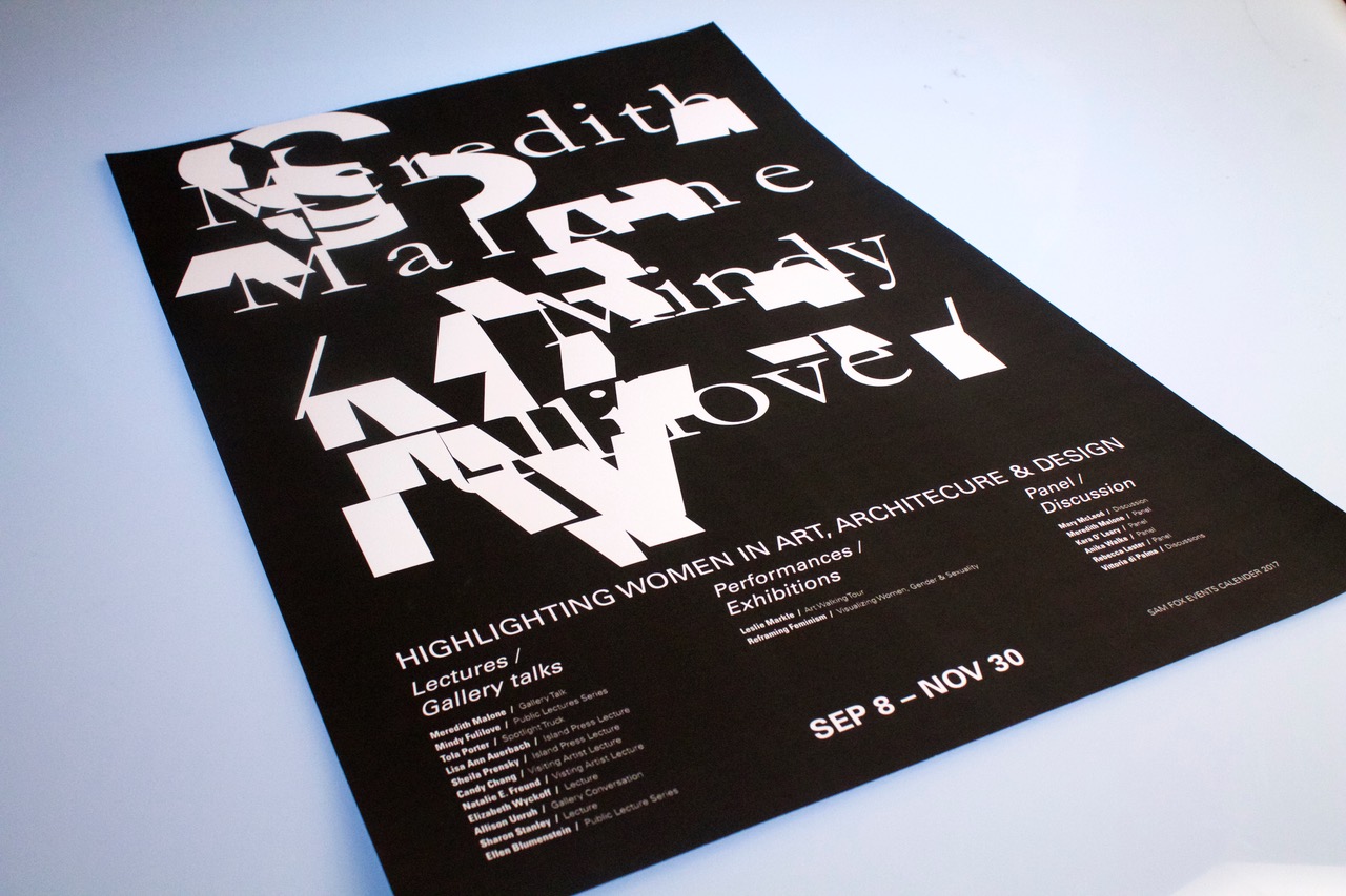 A two-sided event calendar made for the Fall 2017 Semester events for the Sam Fox School of Design & Visual Arts. Starting with the words “Sam Fox”, I created multiple interactions between the created shapes and the names of the female visiting artists.