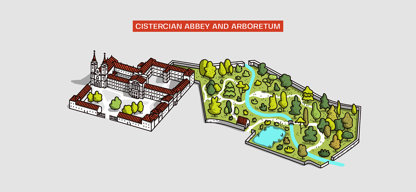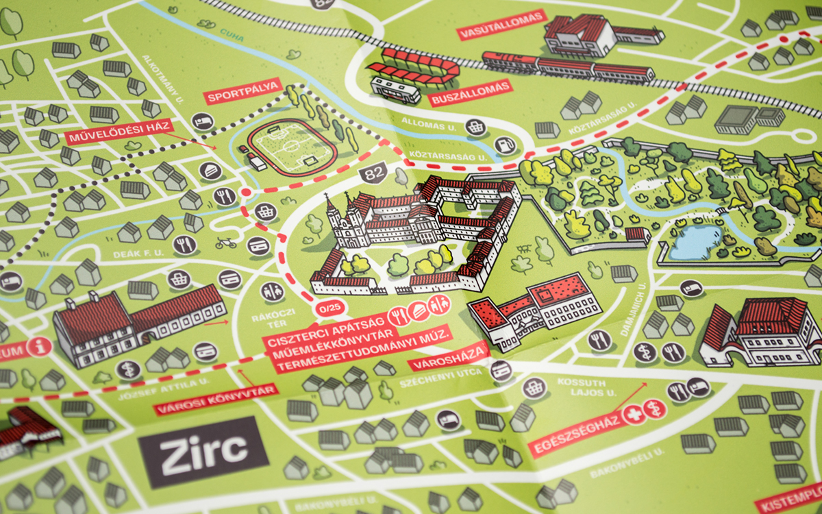 I got the opportunity to draw the illustrated tourist map of Zirc, a small town in a beautiful green region of Hungary. I really enjoyed working on this piece, because Zirc and its surroundings has a lot of interesting spectacles to draw. It was challenging to fit all these buildings and locations on the map, sometimes it took me days to draw one and figure out its right position, but I always find these tasks really exciting and fulfilling. The most complex area to draw was the town center of Zirc, with the mighty building of the Cistercian Abbey and Arboretum.
