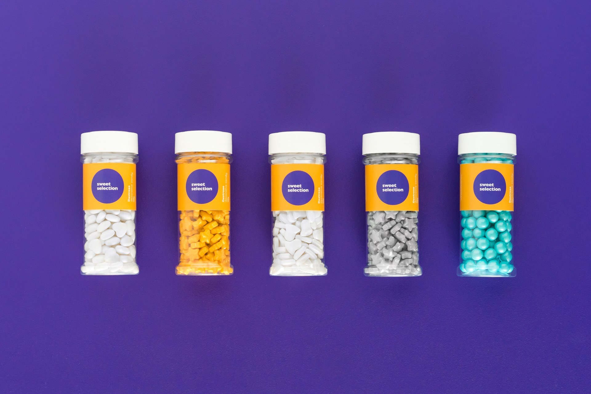 With a range spanning from Bubble-gum Balls and crunchy-shell Choc Drops to vividly colourful Dextrose Decorations, Sweet Selection aims to capture the spirit of celebration at every event. Crisp branding alludes to a sense of culinary mastery, set amongst playful packaging which lets the product shine bright, with striking colours defining each range, and some bold type (logo set in Gill Sans, label text set in GT Walsheim).