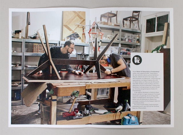Identity and printed materials (image folder with product brochures; flyers) for Rainer & Tobias Kyburz, product and furniture designers. In a tight design collaboration the logo/identity, business card, and basic typographic concept were designed by Nina Stössinger, the printed matter by the Basel-based agency Love Letters. The concept uses Supria Sans throughout, also in the logo. In the mark itself the fat initials were drawn from scratch, while the ampersand is slightly tweaked from Dala Floda.