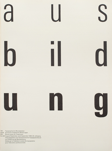 Typographische Monatsblätter 1964 Issue 8/9 Contributed by Stephen Coles on Sep 17th, 2012. Artwork published in 1964. Source: www.tm-research-archive.ch License: All Rights Reserved. “Ausbildung” (education, formation) Typefaces More about UniversGet Univers Formats Magazines/Periodicals (1819) Topics Graphic Design (2964) Designers/Agencies Emil Ruder (3) Tagged withTM magazine (11)Swiss International Style (73)journals (84)Typographische Monatsblätter (12)only type (1255)black and white (1989)type weight gradients (56)mid-word linebreaks (746)all lowercase (870)magazine covers (1358) Artwork location Switzerland (1099) In SetsSelection (Francisco Besa) (125)univers (Sali Alalwani) (9)1 (Rodrigo) (152)GER, AUT, SUI (1900-1989) (Rodrigo) (82) Post a comment Name Email – will not be published Website Your response Submit Comment More Univers in use Aviation and space travel coin sets by Shellc. 1970unknownDanbury MintContributed by Florian Hardwig Cornish Shipwrecks by Richard Larn and Clive Carterc. 1969unknownContributed by Florian Hardwig a–z: Learning through LEGO® and Letterforms poster2025Dafi KühneContributed by Dafi Kühne Staff Pick Sponsor More in Graphic Design Footnotes, issue B2017Mathieu ChristeLa PoliceContributed by Mathieu Christe Staff Pick AIGA identity (2015)2015Kiss Me I’m PolishContributed by Stephen Coles Schriftwechsel T., 2025 edition2025Irene WendlerKlaus-Peter StaudingerMartin TiefenthalerContributed by Florian Hardwig Sam Fox Fall 2017 calendarc. 2017Jee KimContributed by Jee Kim More in Magazines/Periodicals Picture Magazine (1976–81)c. 1976David BossContributed by Stephen Coles Fondata brand identity and first issuec. 2021Aboud+AboudAlan AboudHaley AustinContributed by F37® Sphères Régions magazine 1, “les Basques”c. 2022Théo MillerContributed by Alex Chavot Texas Monthly, “The 50 Best BBQ Joints 2021” web page2021Emily KimbroVictoria MillnerDarice ChaviraContributed by Jamie Otelsberg (OH no Type Co.) Staff Pick More Fonts In Use Font Magazine 006: “Cuba” articleConor MangatPhoto(s) by Stephen Coles on Flickr. Staff Pick Reminiscences of Lenin by N.K. Krupskaya1970unknownContributed by Florian Hardwig Staff Pick Print cover, May/June 19791979Herb LubalinContributed by Stephen Coles Staff Pick Kes French movie posterc. 1970Jouineau BourdugeContributed by Florian Hardwig Staff Pick