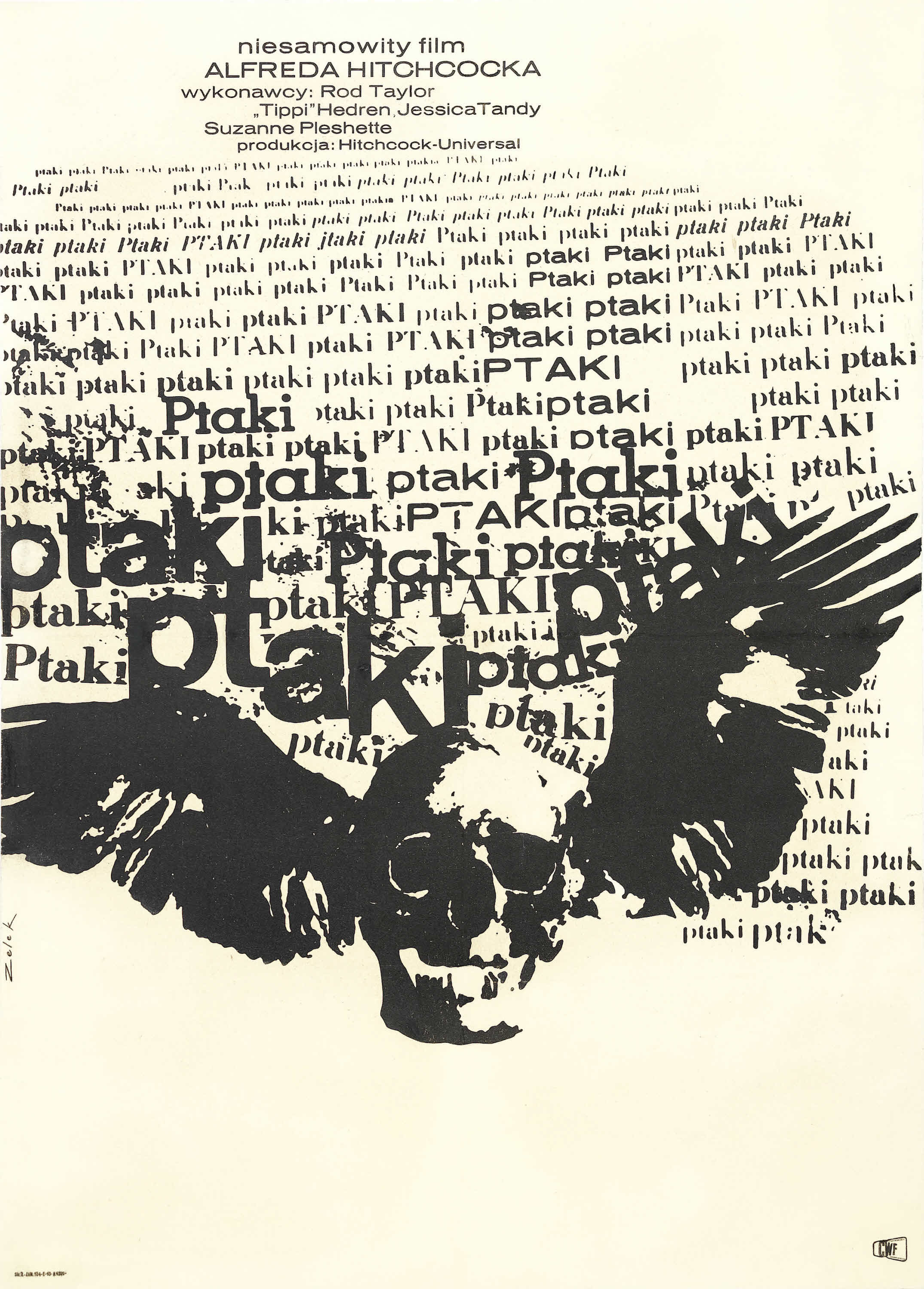 Instead of depicting birds directly, Zelek opted for a winged skull to symbolize the mortal threat. The dead’s head leads a flock of words which repeat the title – ptaki is Polish for birds – countless times. Still small and orderly at the top, the words grow larger, unrulier and more aggressive toward the bottom, in an extraordinary typographic translation of the swelling sound of screeching birds with beating wings.