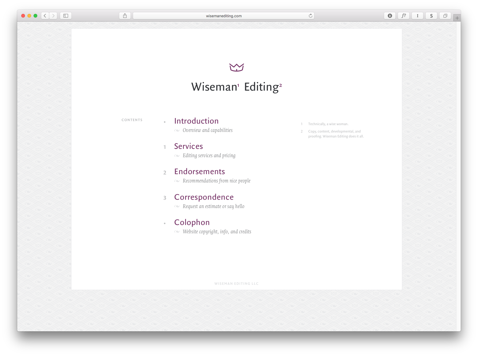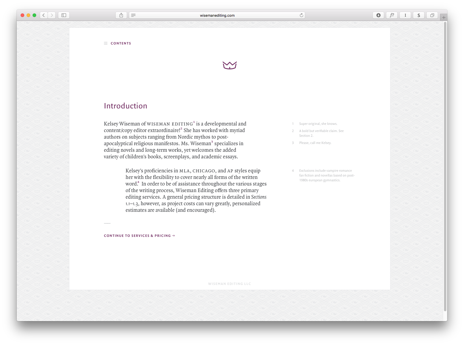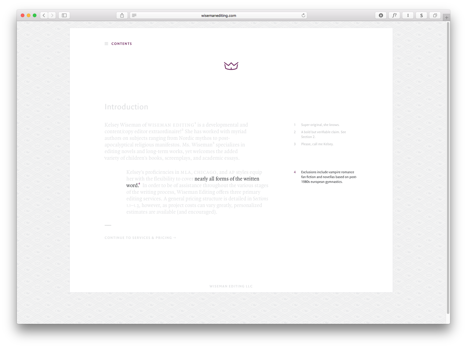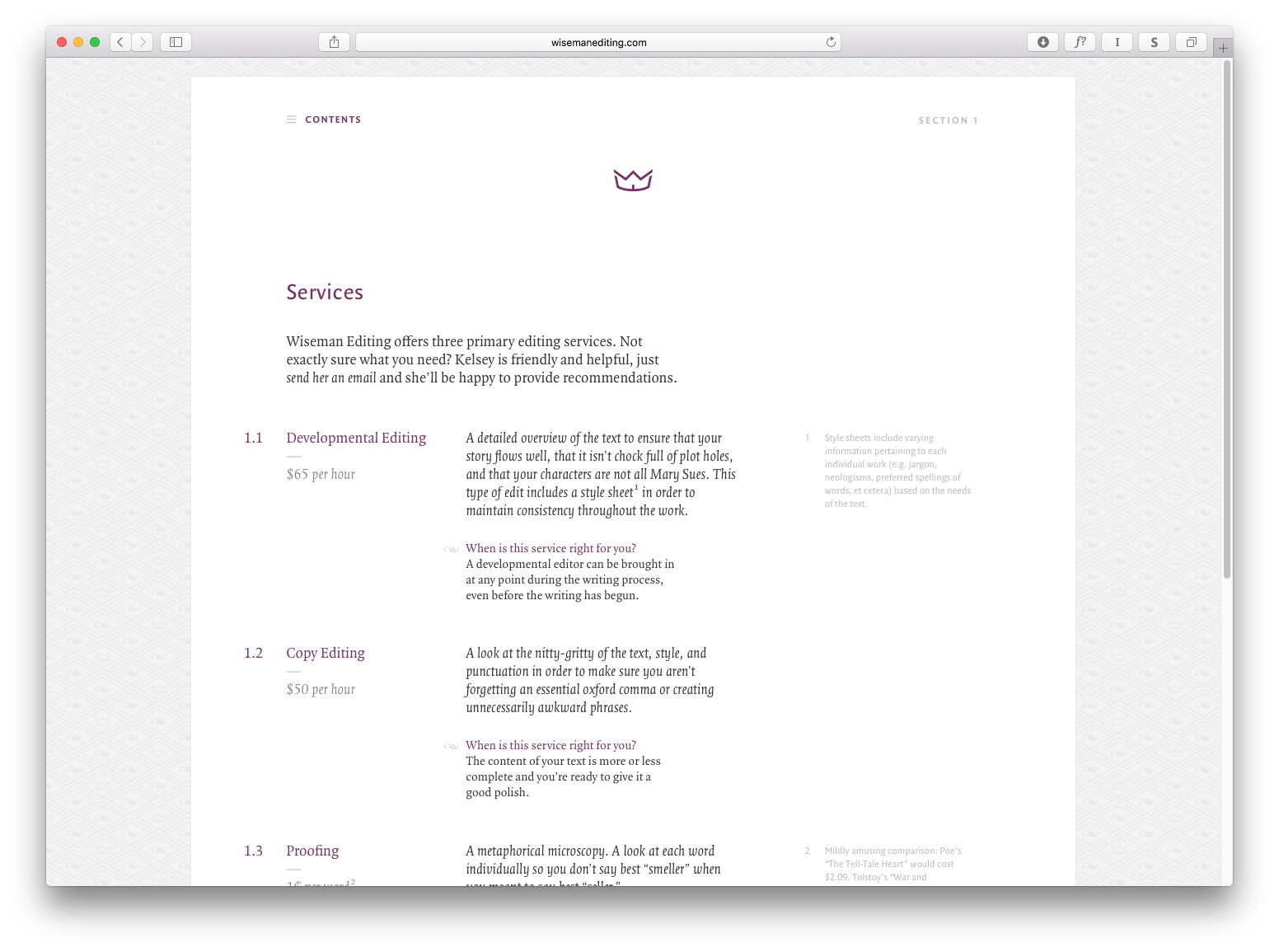 Wisemanediting.com is the website for Kelsey Wiseman’s editing service, featuring a calm mix of Fred Smeijers’ Quadraat (1992) and Quadraat Sans(1997). The hover effects on side-notes and a few other places adds a playful yet restrained touch, echoing the service’s editorial nature.