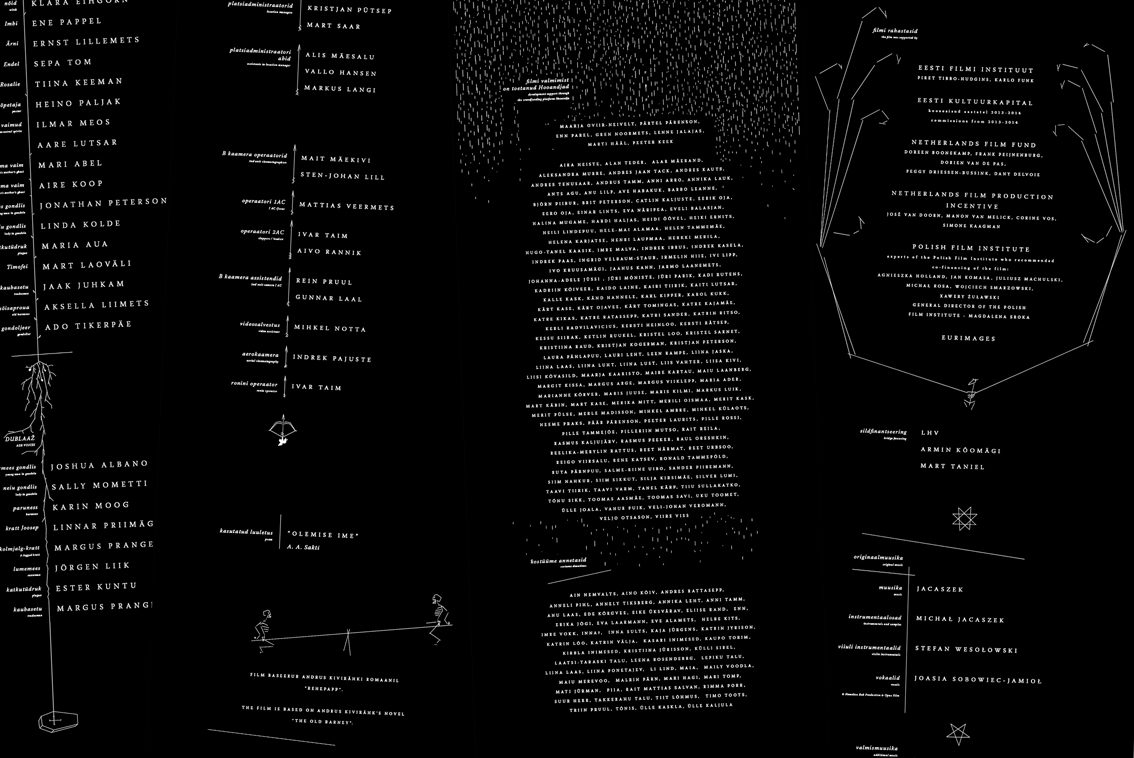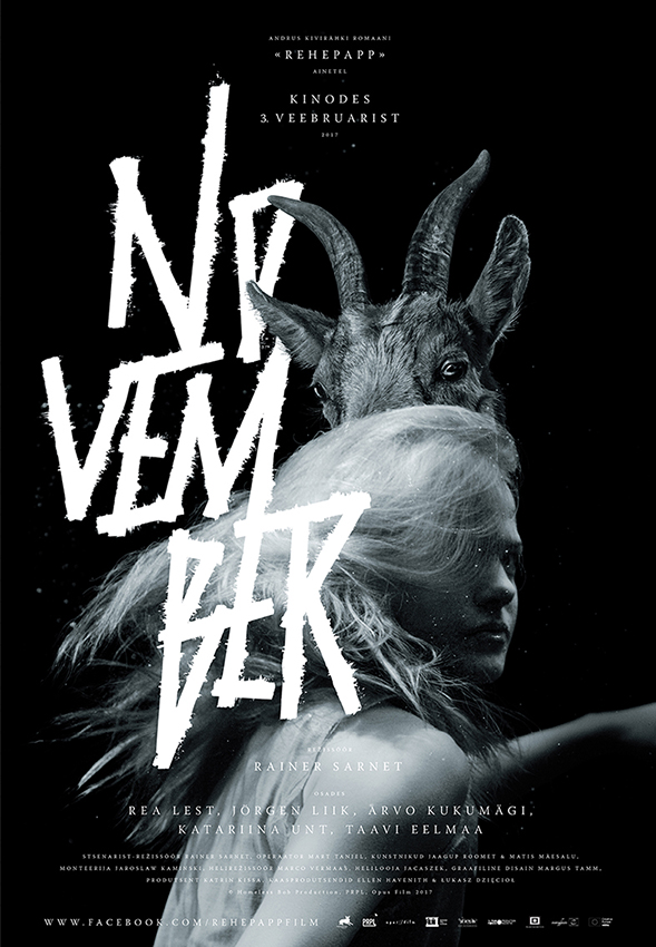 Director Rainer Sarnet’s November conjoins the peasant lore, a gothic love story with a pitch-black social satire. These were the keywords for November’s graphic identity design. As the movie is taken in black-and-white, the print materials follow the similar gamma, adding silver for a more delicate outcome. A “ramshackle” design for a movie title took inspiration from the kratts, scrappy DIY-demons depicted in a movie. More info on IMDb.