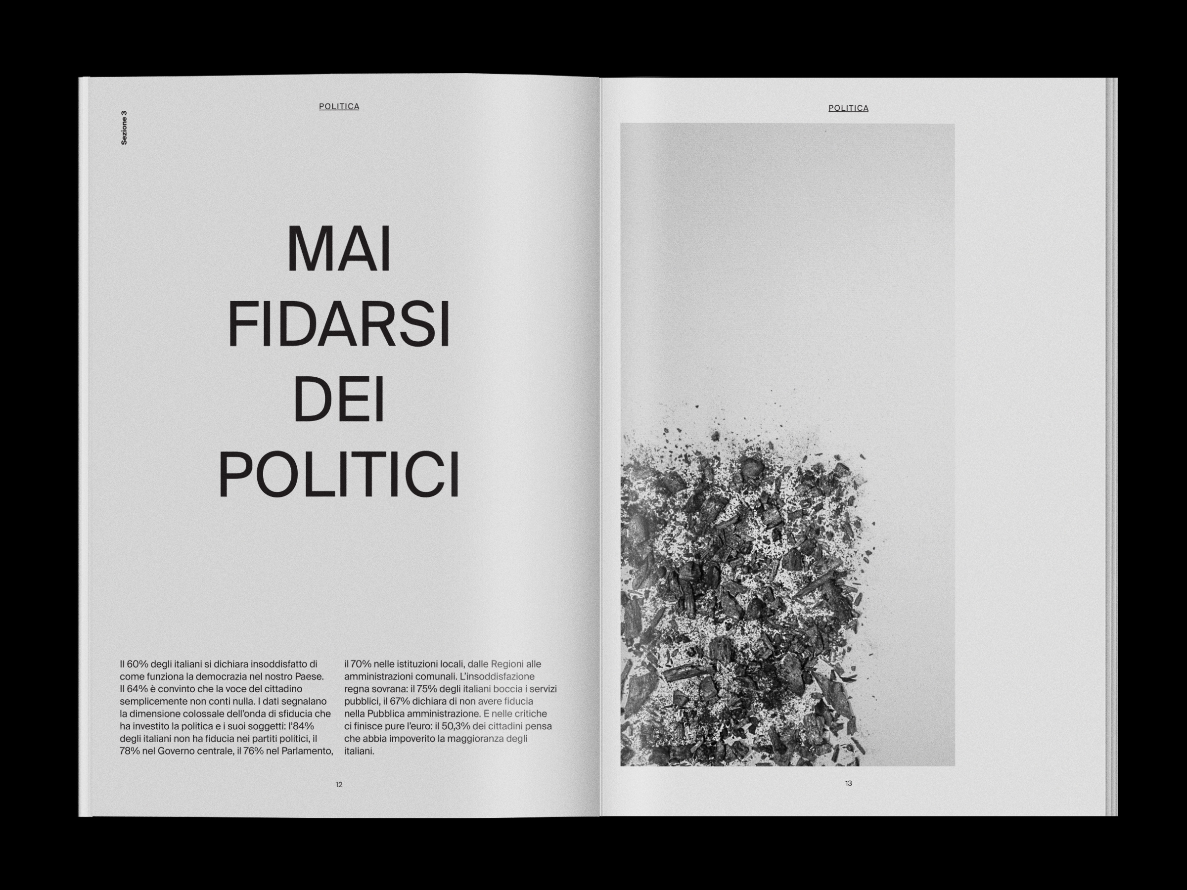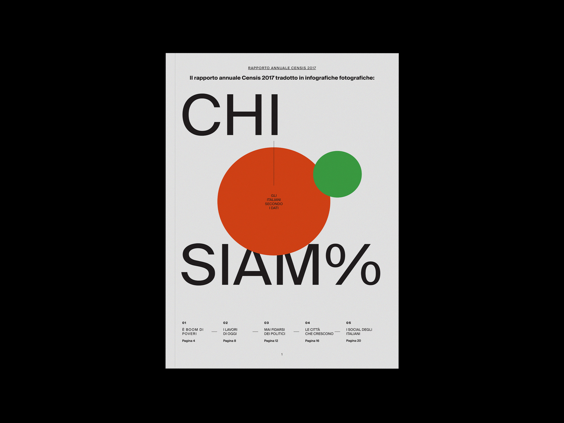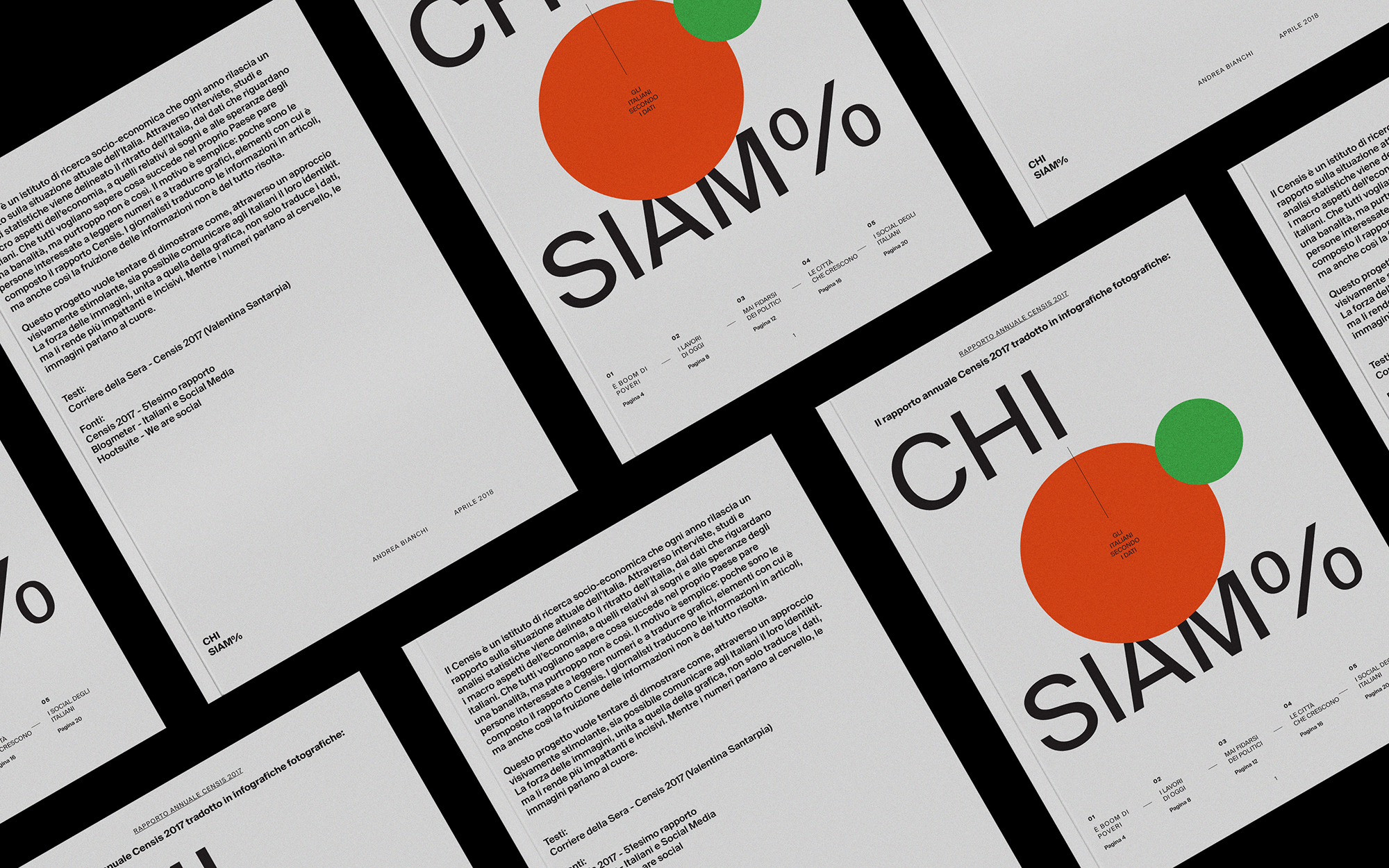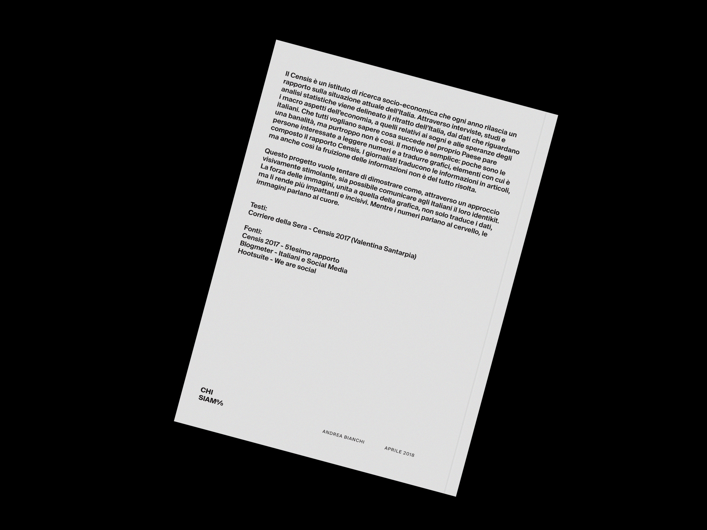 Chi Siam% infographic report Contributed by Andrea Bianchi on May 14th, 2018. Artwork published in April 2018. Source: www.behance.net Andrea Bianchi. License: CC BY-NC-ND. Student project for IED Milan. The aim of this editorial project was to use photographic infographics to translate difficult statistics into images that are understandable for everyone. While numbers speak to the brain, images speak to the heart. Source: www.behance.net Andrea Bianchi. License: CC BY-NC-ND. Source: www.behance.net Andrea Bianchi. License: CC BY-NC-ND. Source: www.behance.net Andrea Bianchi. License: CC BY-NC-ND. Source: www.behance.net Andrea Bianchi. License: CC BY-NC-ND. Source: www.behance.net Andrea Bianchi. License: CC BY-NC-ND. Source: www.behance.net Andrea Bianchi. License: CC BY-NC-ND. Source: www.behance.net Andrea Bianchi. License: CC BY-NC-ND. Source: www.behance.net Andrea Bianchi. License: CC BY-NC-ND. Source: www.behance.net Andrea Bianchi. License: CC BY-NC-ND. Typefaces More about Suisse Int’lGet Suisse Int’l Formats Magazines/Periodicals (1849) Infographics/Maps (563) Topics Graphic Design (3028) Designers/Agencies Andrea Bianchi (4) Tagged withstudent works (776)fictional (251)IED Milan (5)infographics (293)contrasting sizes (674)one typeface family (1695) Artwork location Italy (983) Milano (298) In Setsliterature (Nazhira Maulida) (22)revista (Carlos VargasCesa) (42)smooth (Karo Konieczna) (522)eBook (Bernardo Sande) (10)B&W (Justin Brown) (93) Post a comment Name Email – will not be published Website Your response Submit Comment More Suisse Int’l in use CUBS magazine, Nº0c. 201934 studioDavid RobayoCaroline RacoupeauContributed by David Robayo Ambient issue 10220120.10 Büro Ivan IlicContributed by Ivan Ilic Evol/Love by Robin Waart2020Vilmantas ŽumbysContributed by Vilmantas Žumbys Sponsor More in Graphic Design Sinking Stone – Cristiano Volkc. 2019Federico BarbonContributed by Federico Barbon Redesign Arabia2011Mohammad SabbghContributed by Stephen Coles Staff Pick Valiz’s PLURAL book series2020Lotte Lara SchröderContributed by Stephen Coles Staff Pick It does no harm to wonder / The body of the work2020Jo BaileyAnna BrownContributed by Jo Bailey More in Magazines/Periodicals Playboy France, 2018 redesign2018République StudioContributed by République Studio NOIA magazine, issue 01: “Radical Actions”2022Lorenzo BigattiContributed by Lorenzo Bigatti Food magazine2013Noel AvendañoContributed by Darden Studio Tracks magazine covers, 20202020TracksContributed by Andy Hoffman More Fonts In Use Bowler2024Studio 024Contributed by Production Type Staff Pick Open House Roma 20232023MistakerContributed by Riccardo Casinelli Staff Pick Kill la Kill2013Masashi IchifuruContributed by Peiran Tan Staff Pick Atelier du 9 Bis2018Léa ChaponContributed by Thomas Néel Staff Pick