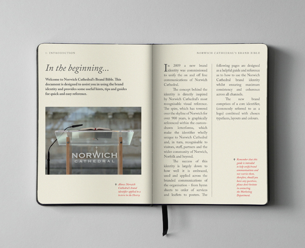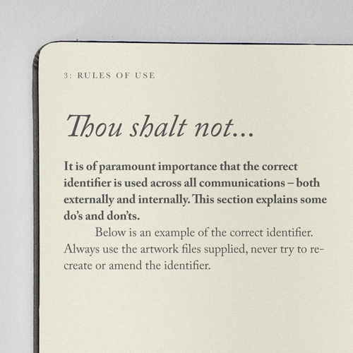 Interesting take on a brand guide, though the quarter column captions seem a bit awkward when used underneath the half column of copy, but maybe that’s just me.